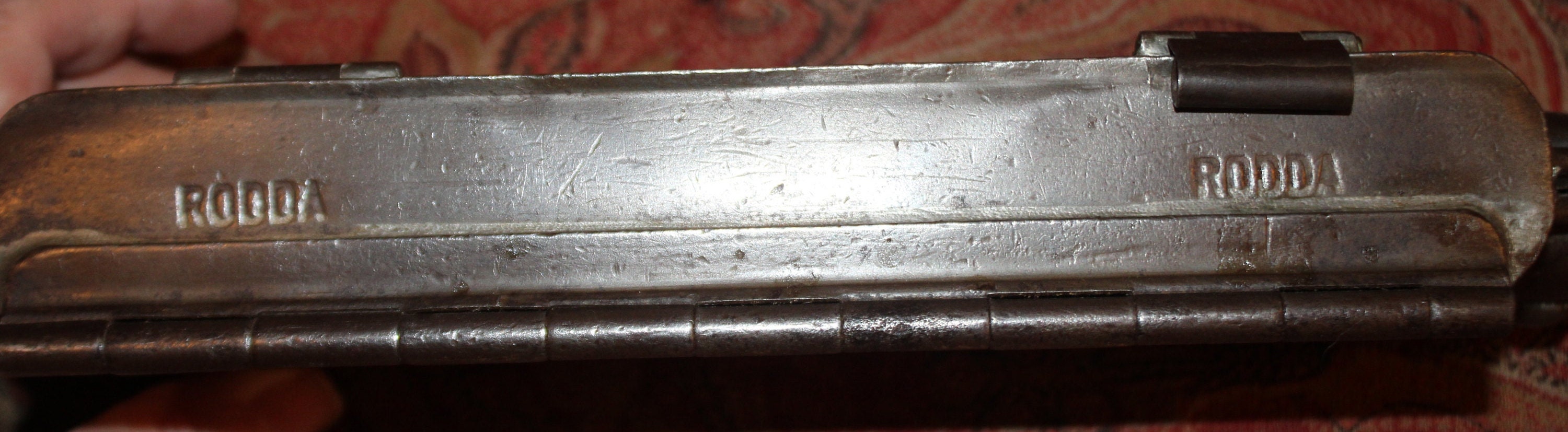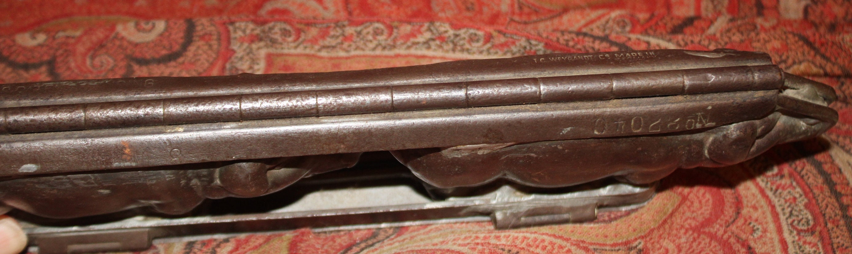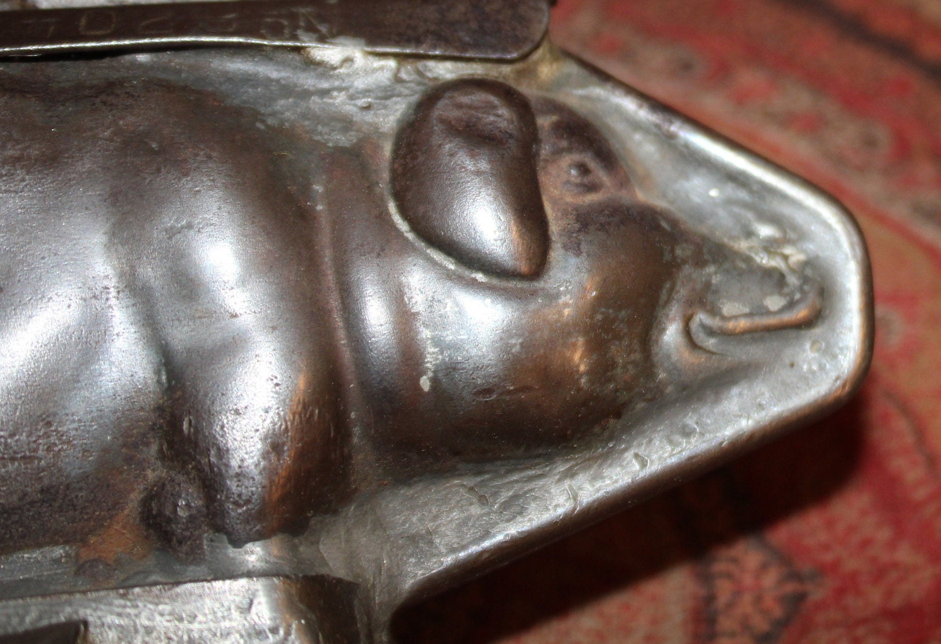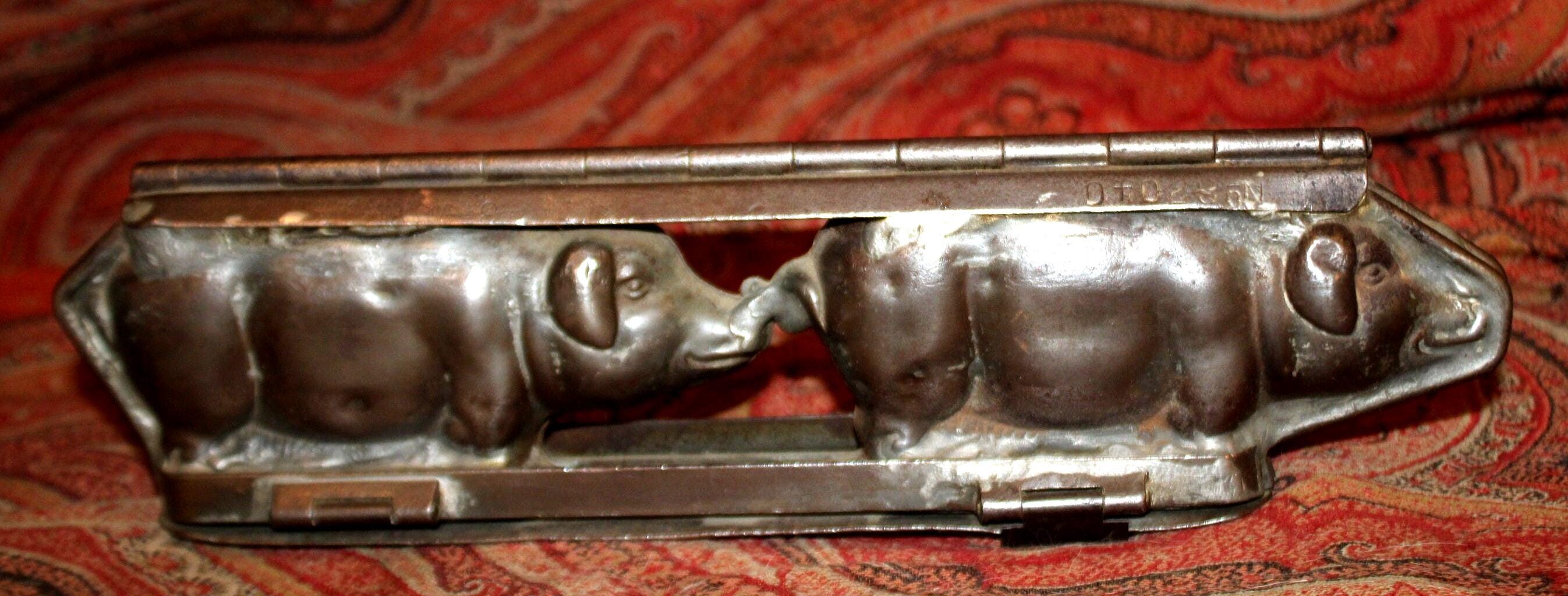 A very nice antique Anton Reiche 2 Pig- Weygandt Chocolate mould is available! Heavy!! Stamped Anton Reiche T.C. Weygandt Co. Made in Germany. U.S. Patent Pending No. 27040 (very hard to discern first number). Approximately 3.5" tall x 12" long x 2" wide. It has a wonderful old patina and is in great condition considering its age. One of the clamps is sheared which can be seen in photos. Please message us with any questions. Thank you for looking!
