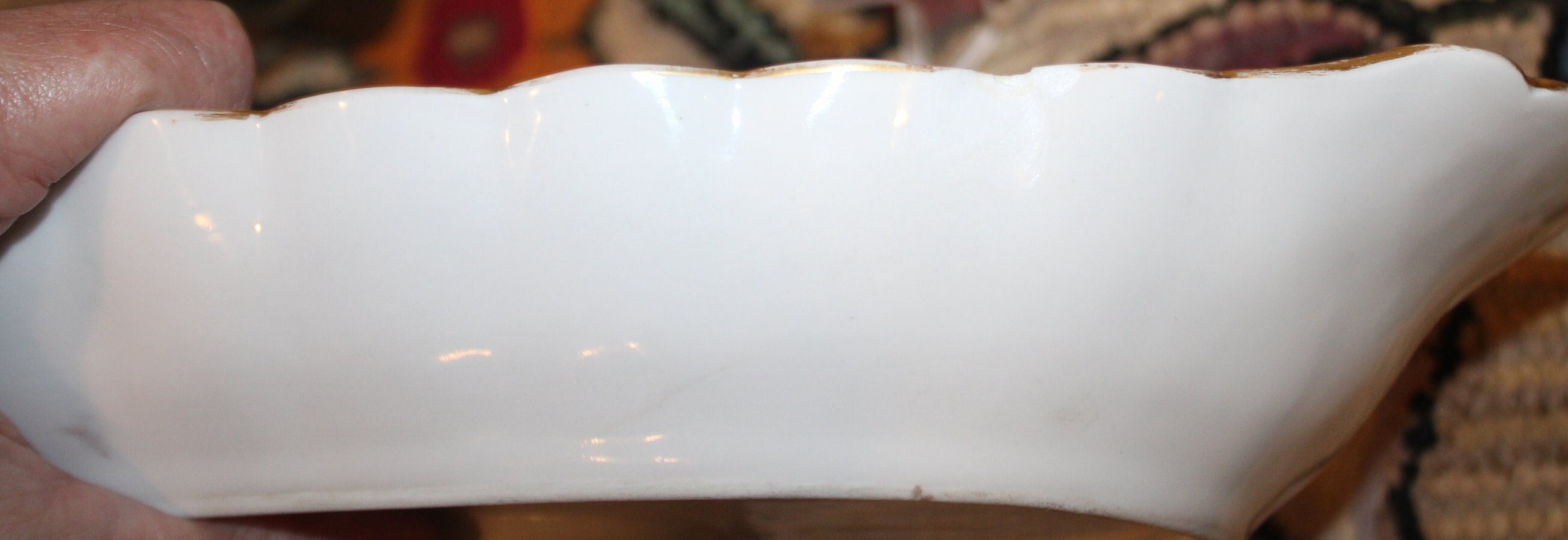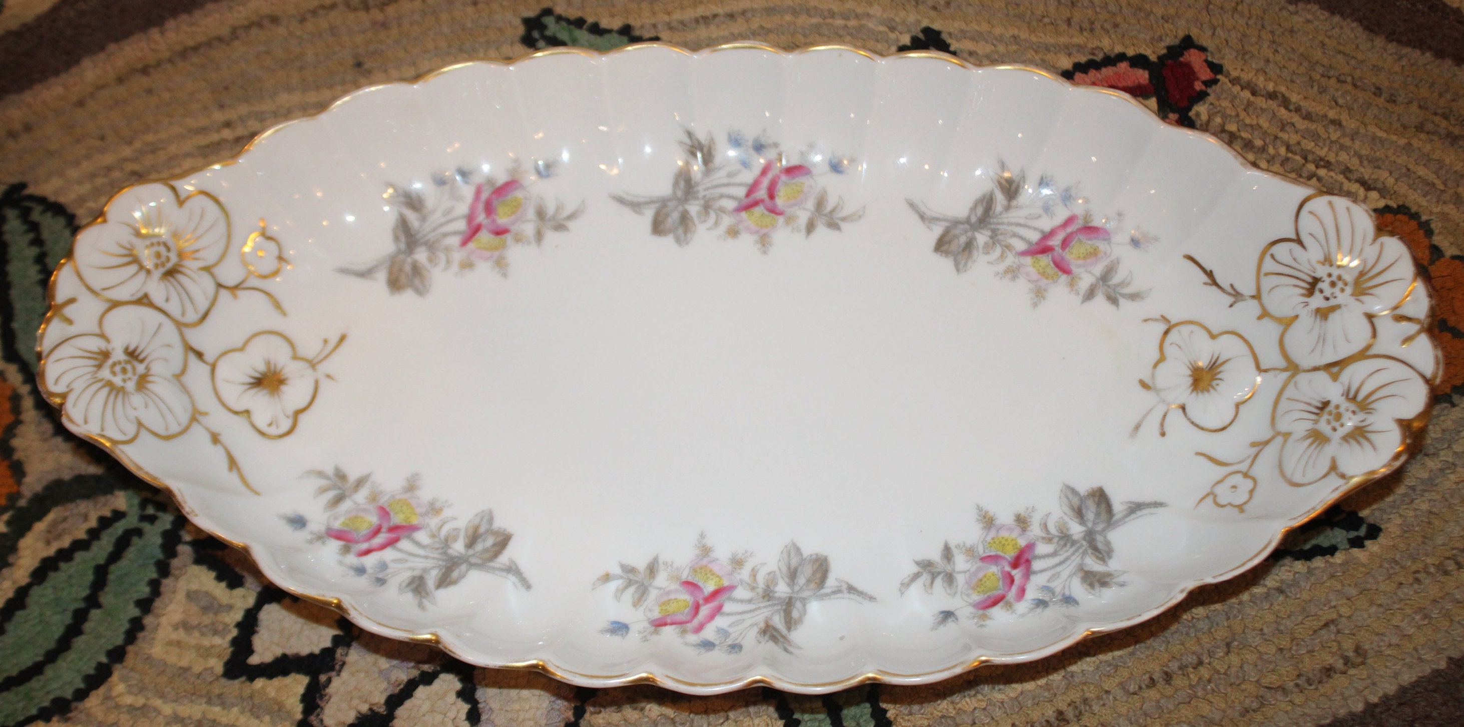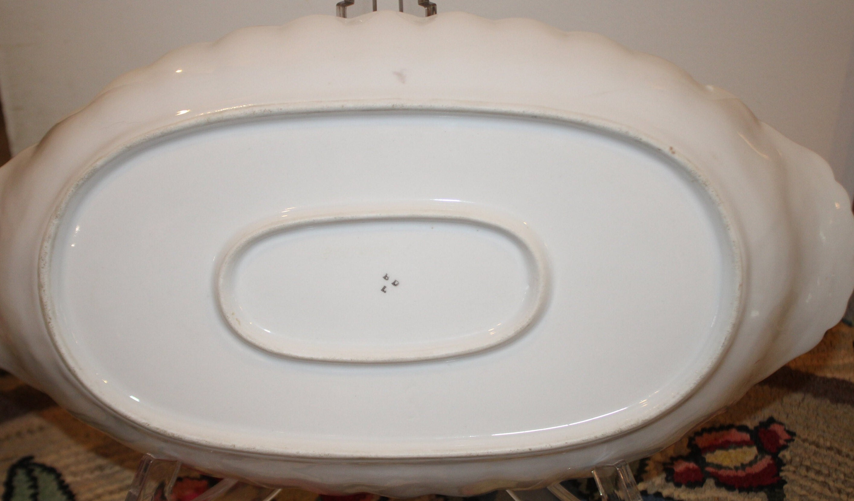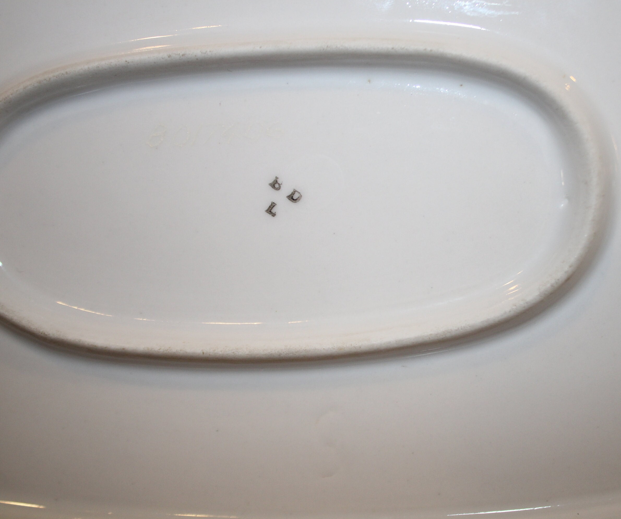 This beautiful Limoge Vegetable Dish decorated with gold gilt and floral bouquets is available to you. It is marked BD/L on the underside (see photo); it also is marked with an incised 8 and the #B017406 which is impossible to photograph. It has a large (.5") chip to the underside edge (photos 5,6,and 7). This dish is 15.75" x 8.25" x 1.75". Although it is chipped- it is still a beautiful serving dish. Thank you for looking- please message us if you have any questions!