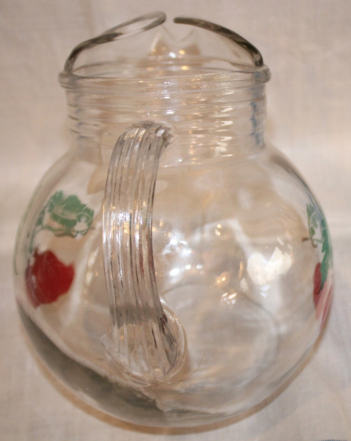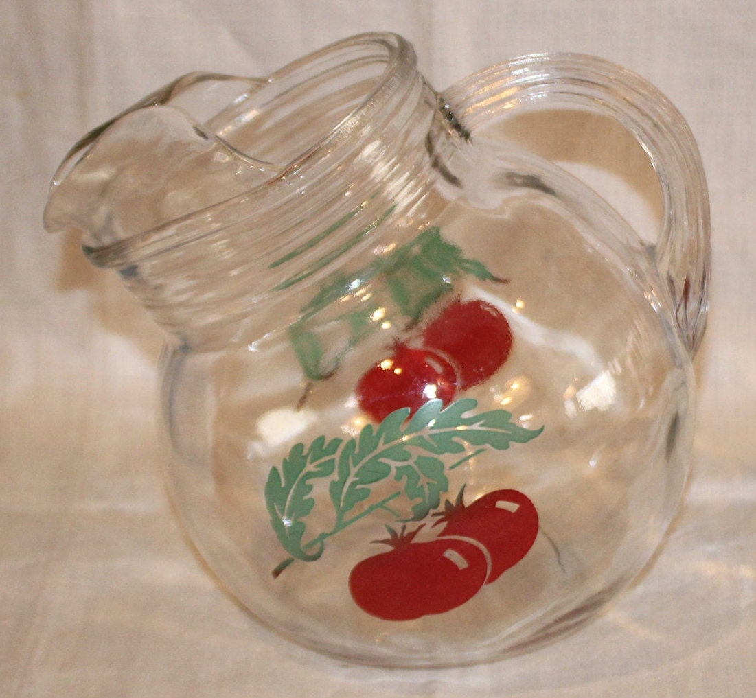This Very Cute Vintage Tomato Juice Pitcher is available! We, as children, used to love drinking our tomato juice staring at the pitcher design! The pitcher is approximately 7" tall x 7" wide (including the handle) and holds approximately 4 cups of liquid. There are no chips or cracks; the graphics are in great condition. Please message us if you have any questions- Thanks for looking!