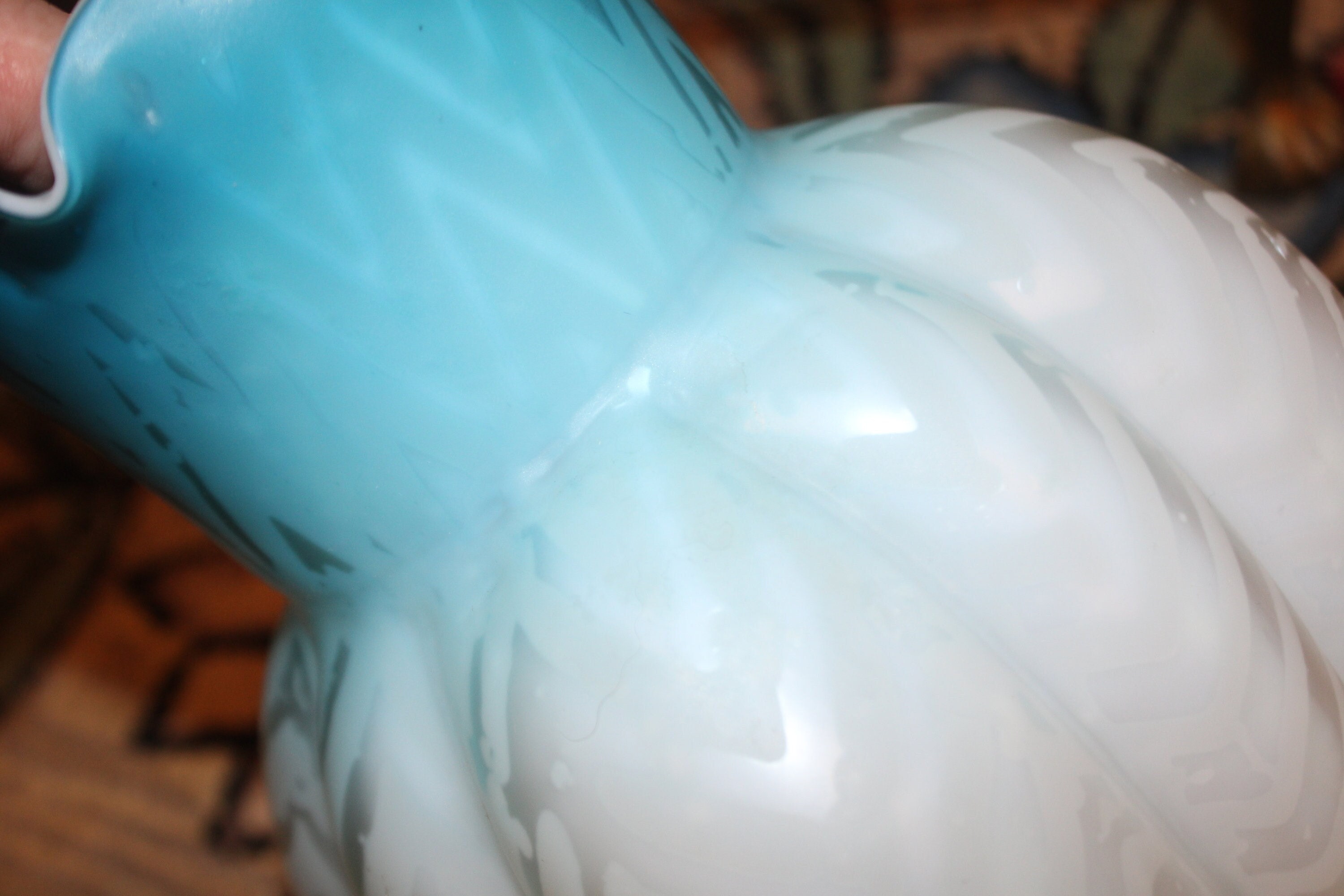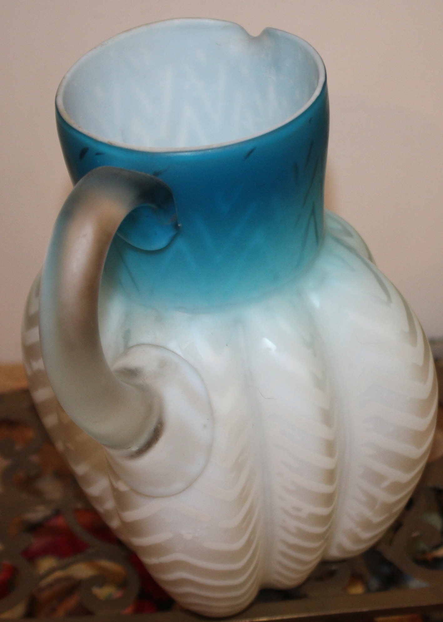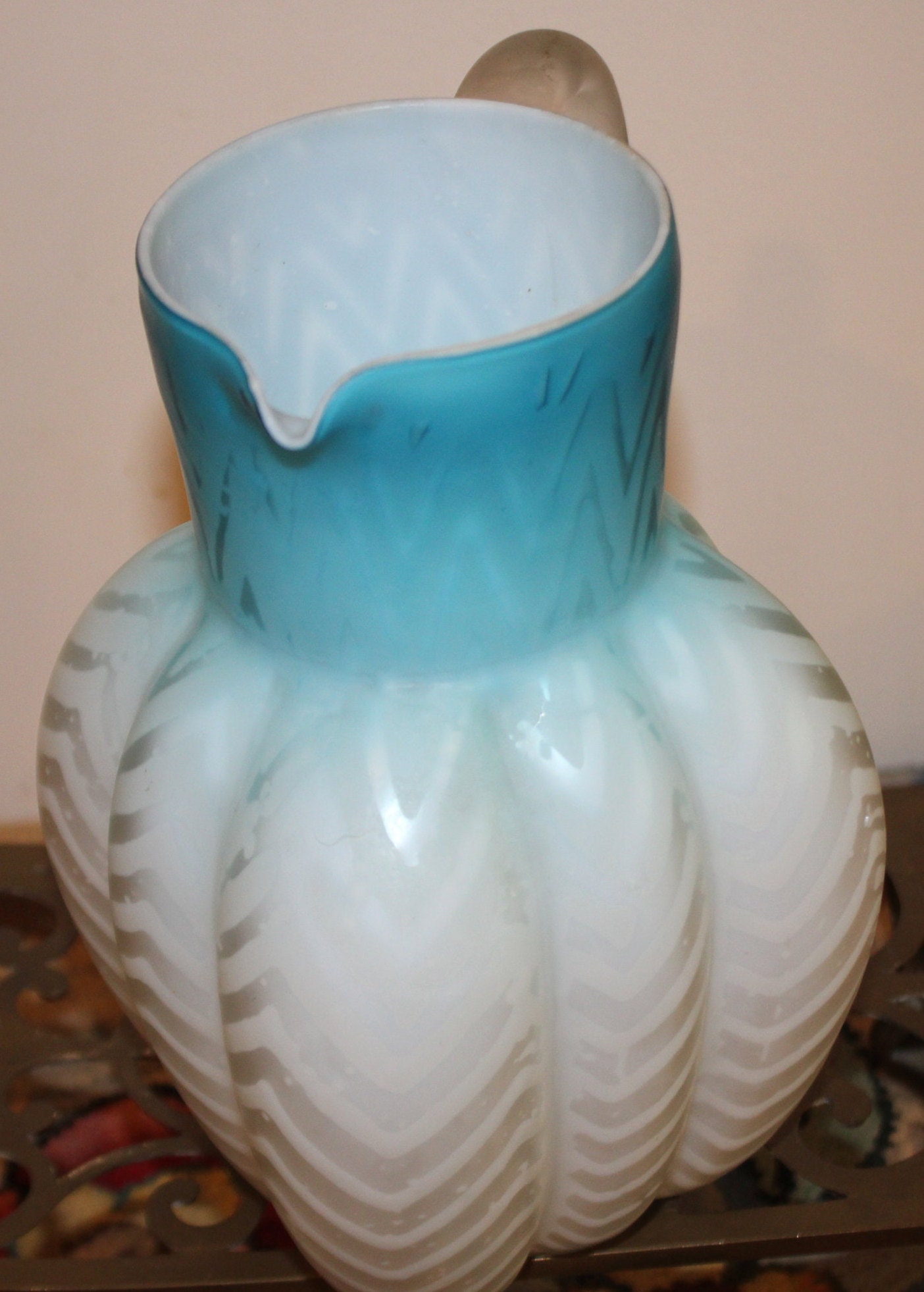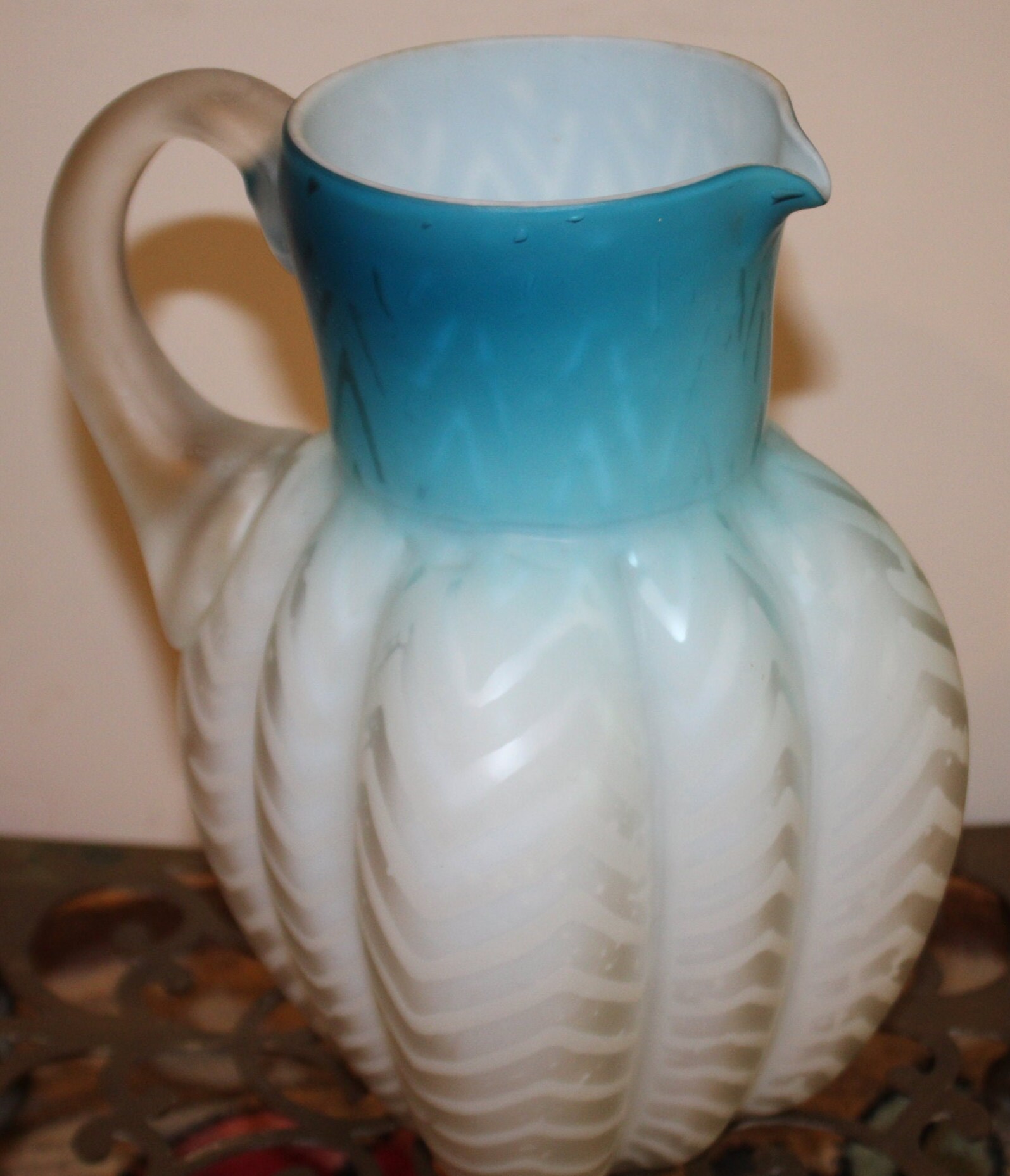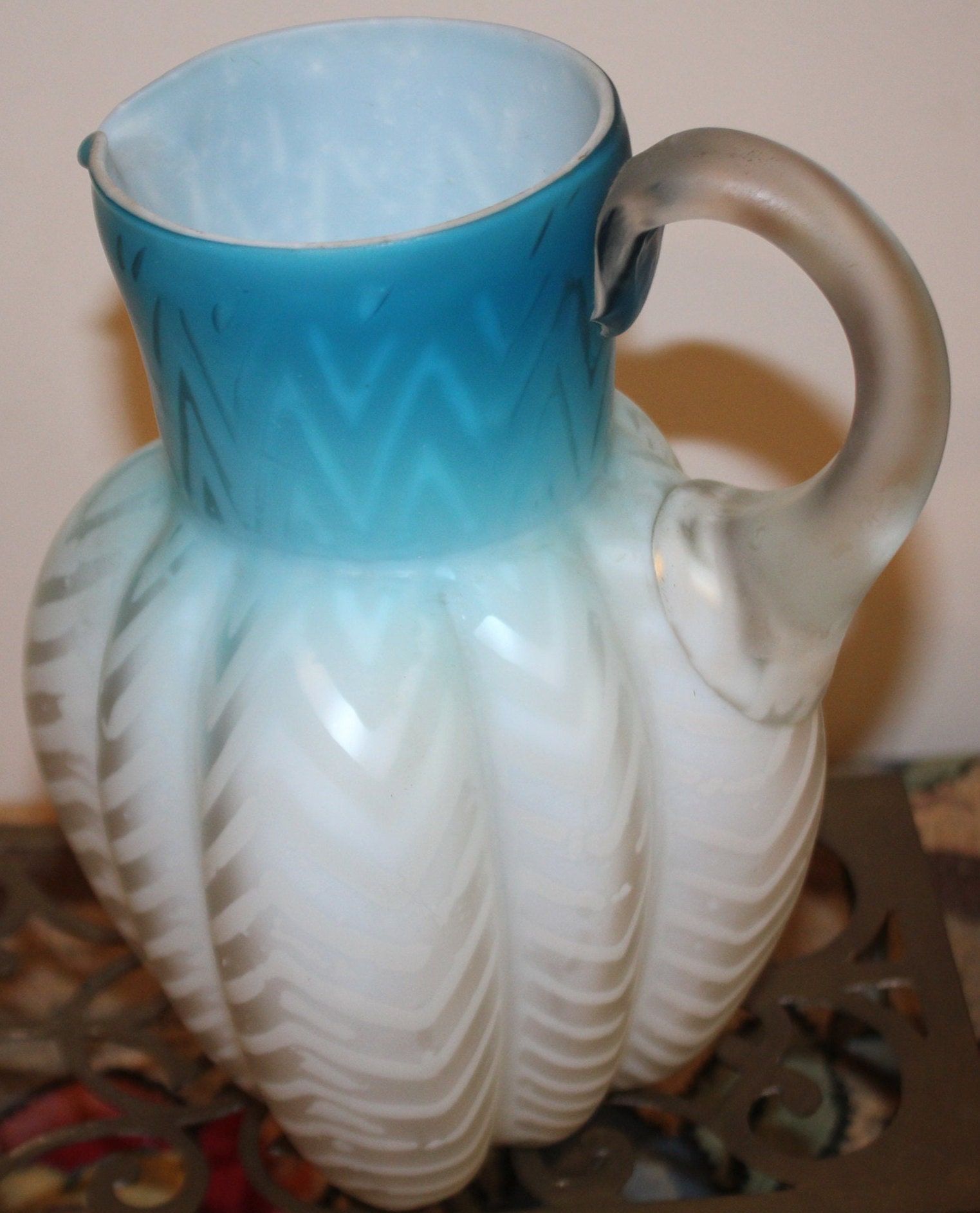 Antique Fenton Blue Satin Glass Water Pitcher, Zig Zag Design