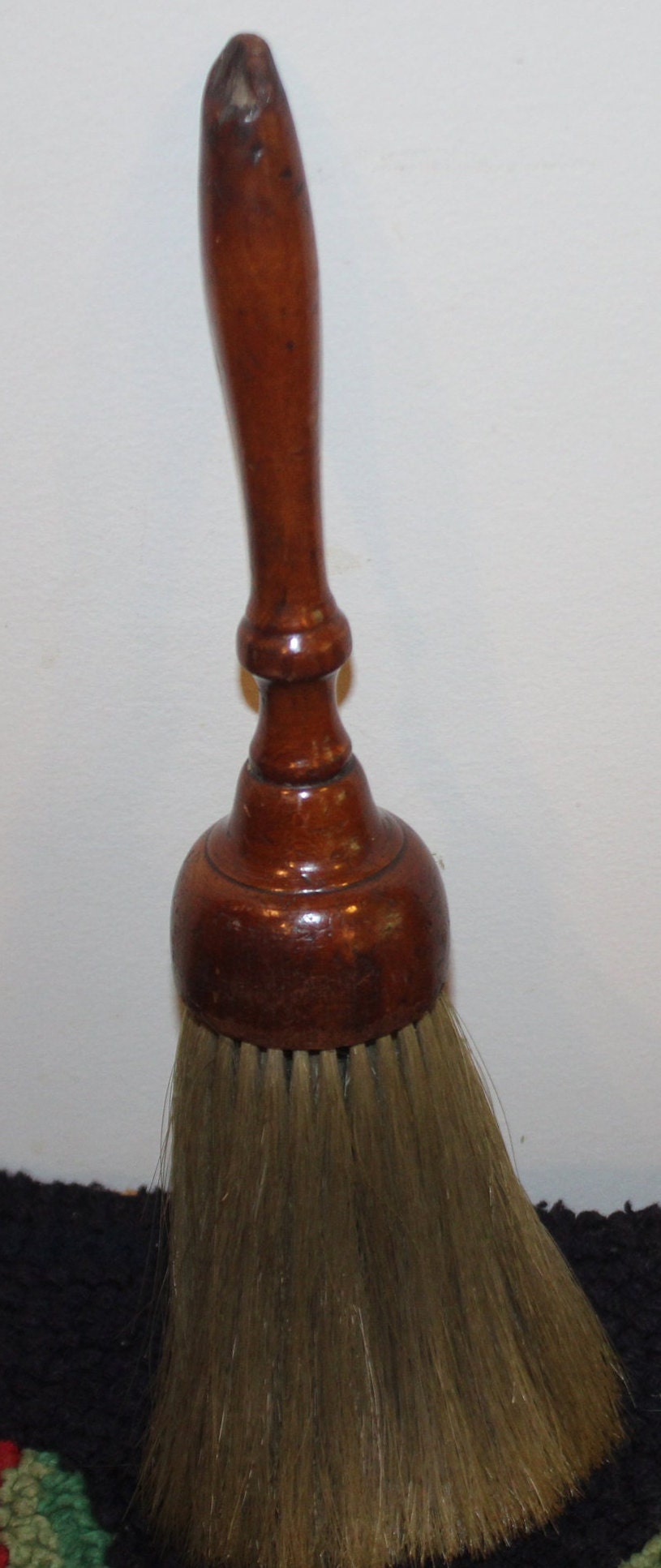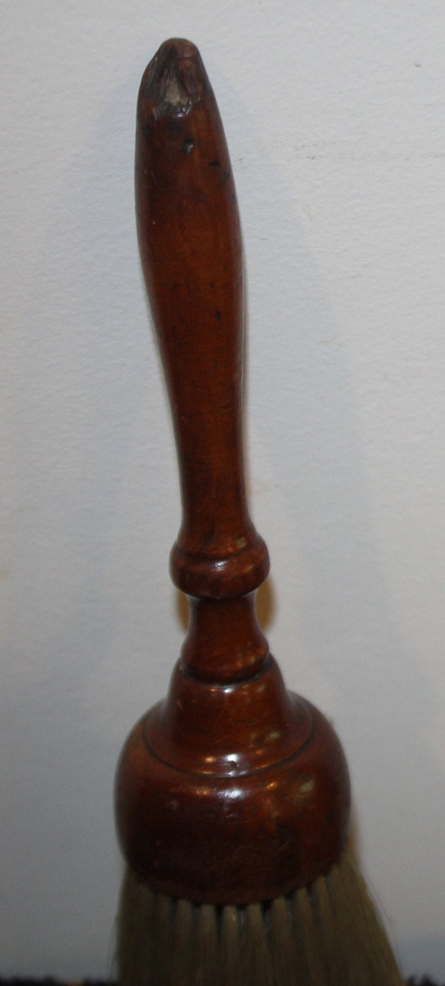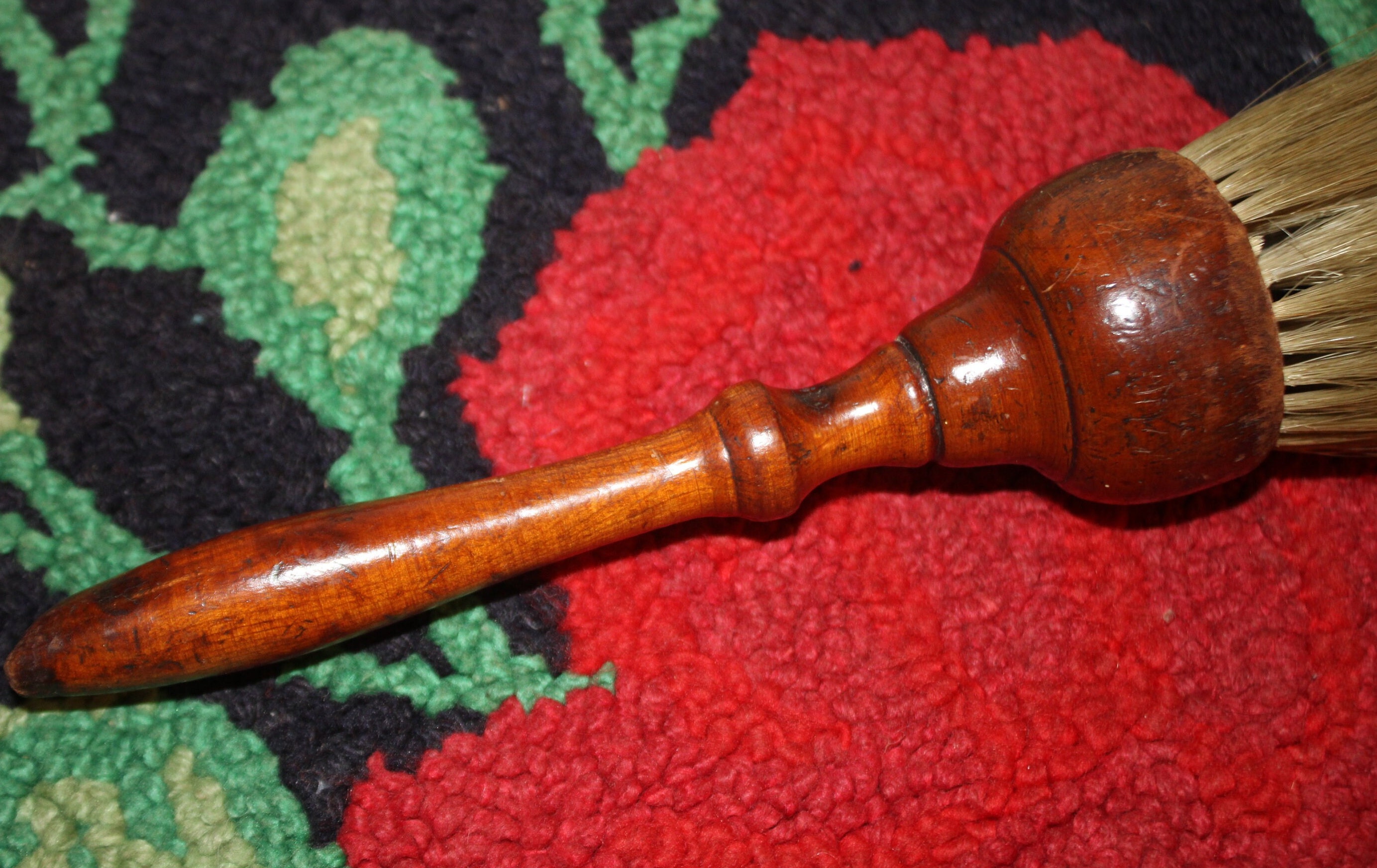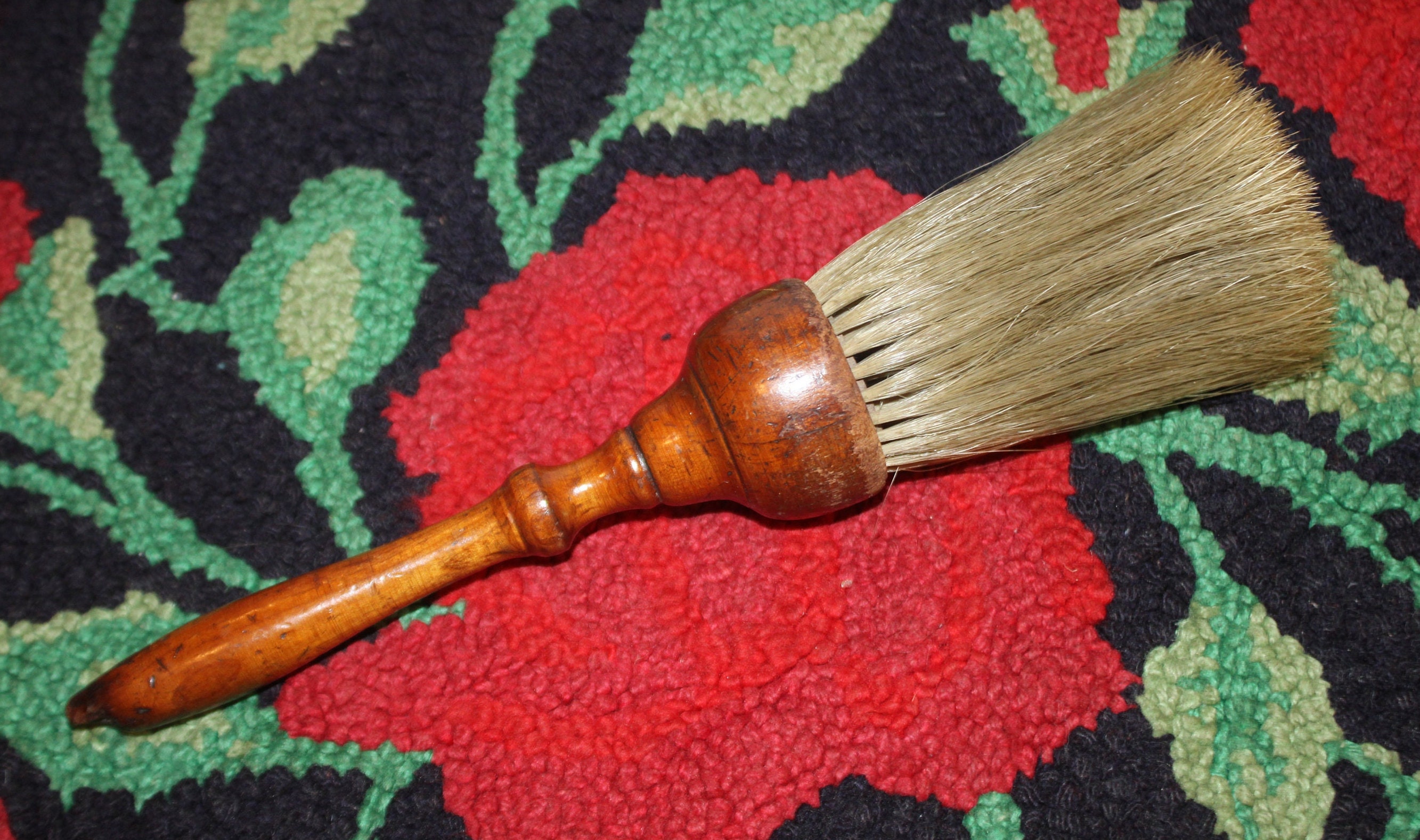 This Wonderful Antique Wooden Horse hair Barber/Dusting Brush- circa 1850- would look great with your early American collection! The hand turned wooden shellac handle is 7" in length; the blonde horse hair bristles are 4"long x 3" in diameter. The total length of the brush is 11.25". The handle has appropriate wear for its age- there is one bristle missing which can be seen in the fourth photo; there is age old damage to the tip of the wooden handle which can also be seen in the photos. We believe this piece is shaker. Please message us if you have any questions- Thank you for looking!