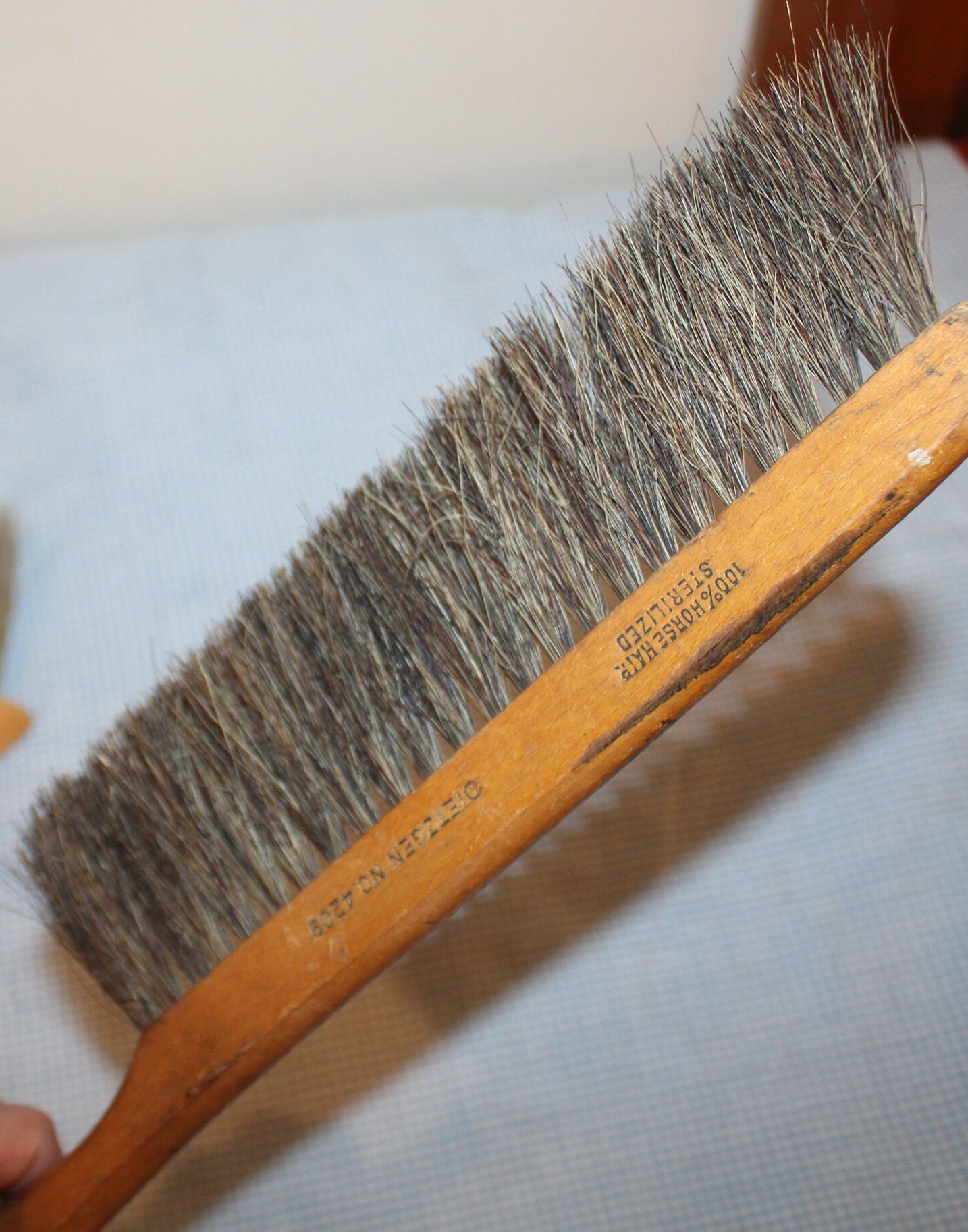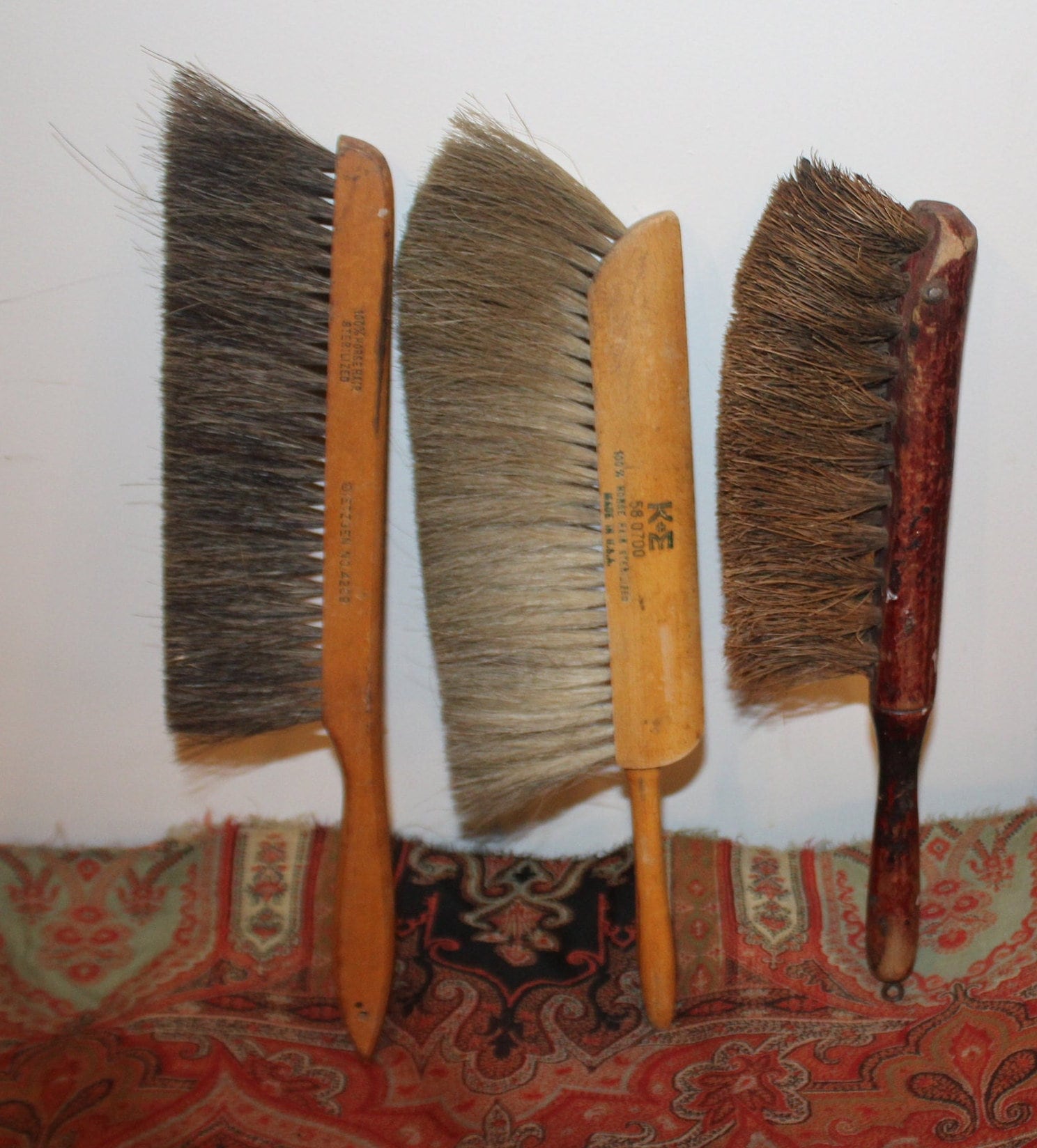 These 3 Vintage Country Farmhouse Decor Horsehair Drafting/Clothing/Dusting Brushes are available for your consideration! All 3 have horsehair bristles. There is a K+E (Keuffel & Esser) #580700; a Dietzgen No. 4209; and another with remnants of red paint on the handle. The length is approximately 13-14". They have a great look and would be a great addition to your farm house country decor! Thanks for looking- feel free to message us if you have any questions!