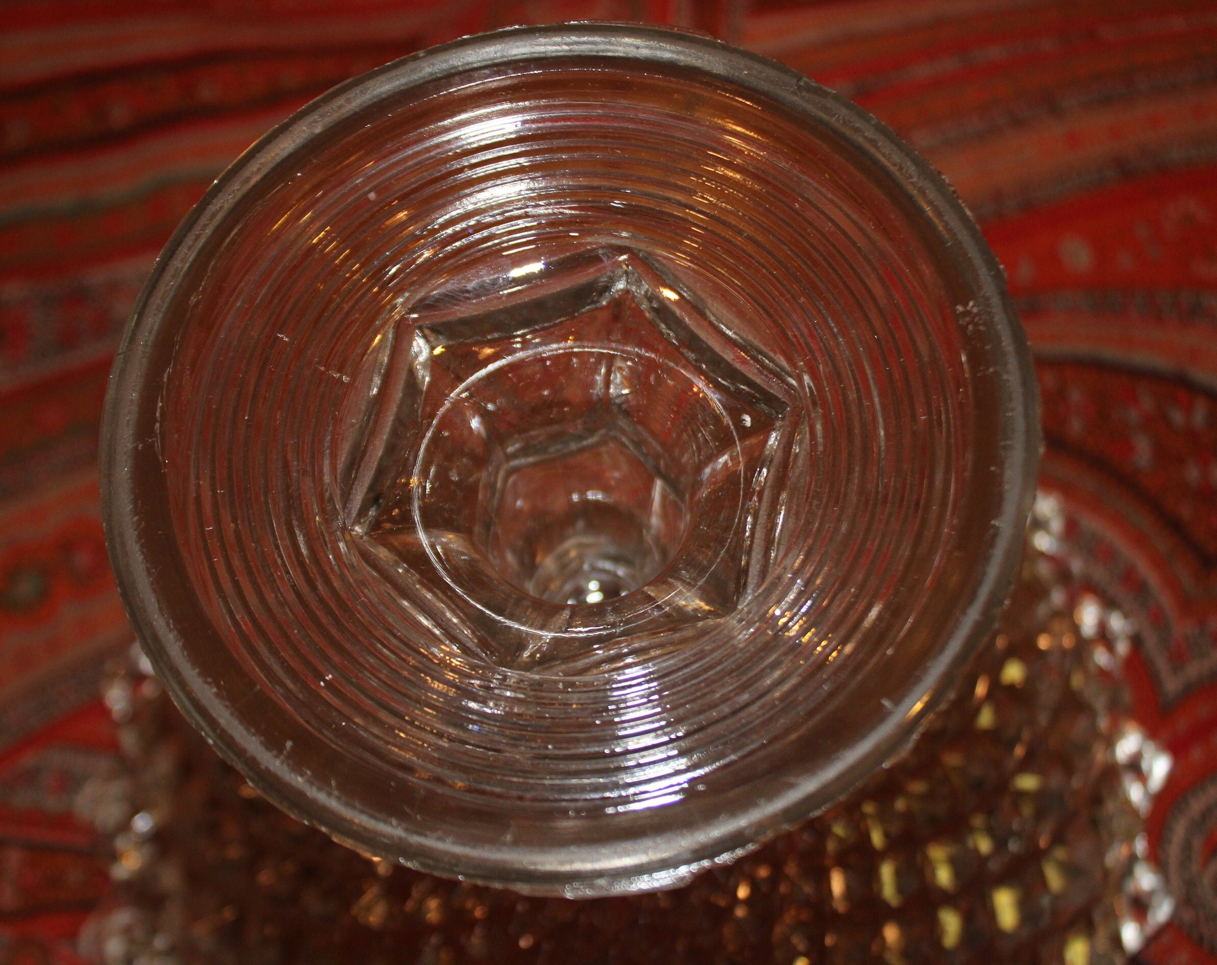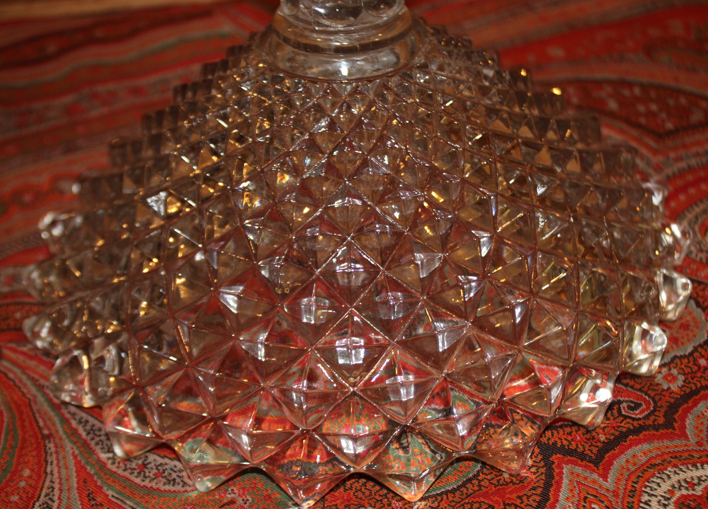 This unmarked Antique Saw tooth EAPG (early american pattern glass) Diamond Motif Compote- circa 1900's-would be a wonderful addition to your holiday table! Use it as a centerpiece to display fruits and foliage- it stands 8" in height and is 9" in diameter; the depth of the compote is 4". It is very heavy and has a diamond motif with concentric circles encompassing the base- it has a beautiful sound when dinged. There are no chips or cracks- there are some minor flea bites on the bottom of the base which are reflective of age. Please message us if you have any questions- Thanks for looking!