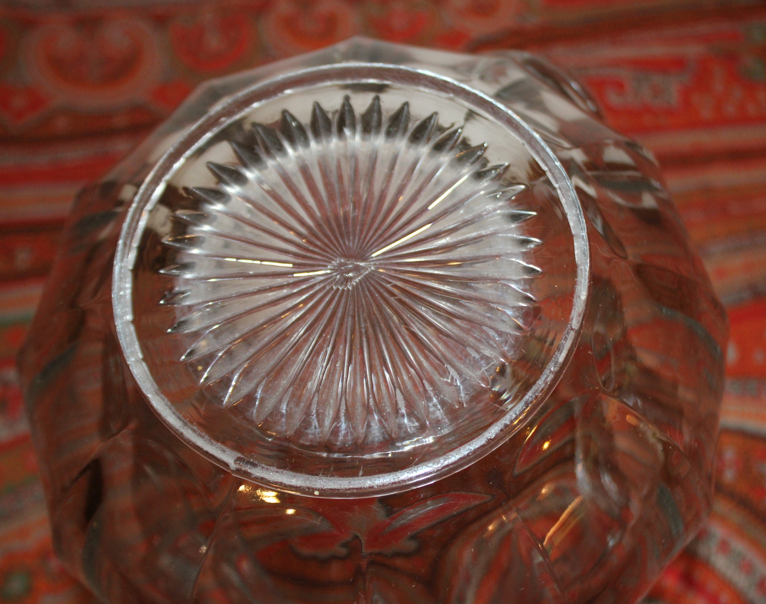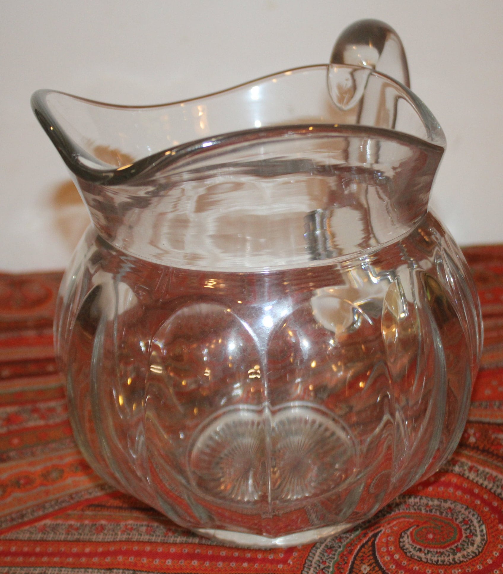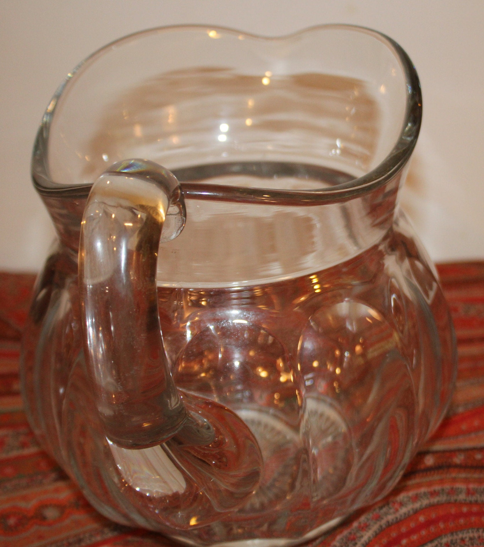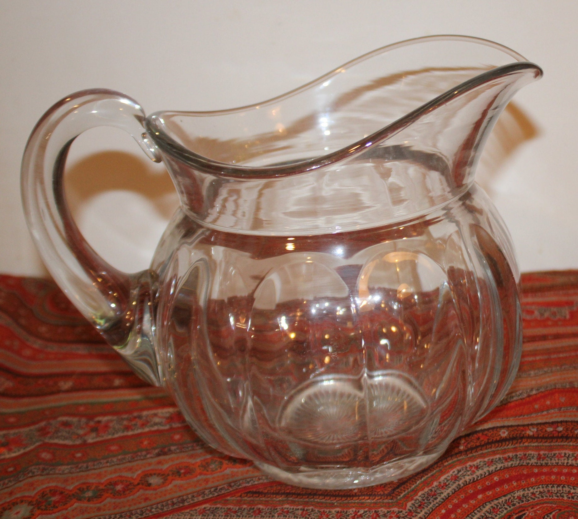 This Heisey Colonial Pattern Crystal Clear Pitcher from the 1930's is beautiful as well as functional. It is 7.5" tall x 10" wide from spout to handle; and holds 8 cups or .5 gallons of liquid. The base has a Heisey star pattern and the sides are elegantly ribbed. A Gorgeous example with no chips or cracks; it would be a lovely pitcher to serve beer, lemonade, or sangria from! Please message us with any questions- Thanks for looking!