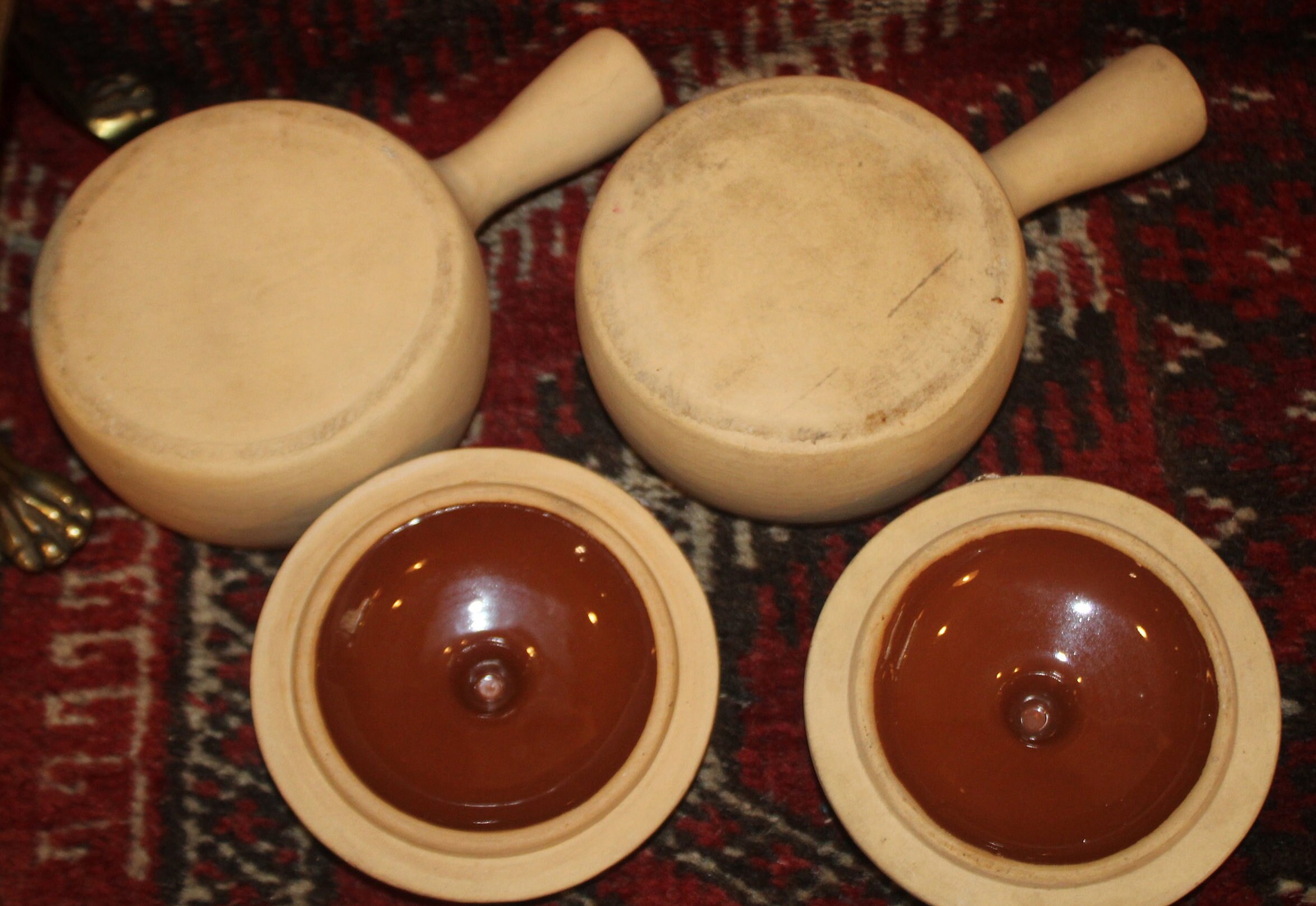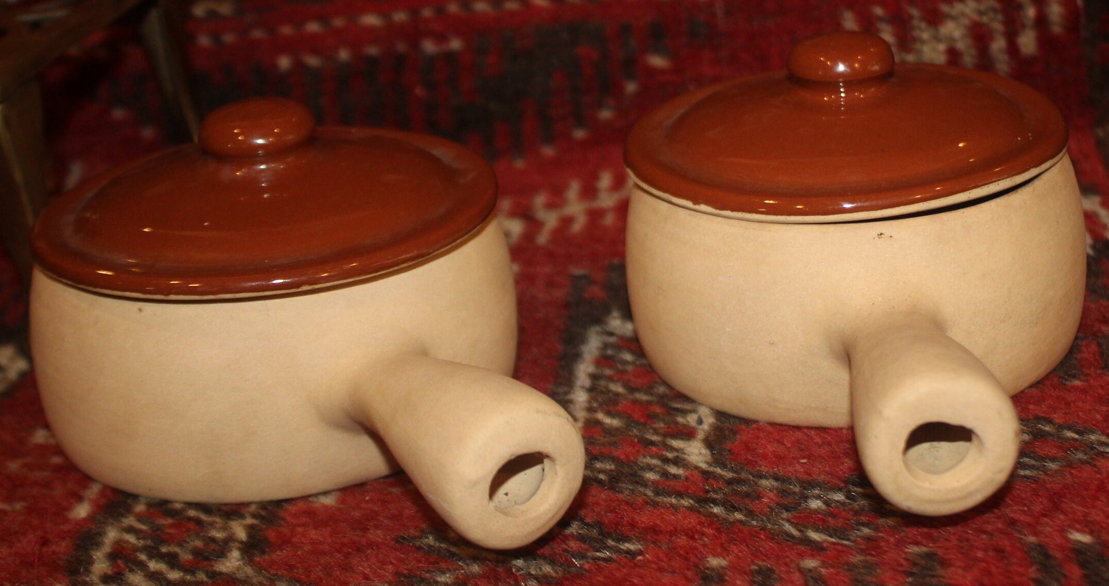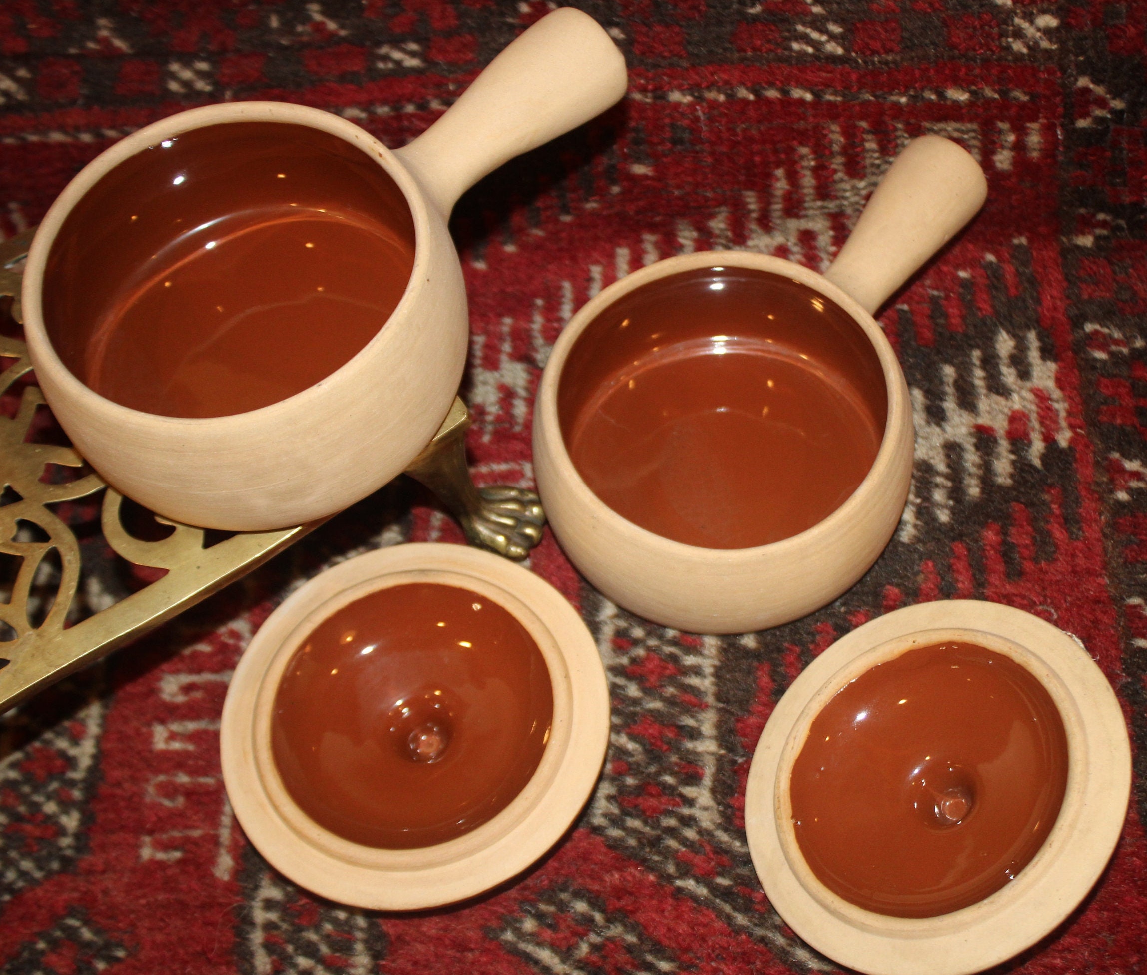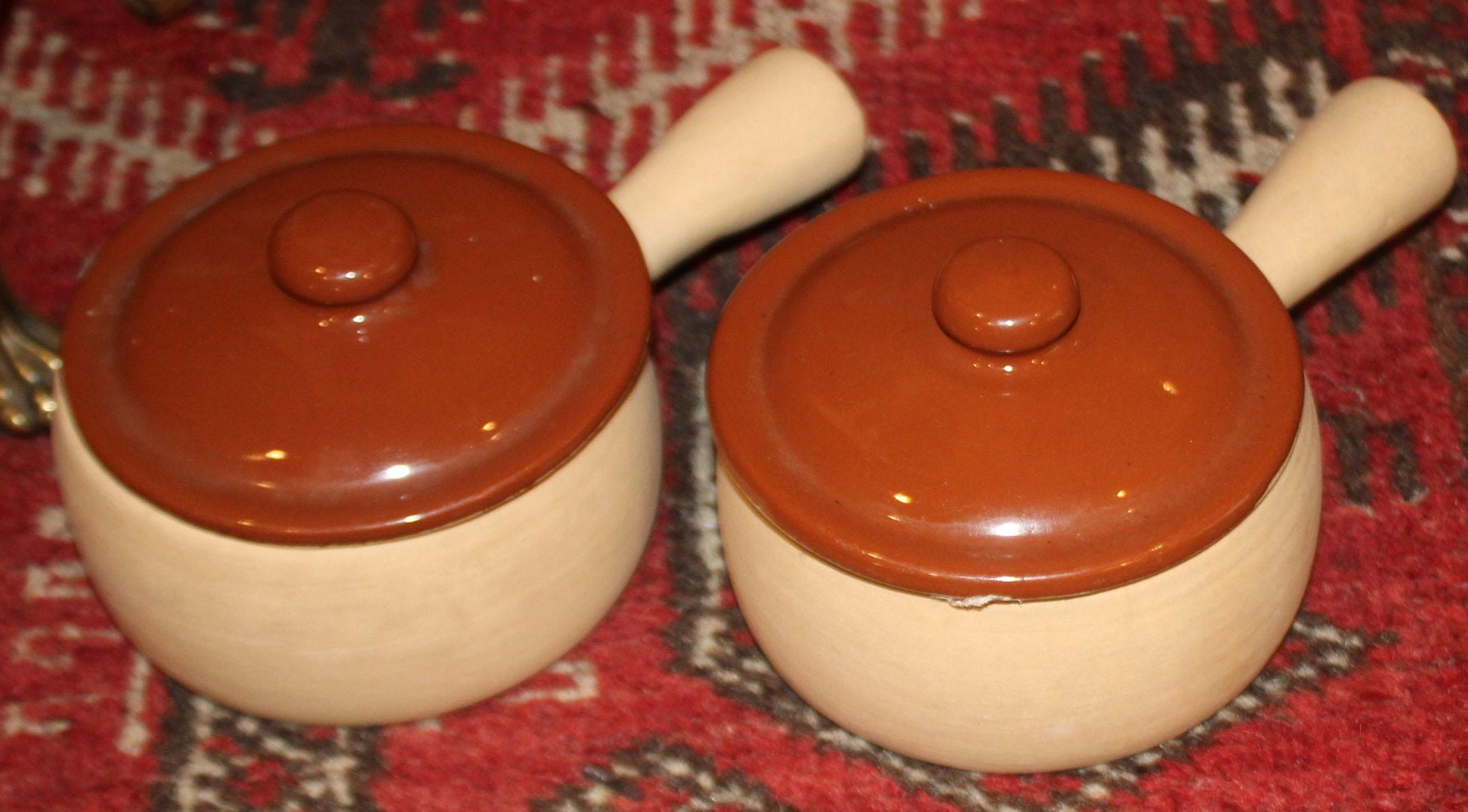 This Great Vintage Set of 2 Brownware Pottery Onion Soup/Bean Crocks with Lids is available to you; they would be a wonderful addition to your country decor!! Each bowl measures 4.25" in diameter x 2" in depth (the handle extends 2.5" from the bowl); and holds approximately 1.5 cups of liquid- perfect for a hot bowl of French Onion Soup or Chowder! We are selling these crocks as a set of two; They are in excellent condition with no chips, cracks, or stains (they are oven and dishwasher safe). Please message us if you have any questions- Thanks for looking!