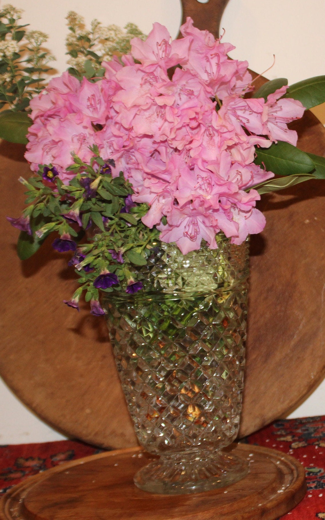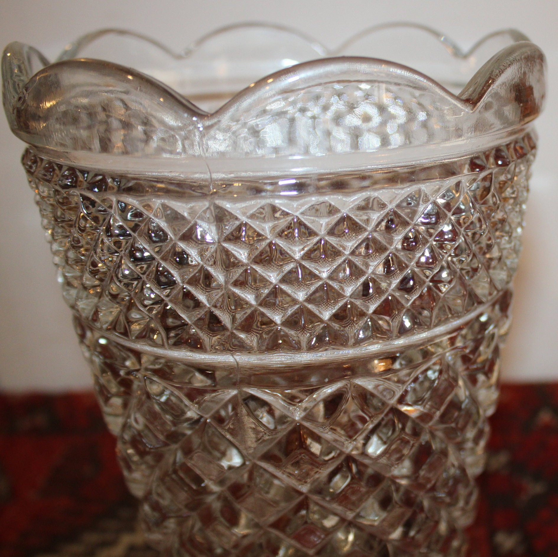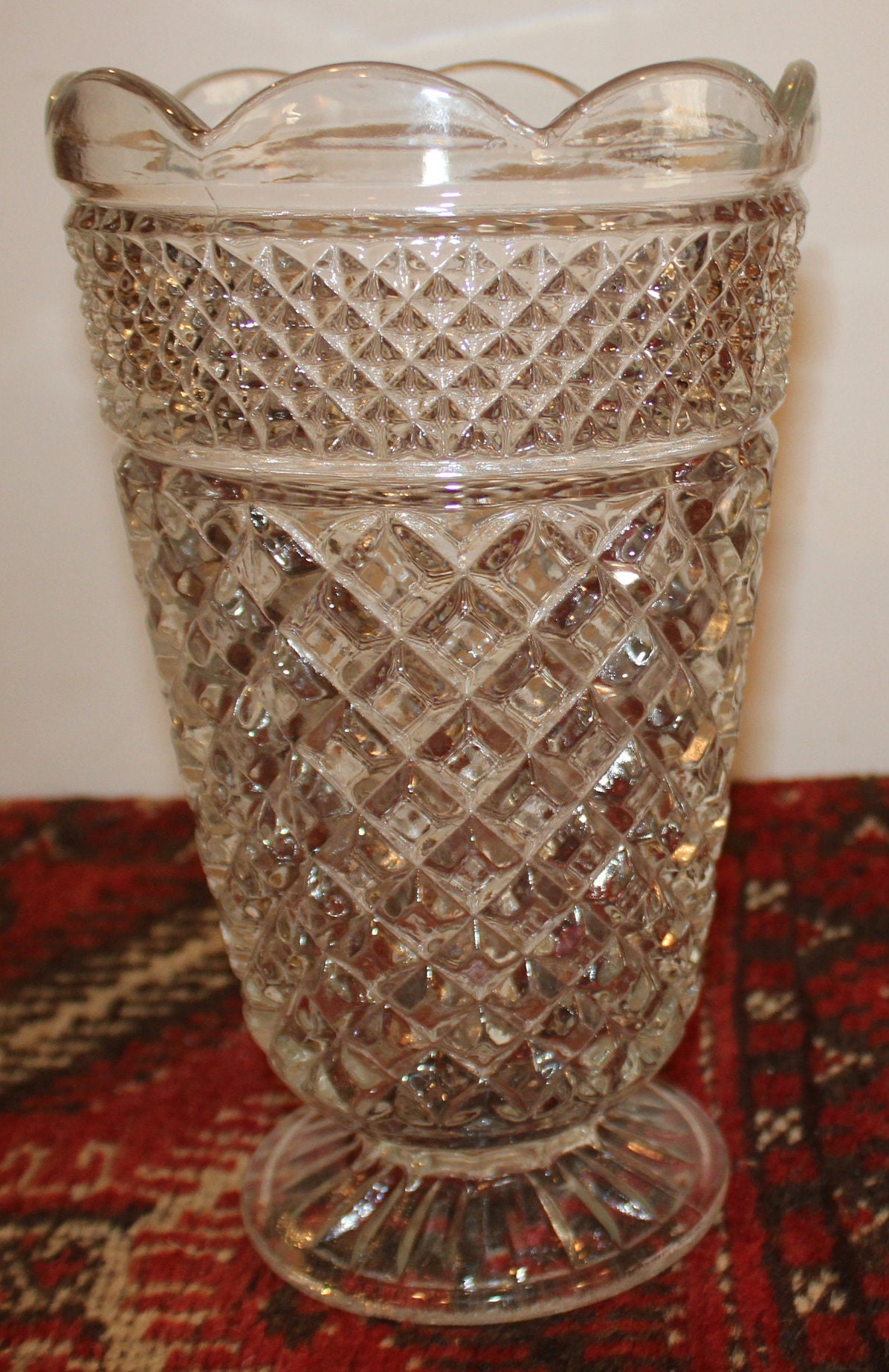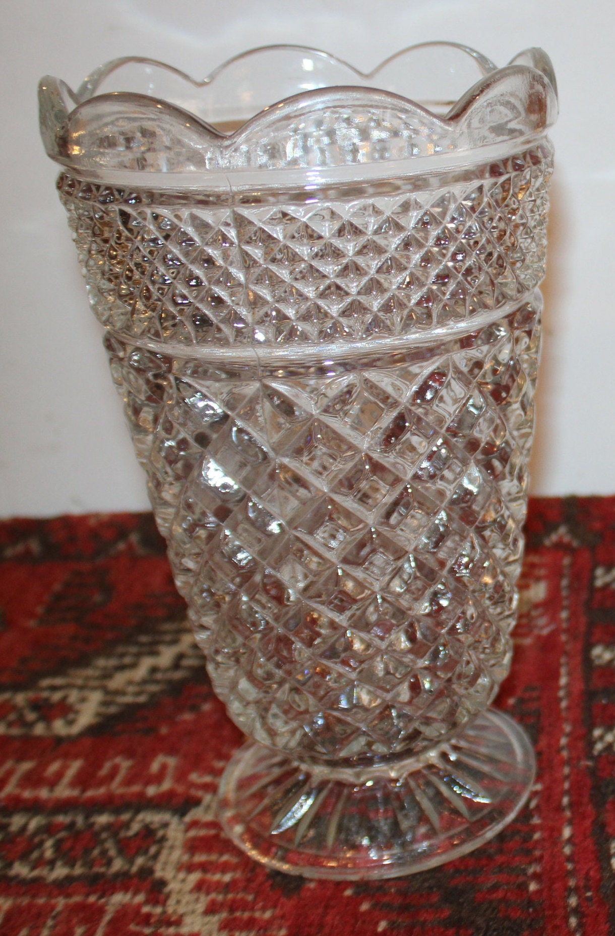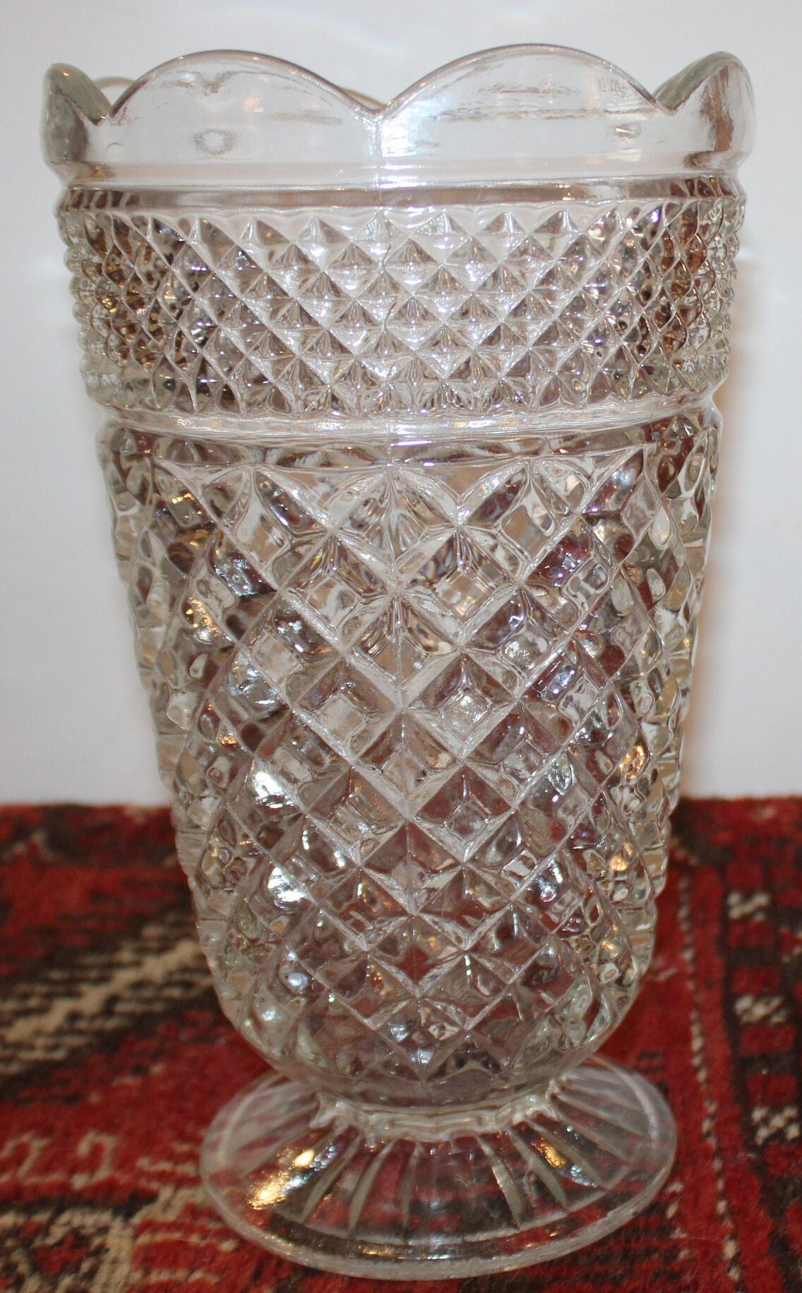 This Vintage Wexford Pattern Pedestal Vase by Anchor Hocking would be perfect to hold and display a large hand picked bouquet from your sweetheart! It is simple in design with its clear glass diamond pattern and scalloped rim. It measures 10” tall x 6" in diameter. There are no chips or cracks- a great vase that will not overpower your bouquet. Thanks for looking- please message us if you have any questions!