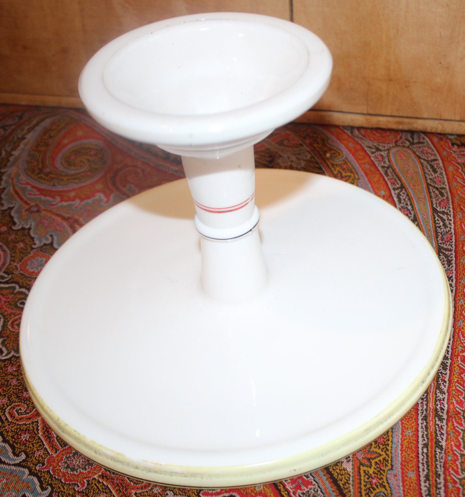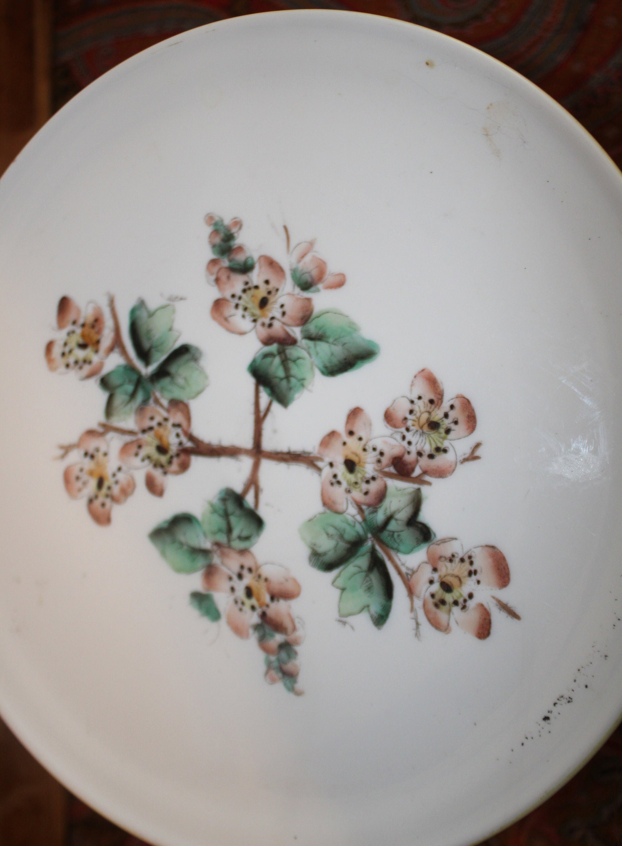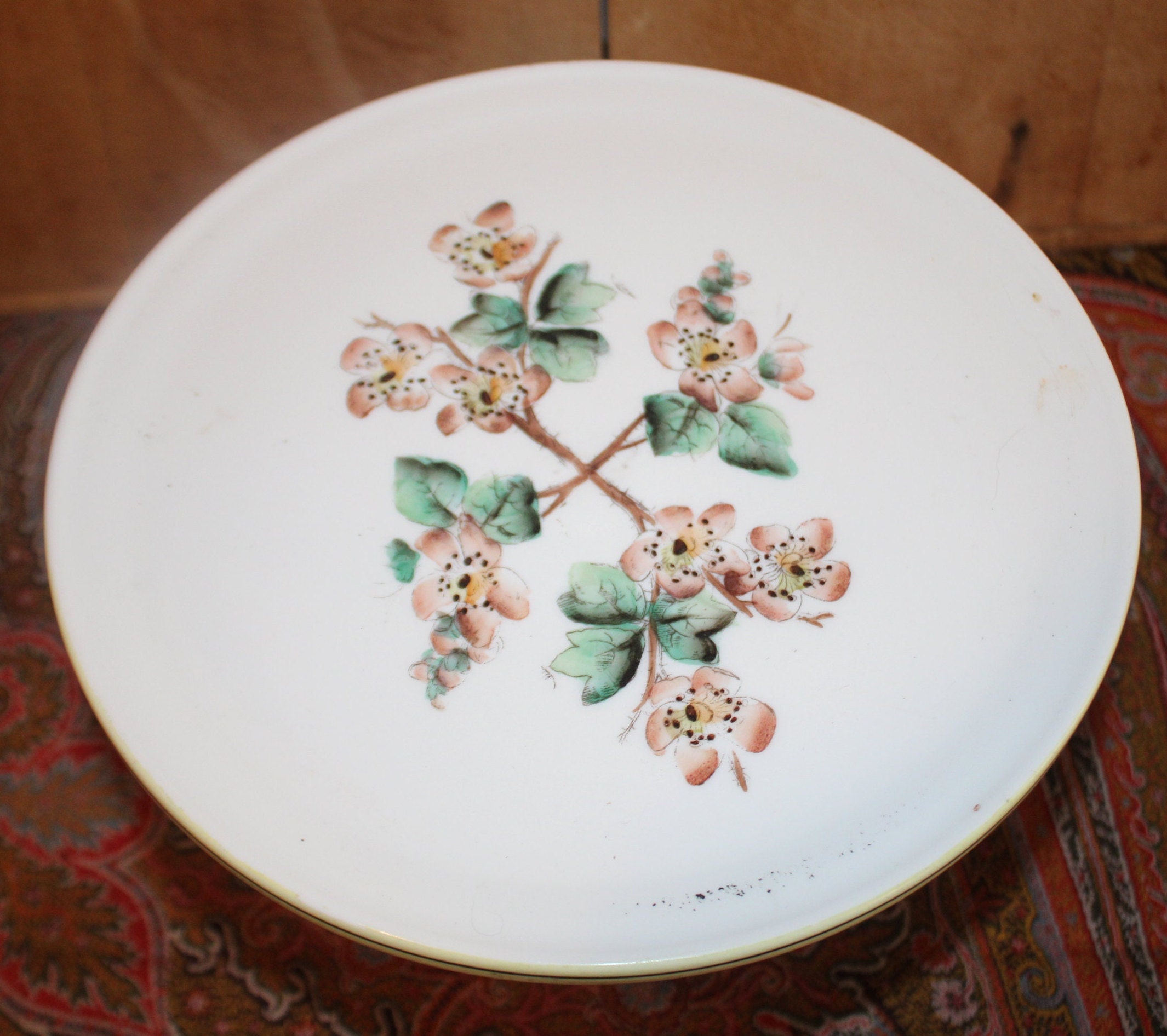 This gorgeous antique Challinor Taylor hand painted milk glass pedestal cake stand would be the perfect addition to your French country decor!. The hand painted Dogwood/Cherry/Rose mallow is beautiful! The plate is approximately 9.25" in diameter x 6" tall; there are no chips or cracks- a truly spectacular piece to display a special cake upon! There are no chips or cracks. Please message us if you have any questions- Thanks for looking!