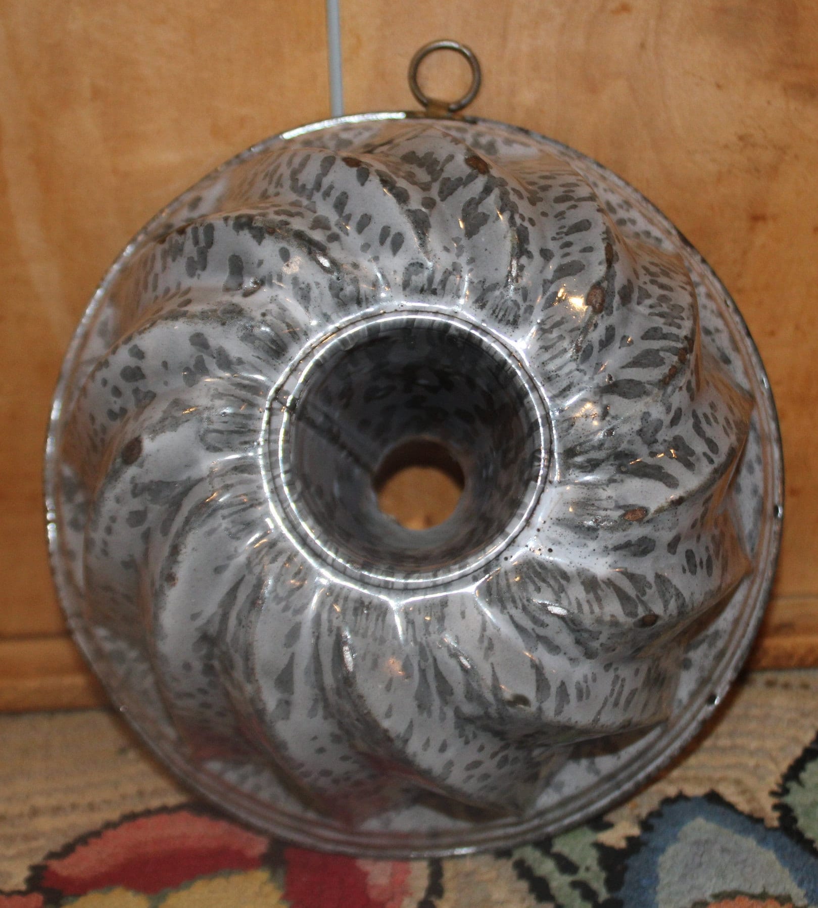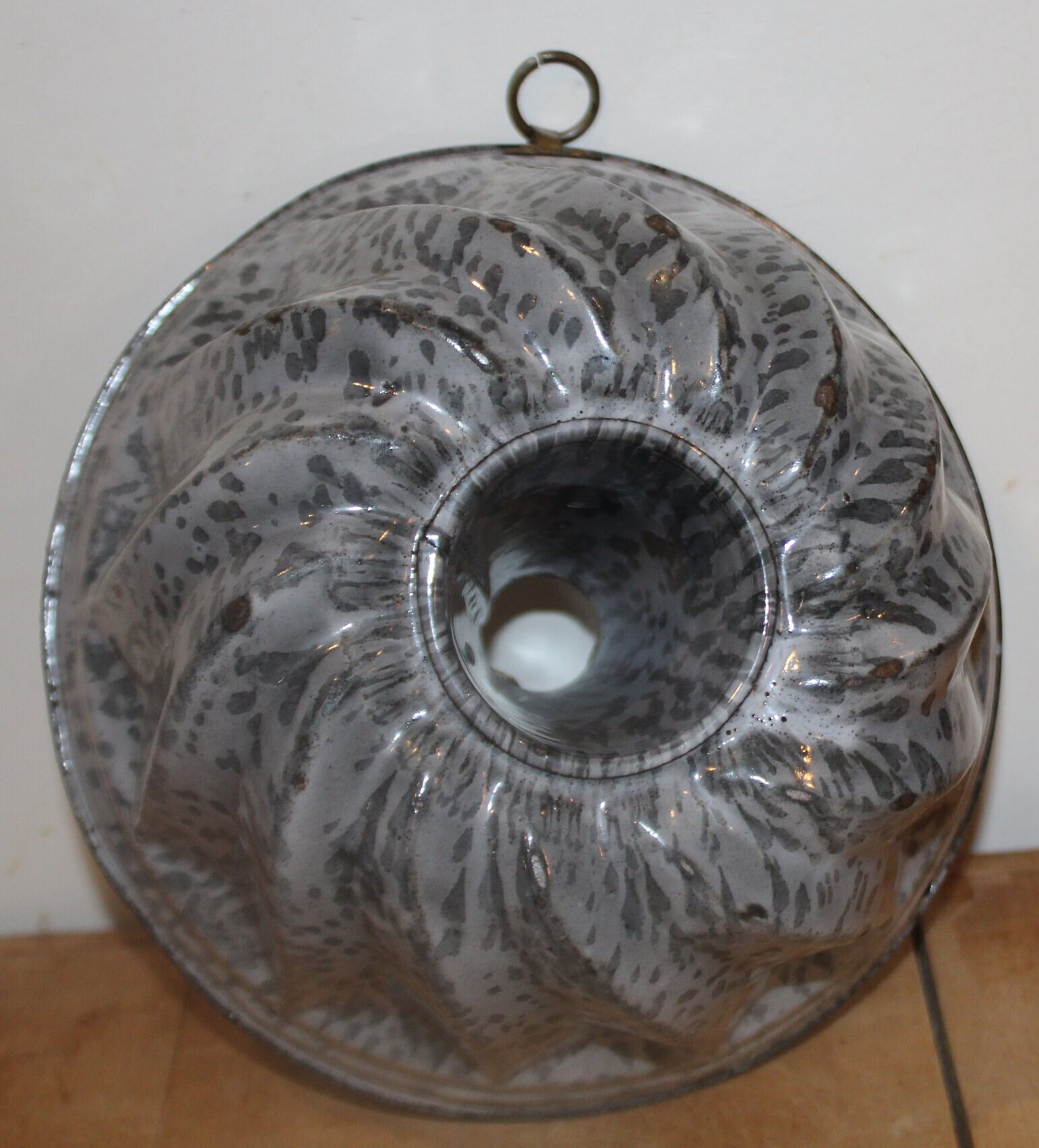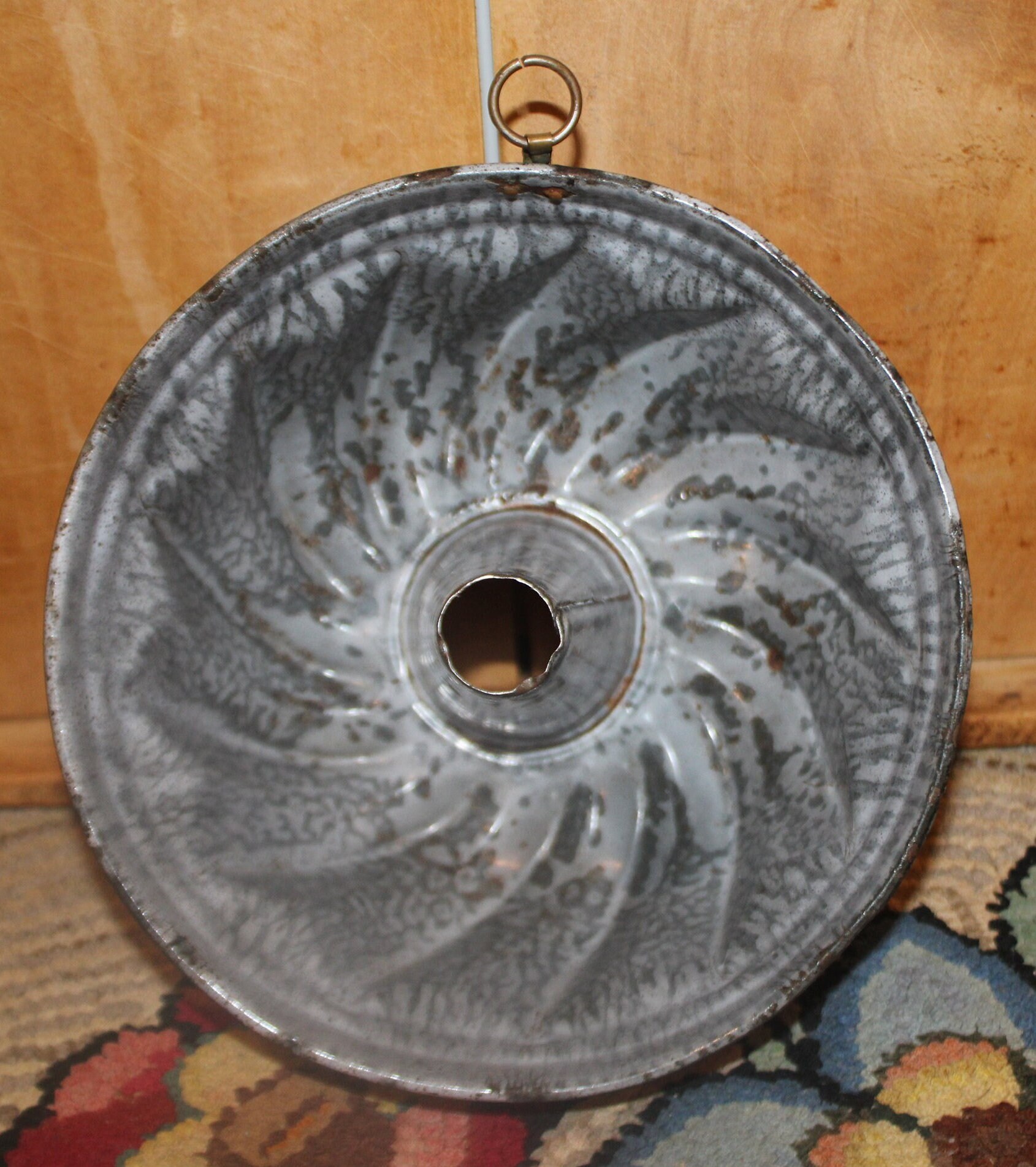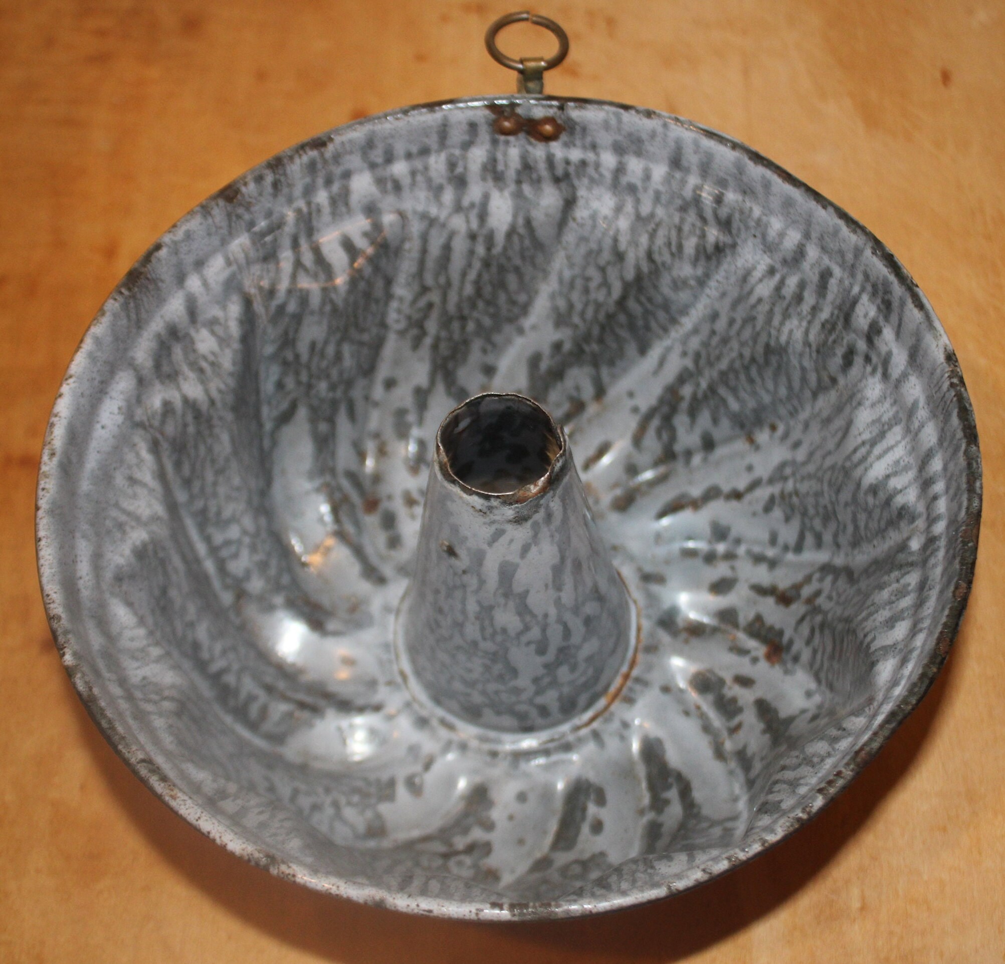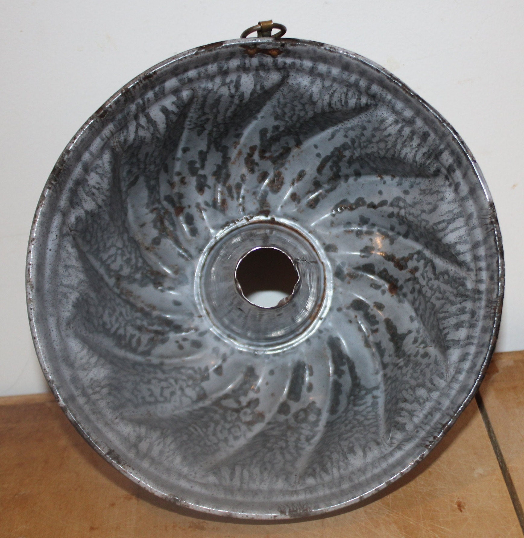 This Great Antique Turks Head Granite ware Pudding Mold from the 19th Century would be a lovely addition to your farmhouse decor! It is 7.5" in diameter x 3.5" tall- It would look wonderful hanging by the brass o-ring in your country kitchen. The enamel is in fine shape considering it's age- there are edge wear knicks to the rim. Please message us if you have any questions- Thanks for looking!