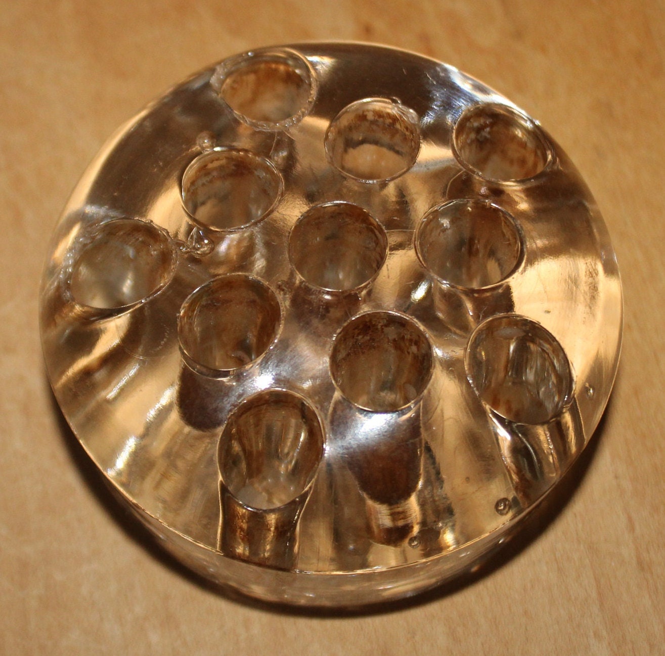 This 11-Hole Vintage Glass Flower Frog would be a lovely addition to your next beautiful arrangement- Perfect timing for Mother's Day (Hint Hint!) It is 3.25" in diameter and stands 1.5" tall. There is slight chipping to the holes which can be seen in the photos: A great vintage piece! Please message us if you have any questions- Thanks for looking!