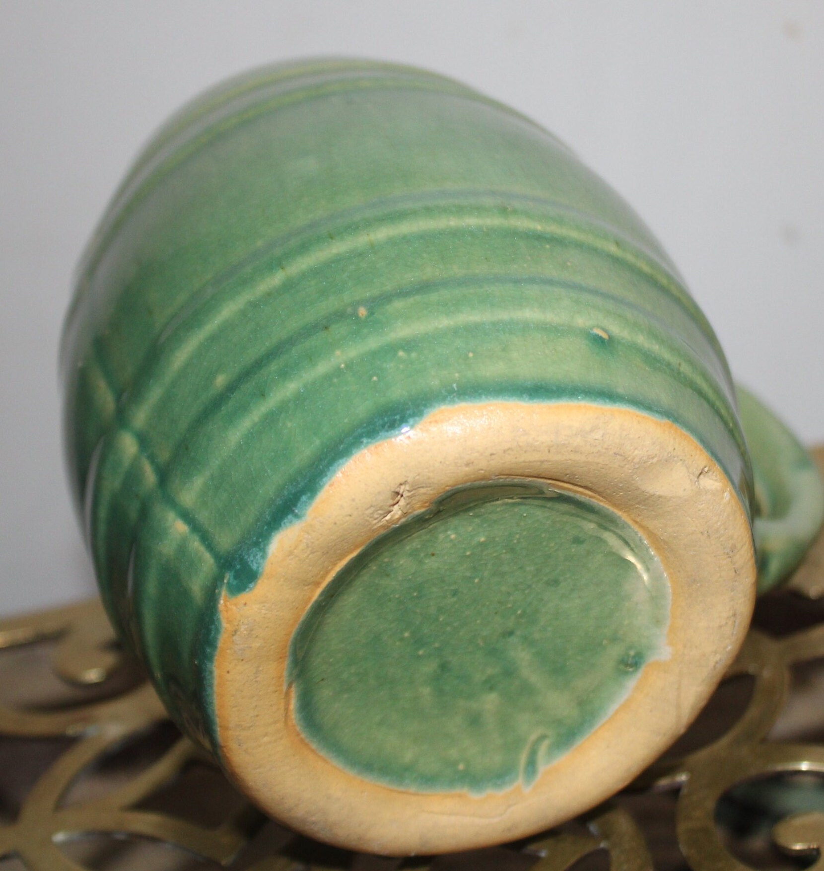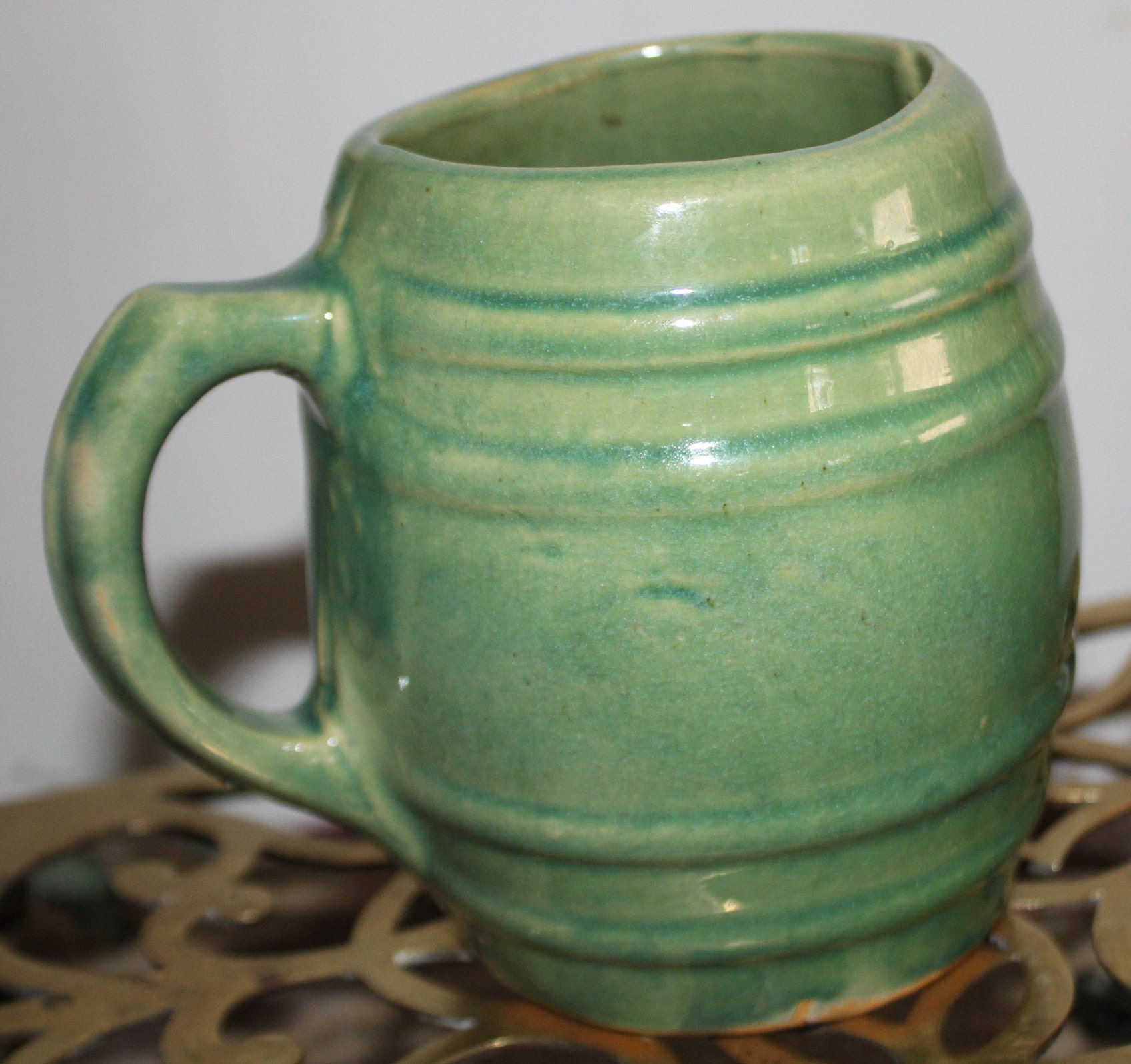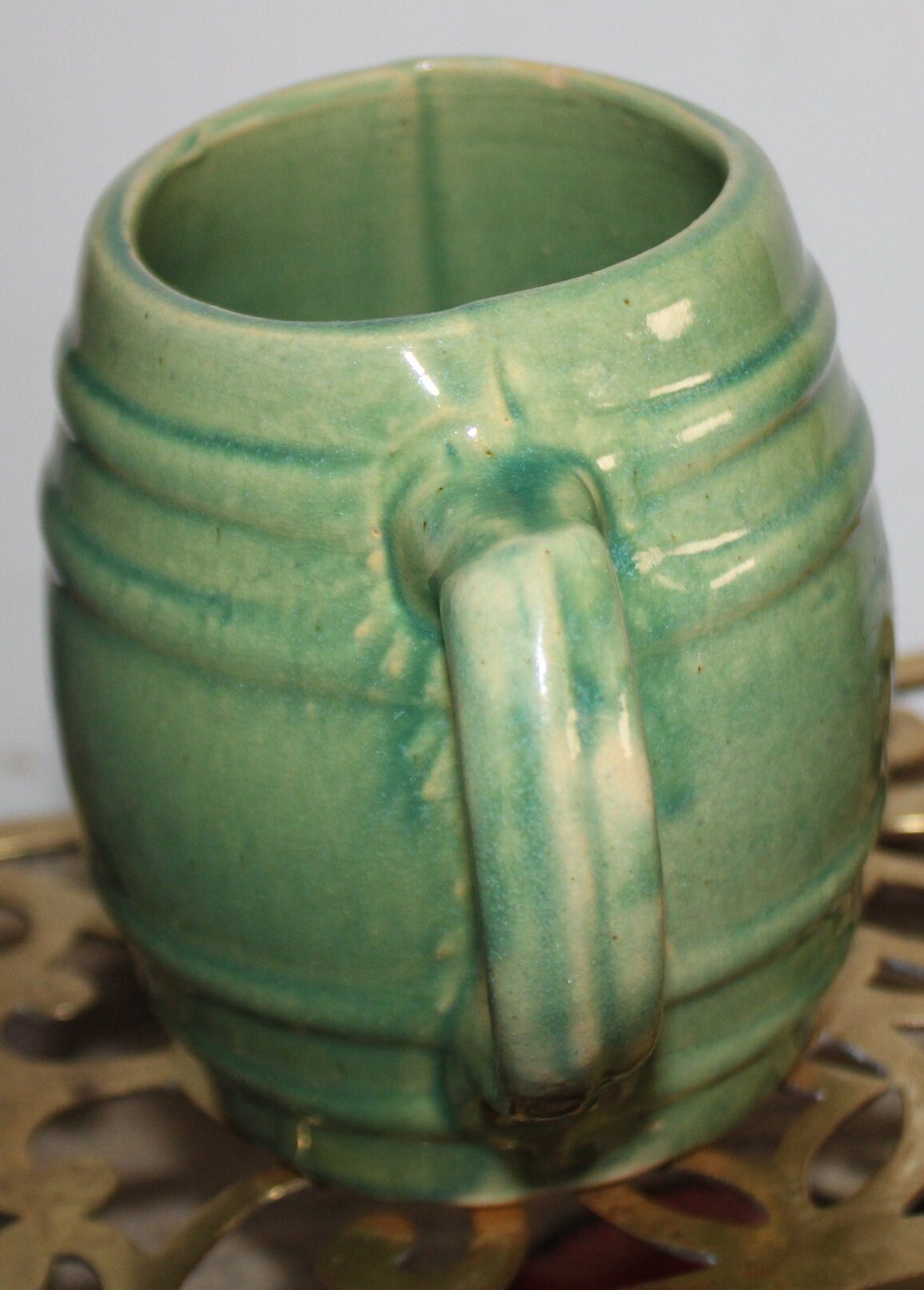 This Wonderful Vintage Sage Green McCoy Pottery Barrel Mug from the 1920's would be a great addition to your collection! It measures 5" tall and is 3" in diameter and holds 2 cups of liquid. There are no chips or cracks. Please message us if you have any questions- Thanks for looking!