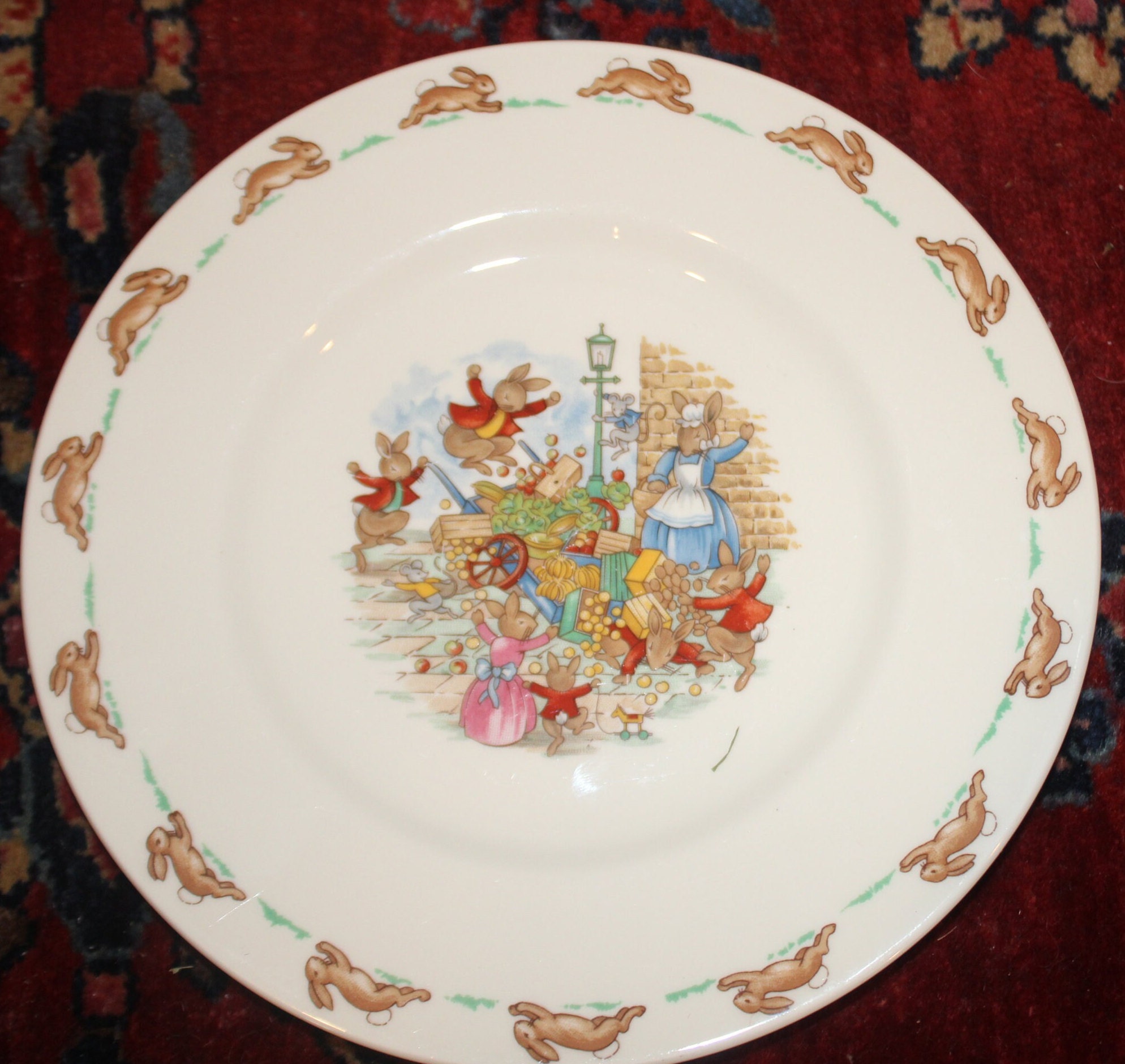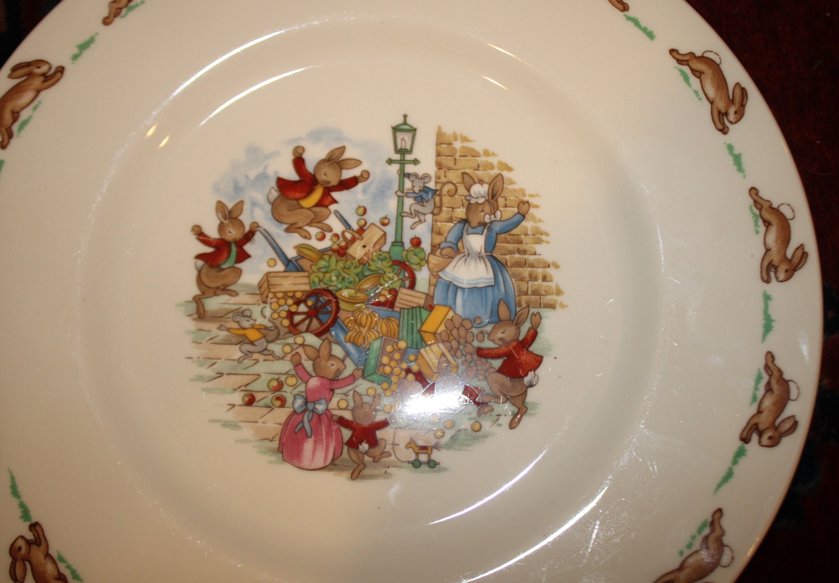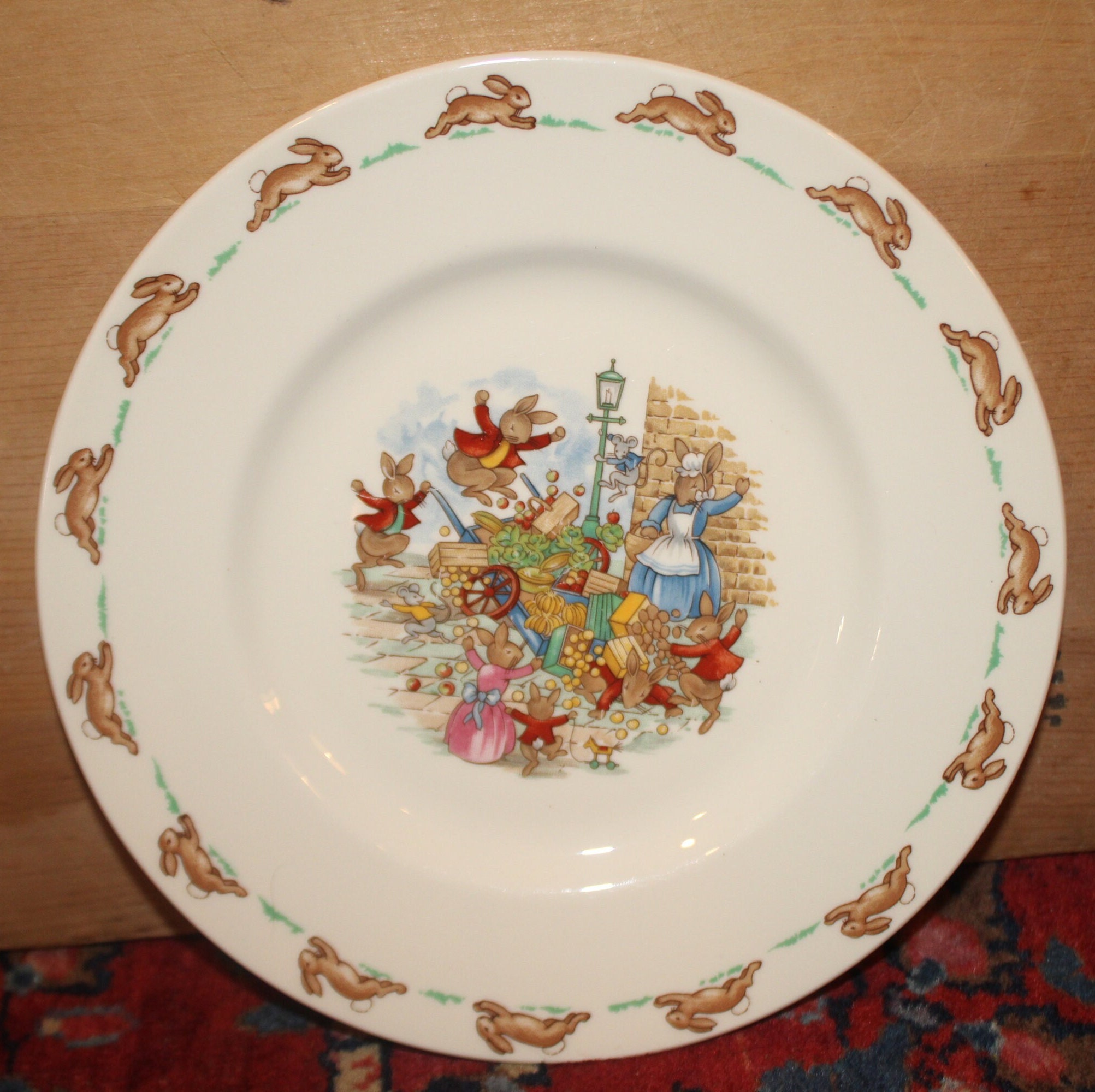 Vintage Royal Doulton Bone China Bunnykins Child's Plate- Toppling Fruit Cart- Made in England