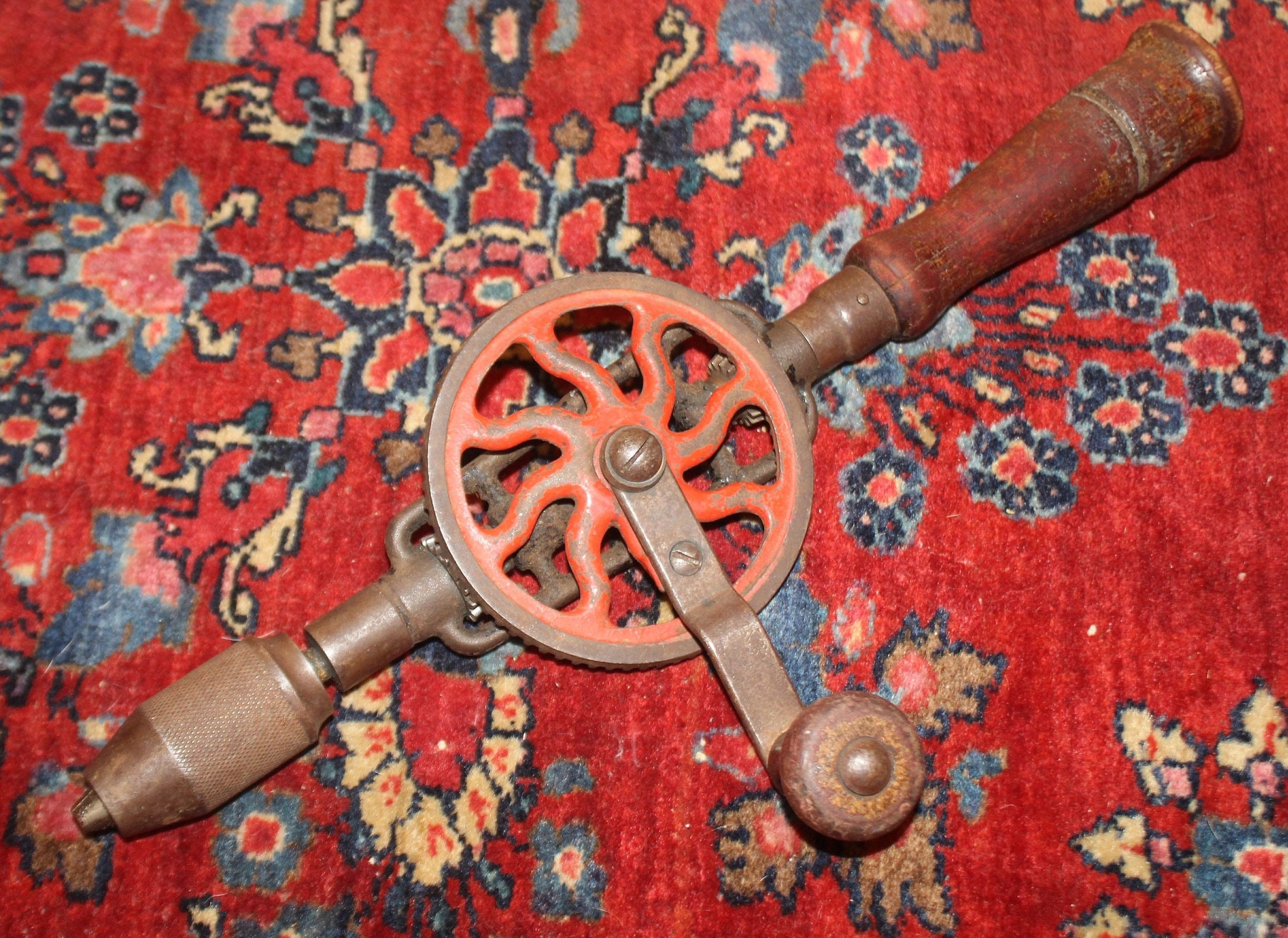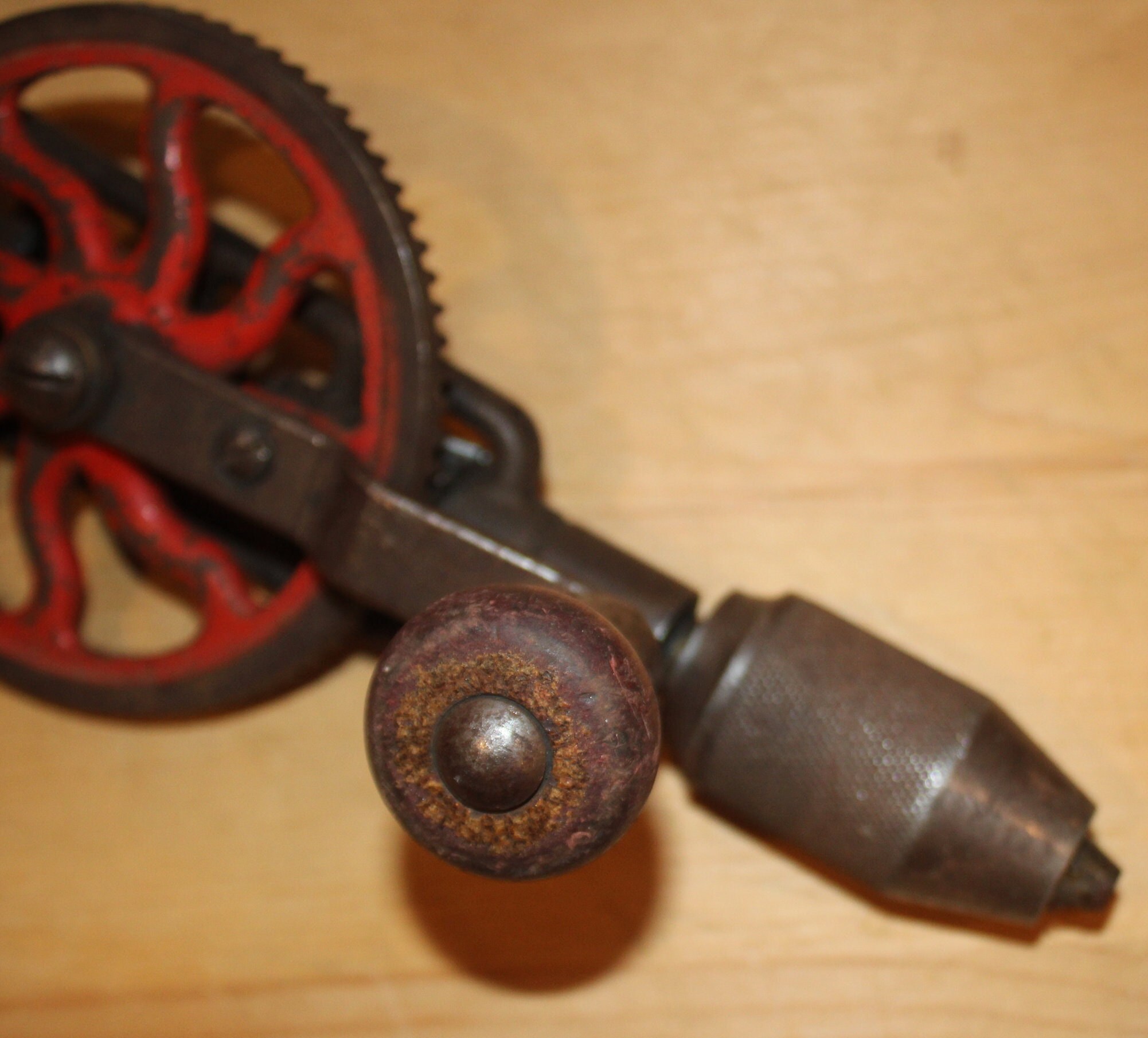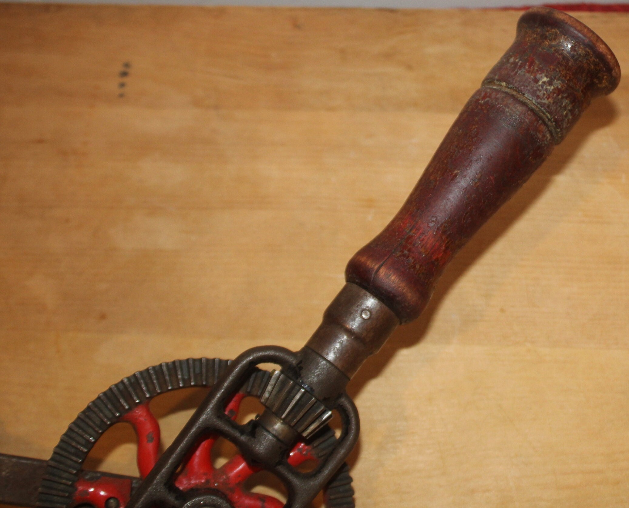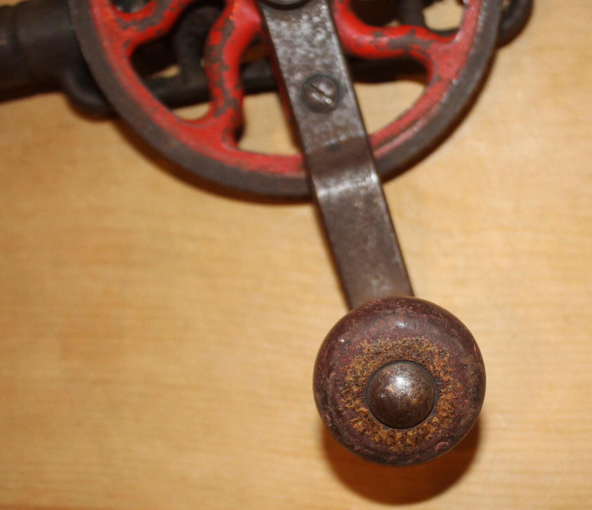 This Antique Miller's Falls #2 Eggbeater Hand Drill would be the perfect tool to use or display in your workshop! It is missing the wooden side knob and has cosmetic wear which is reflective of its age; the gears run smoothly and it is very easy to turn- it would be the perfect tool to tap your spring maple trees for maple syrup production. The wooden handle unscrews for drill bit storage. It is 15" in length. Please message us if you have any questions- Thanks for looking!