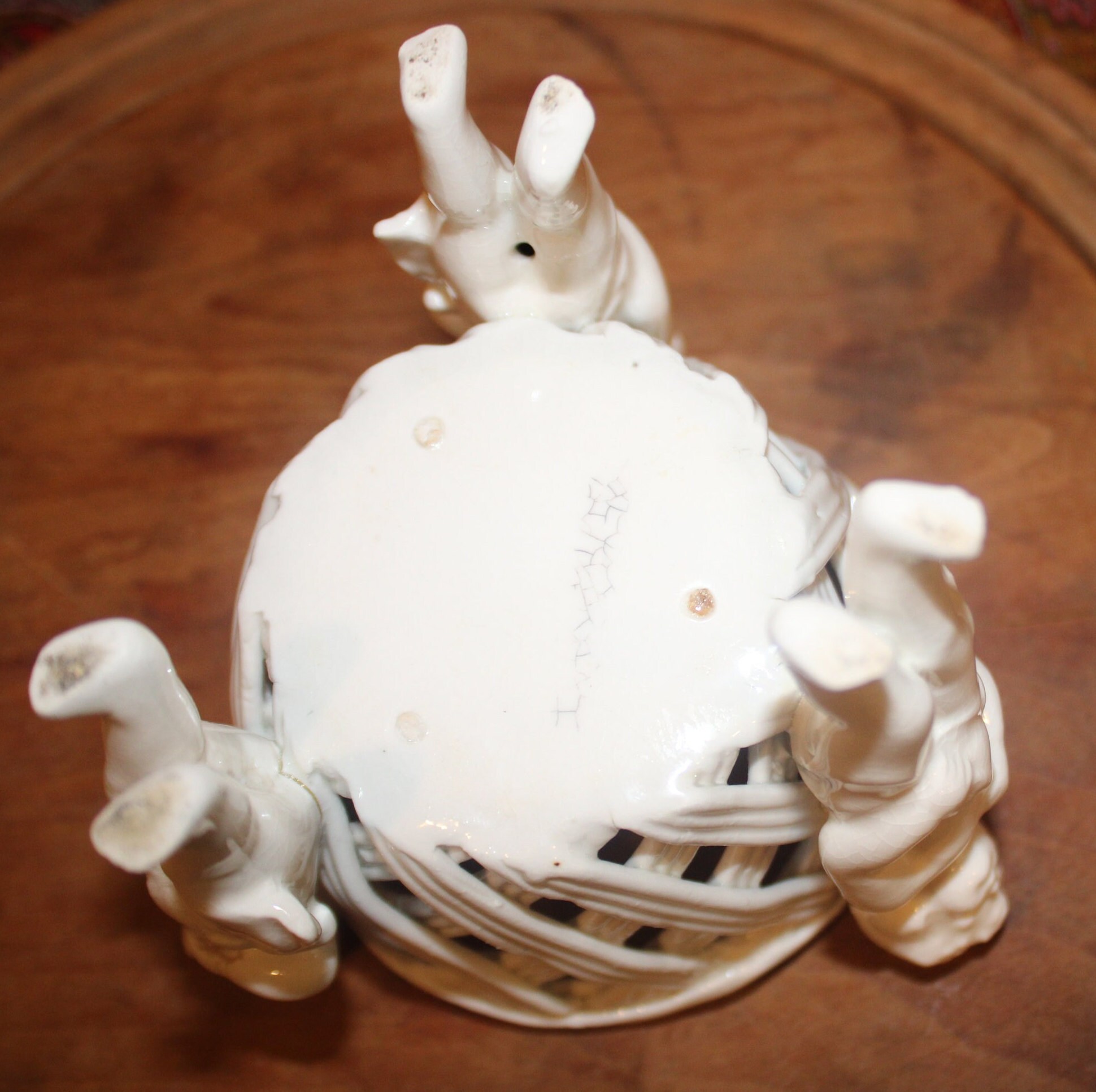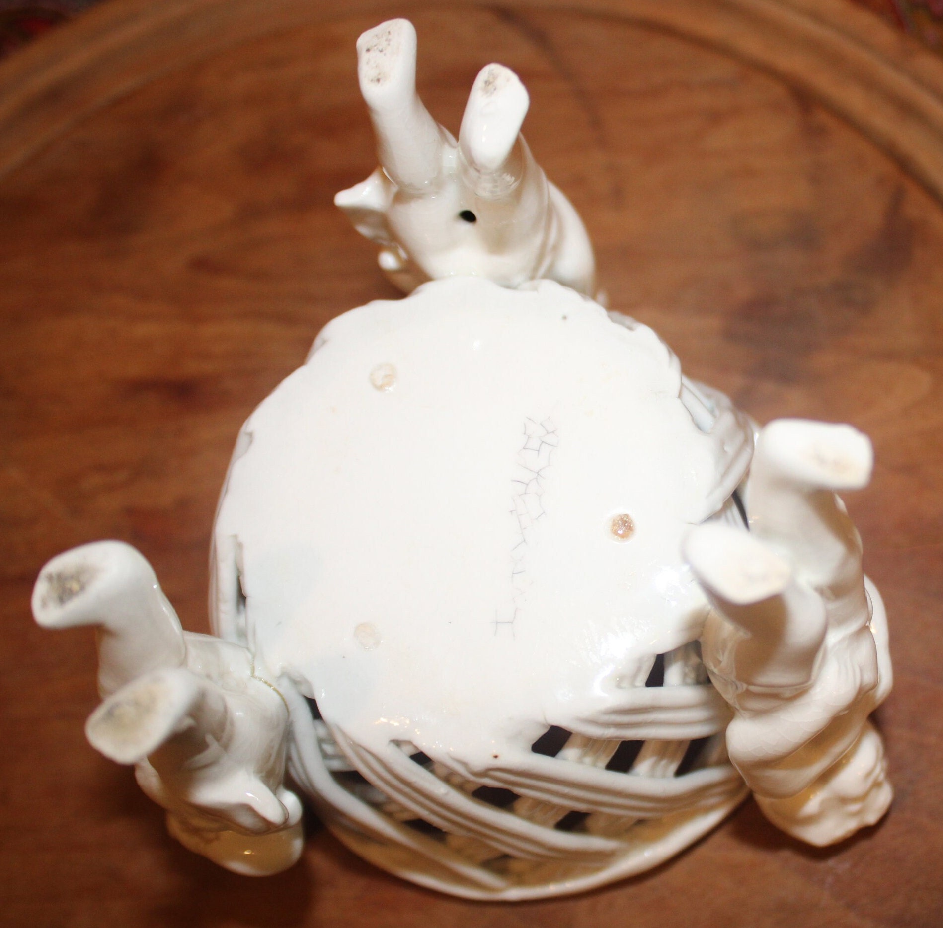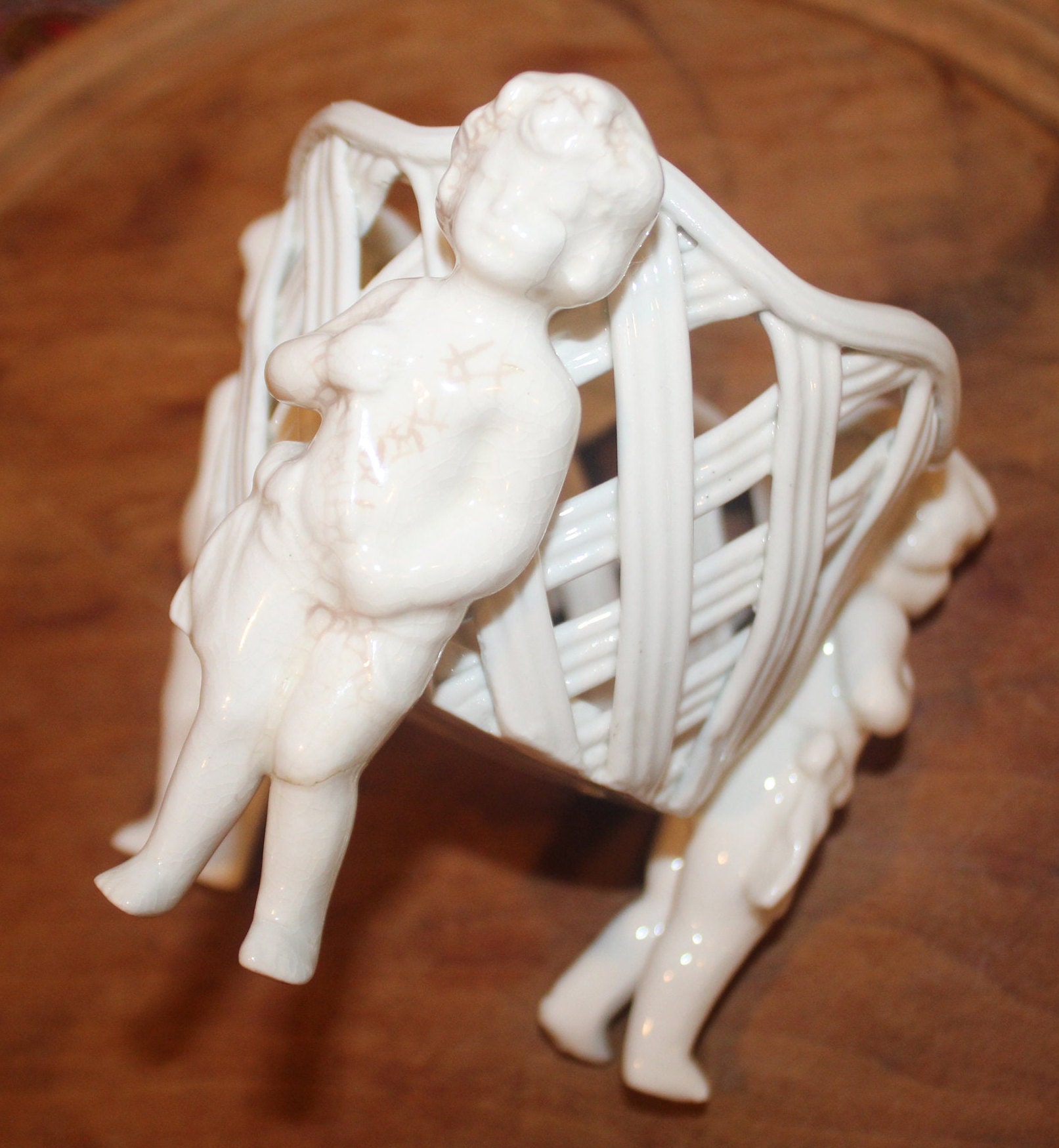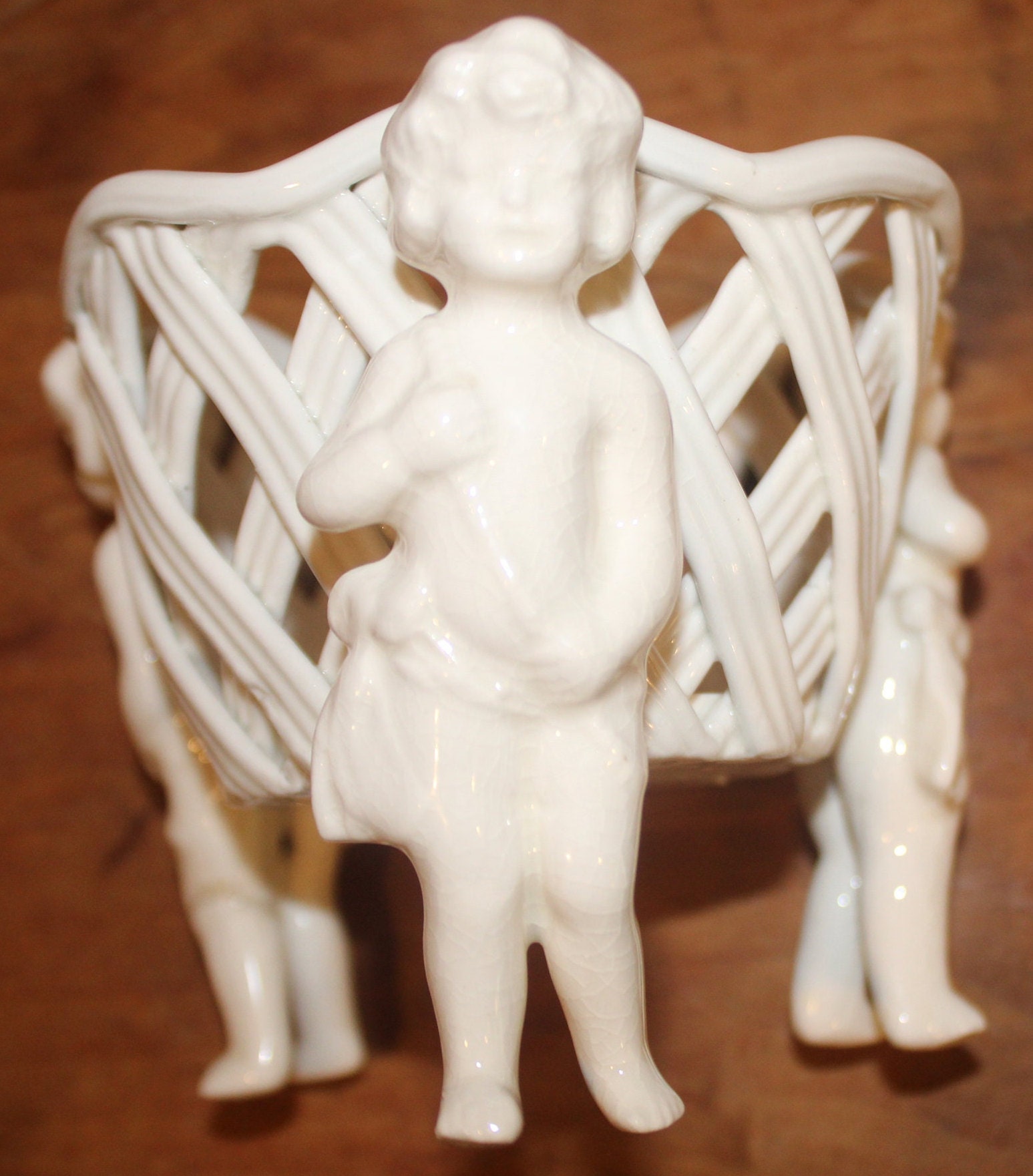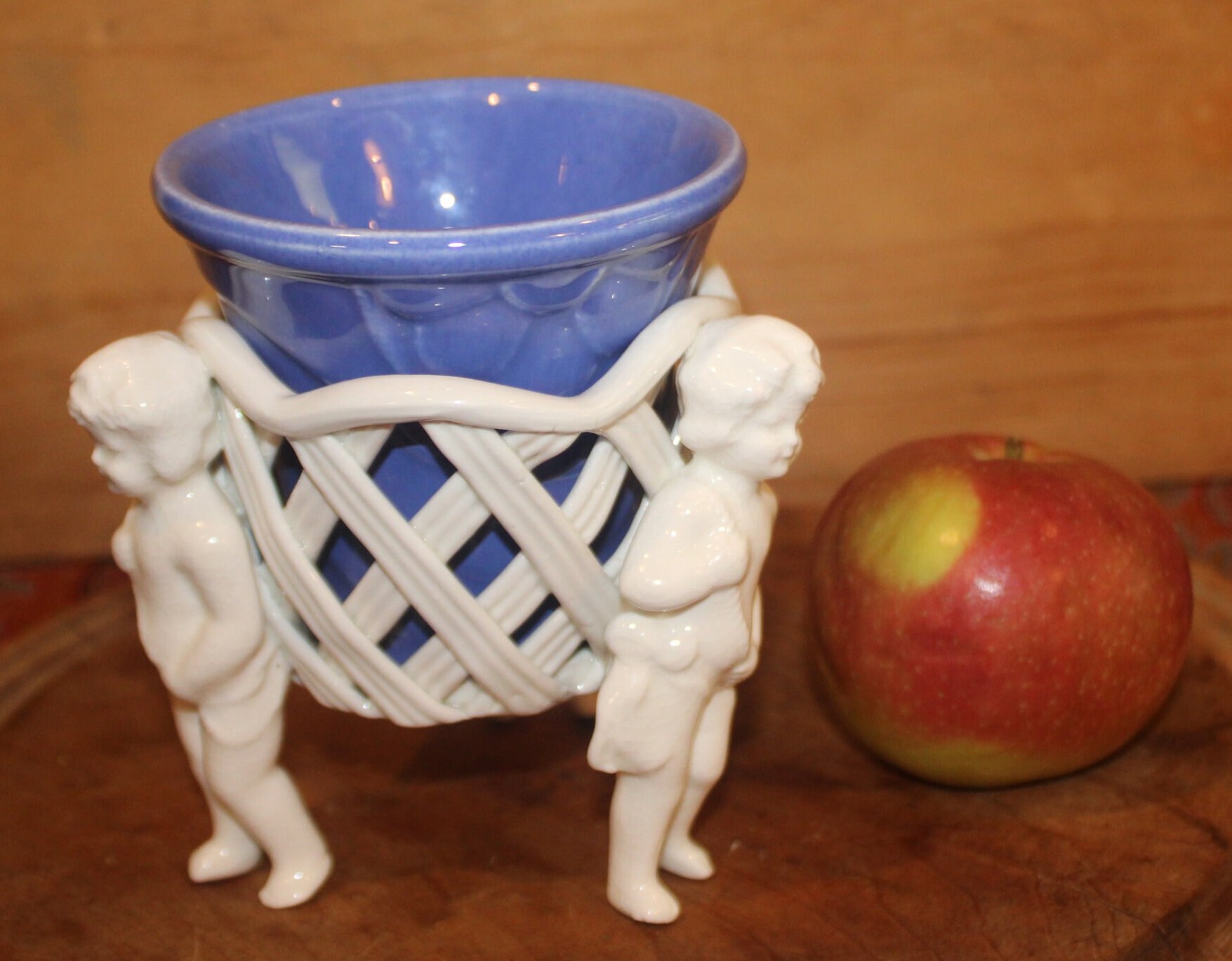 We just adore this Vintage White Basket weave Riser/Planter with Cherub feet! It is 4" tall x 3.5" in diameter and will hold a miniature planter (please see our last photo- the blue planter is available for purchase in our shop). It would look stunning in a french country window holding succulents or ivy! There is some crazing which is reflective of age; there is also some cracks which have been repaired but don't affect the piece's integrity or beauty. Please message us if you have any questions- Thanks for looking!