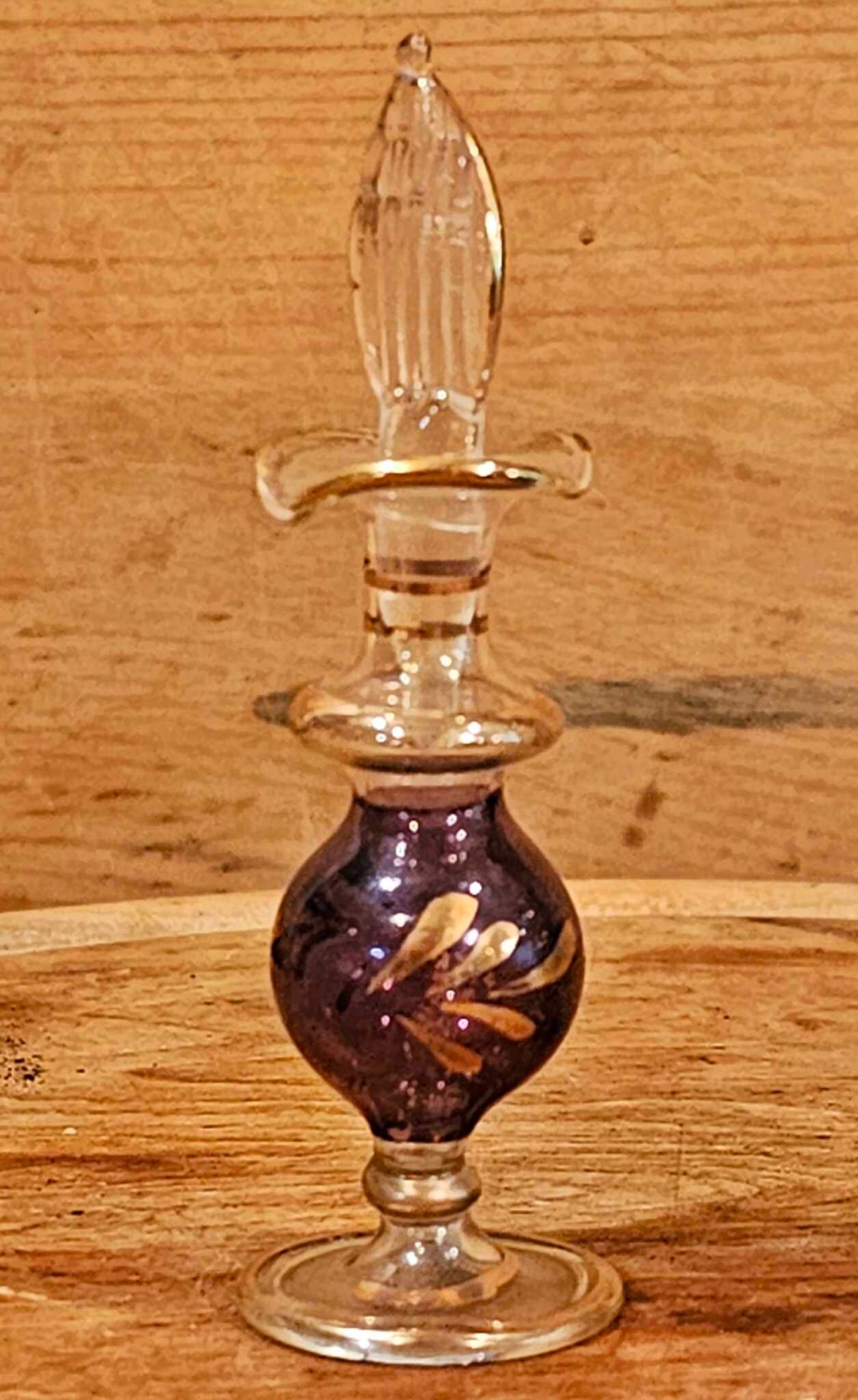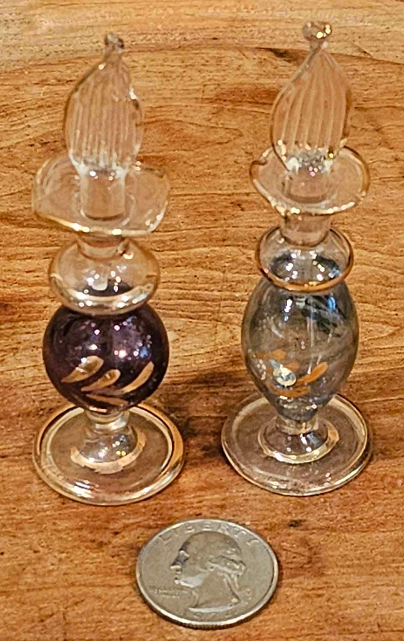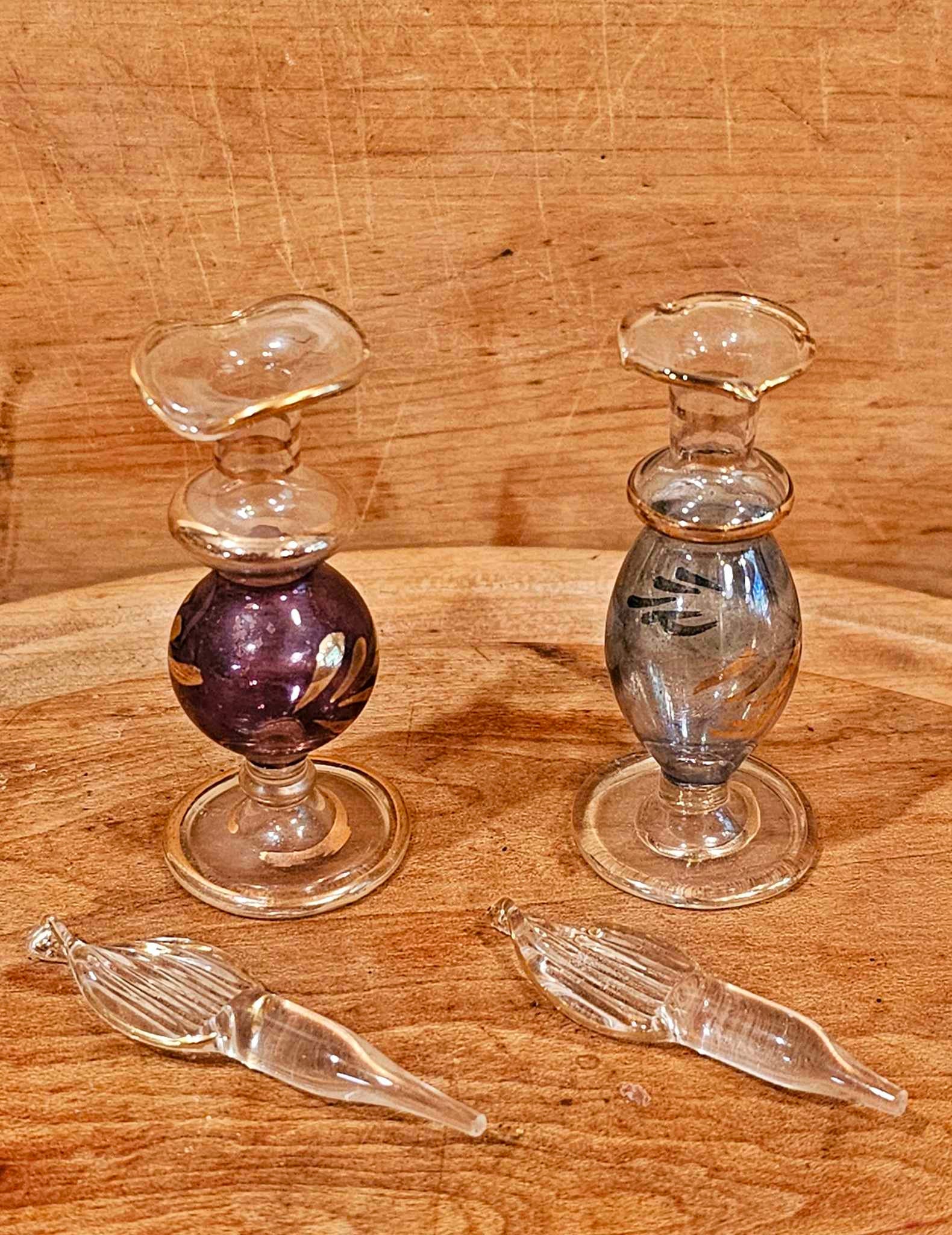 Two Vintage Miniature Glass Pedestal Perfume Bottles with dippers- Blue and Purple