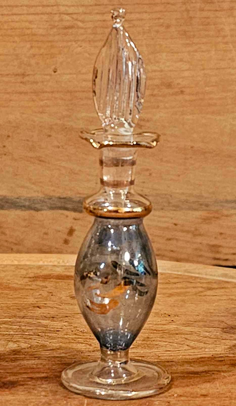 This Pair of Vintage Miniature Pedestal Glass Perfume Bottles with their dippers would be lovely to add to your perfume bottle collection! They stand 3.5" tall x 1" in diameter and are hand-painted with gold gilt. Their interiors are very clean- and ready to be filled with your favorite scent! Please message us if you have any questions- Thanks for looking!