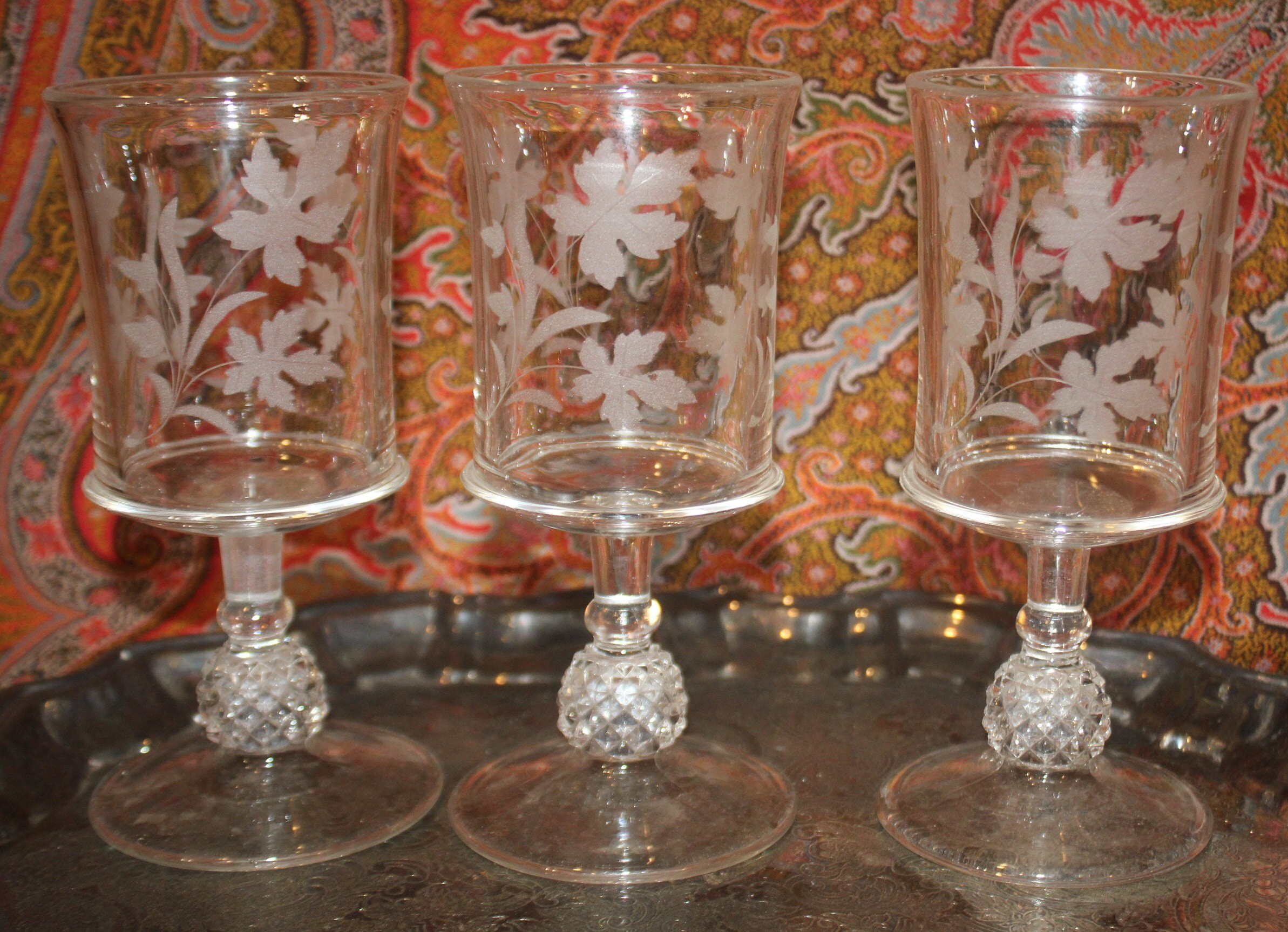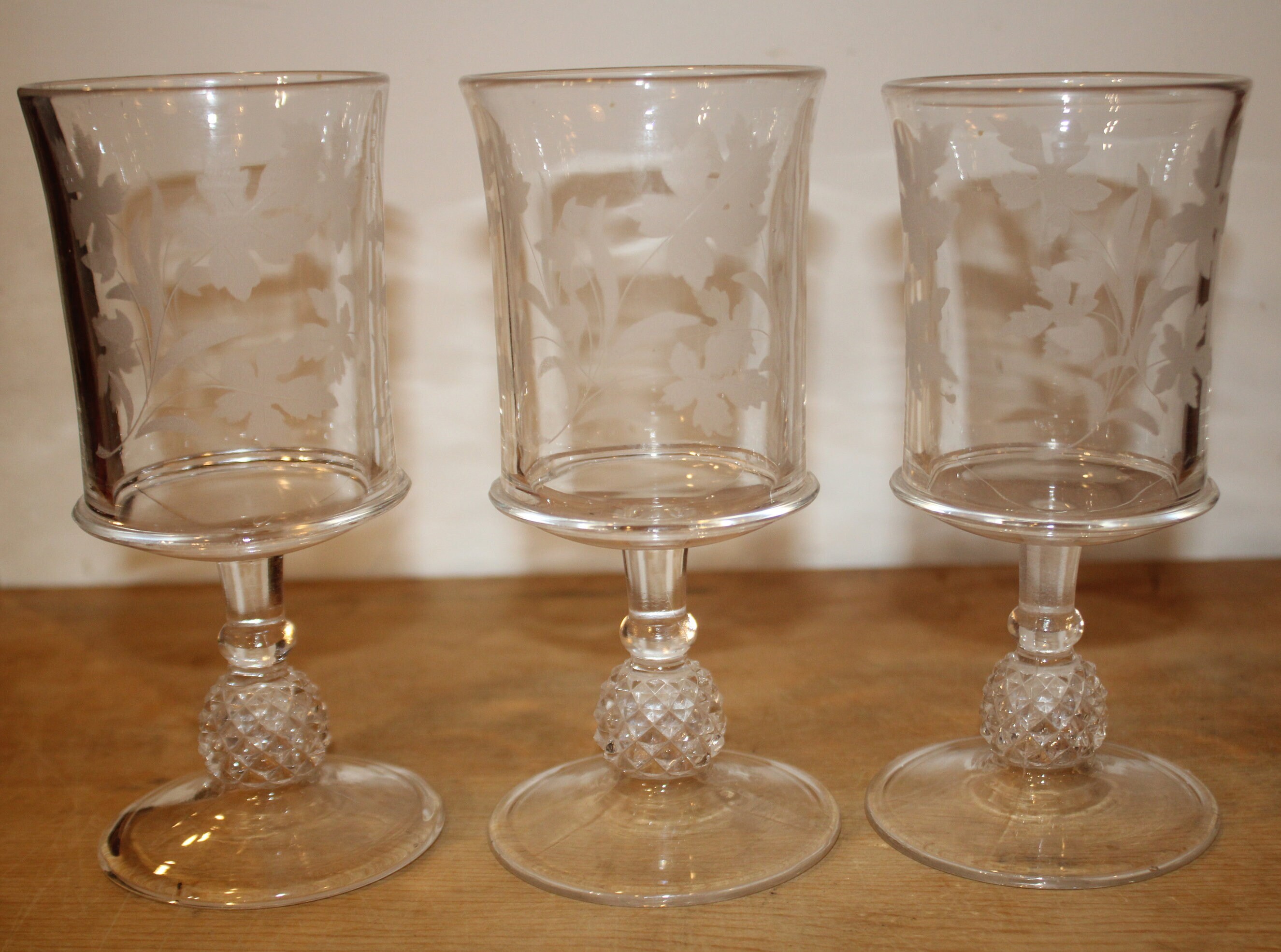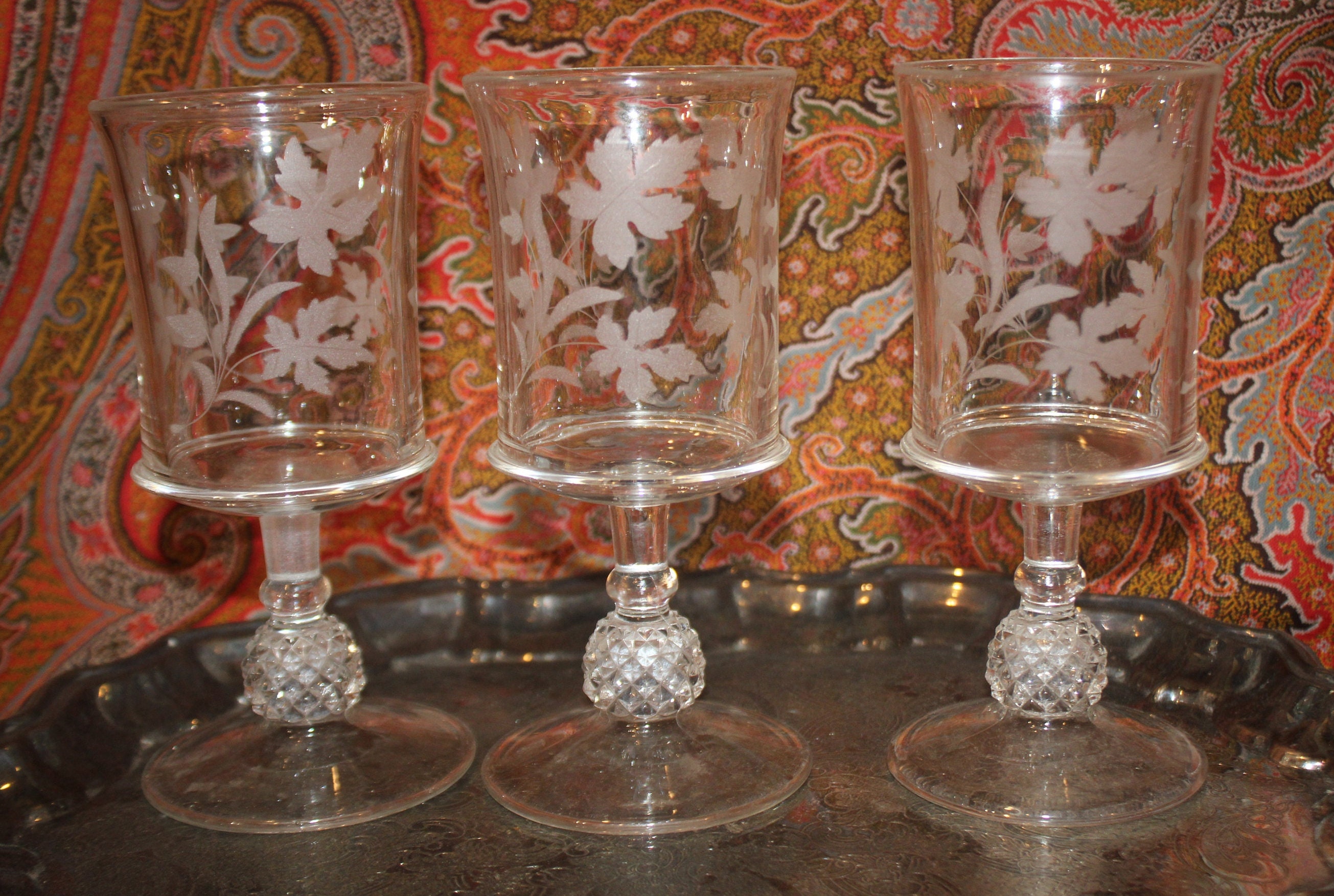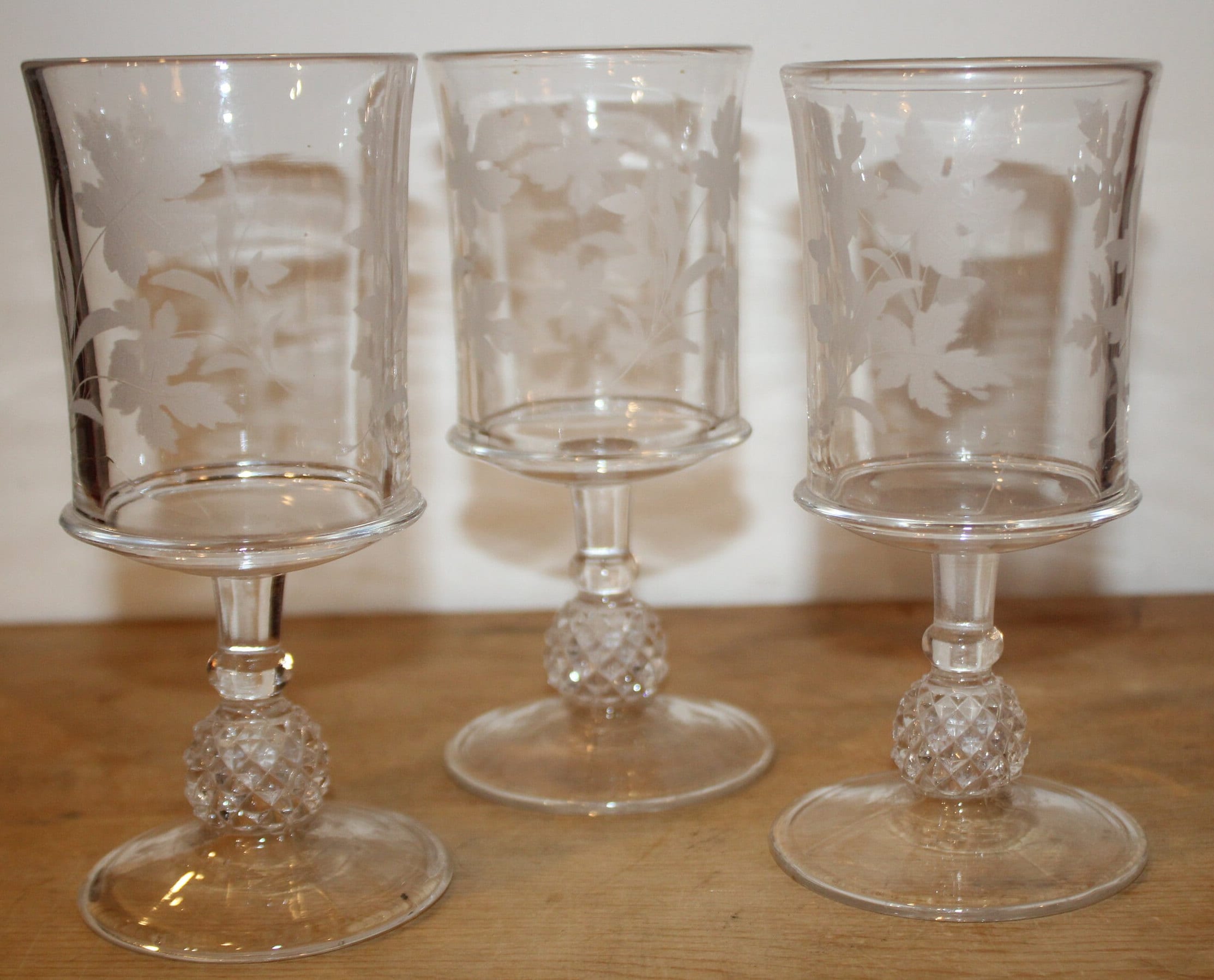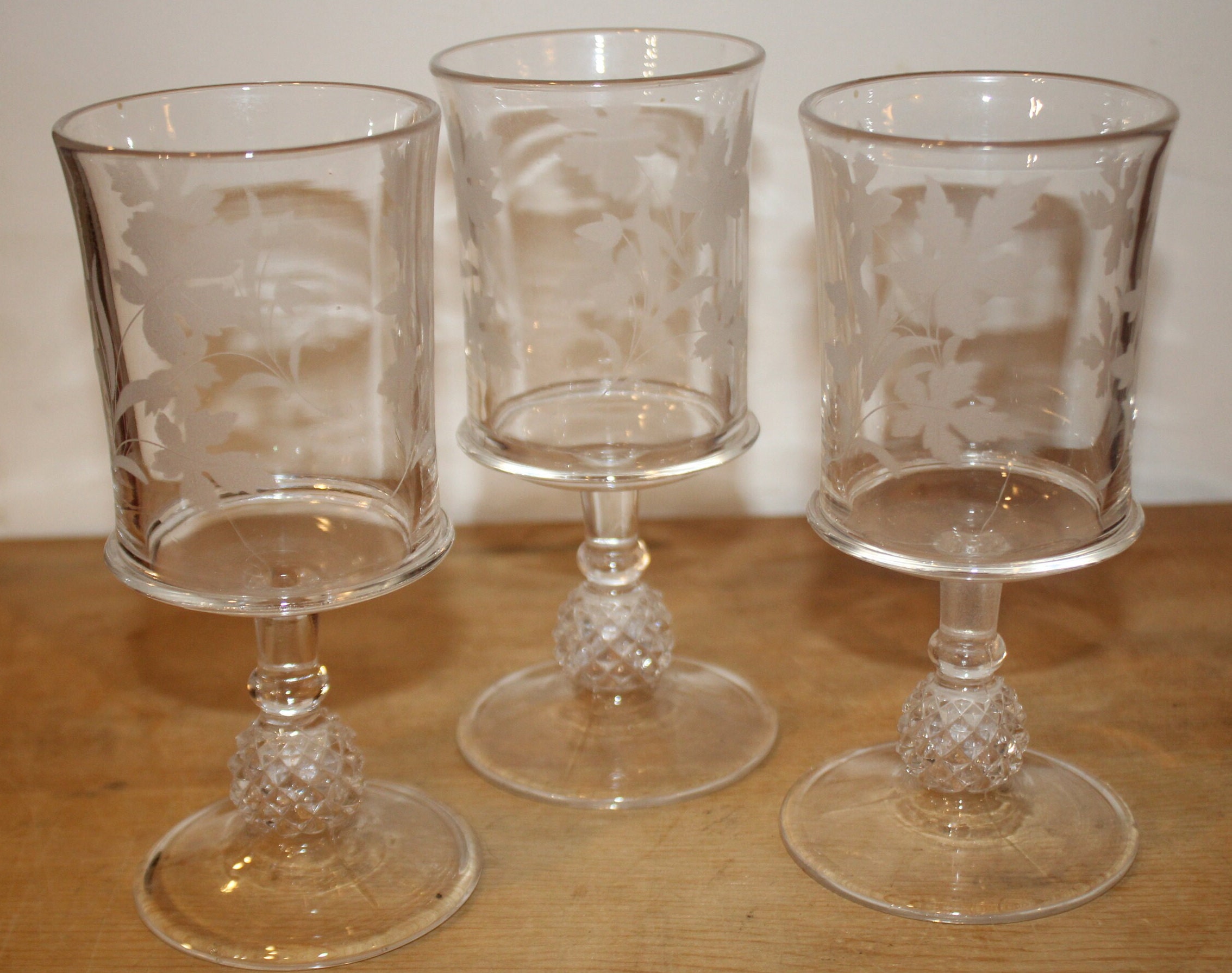 This Set of 3 EAPG Ripley Wine Goblets with Oak Leaves and Pineapple Stems from the late 1800's would be a lovely addition to your antique glass collection! The goblets have beautiful heavy pineapple pedestal bases supporting gorgeous etched glass tops. These glasses were made by the Ripley Company in Pittsburgh, Pa. They are approximately 7" tall x 3" in diameter. There are no chips or cracks. Please message us if you have any questions- Thanks for looking!