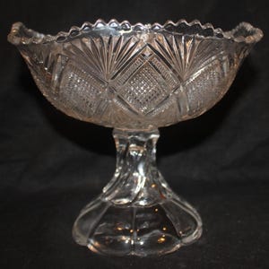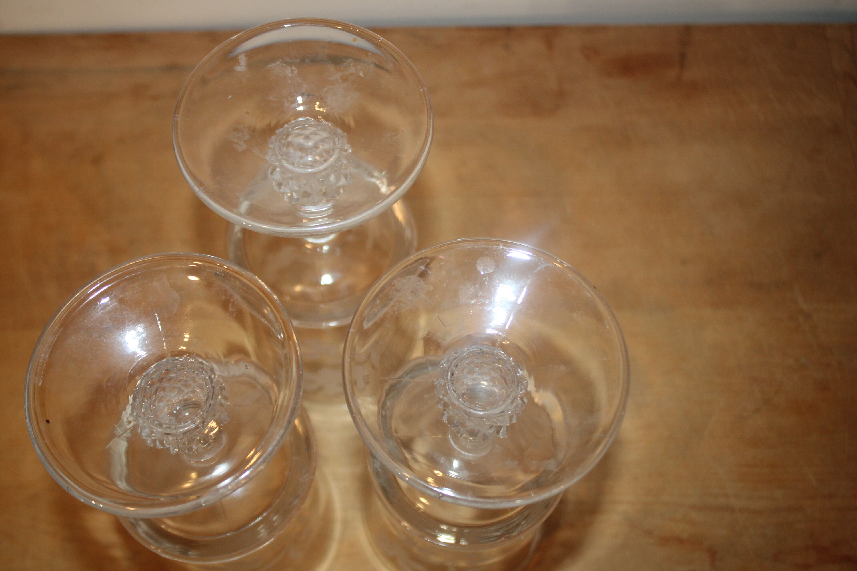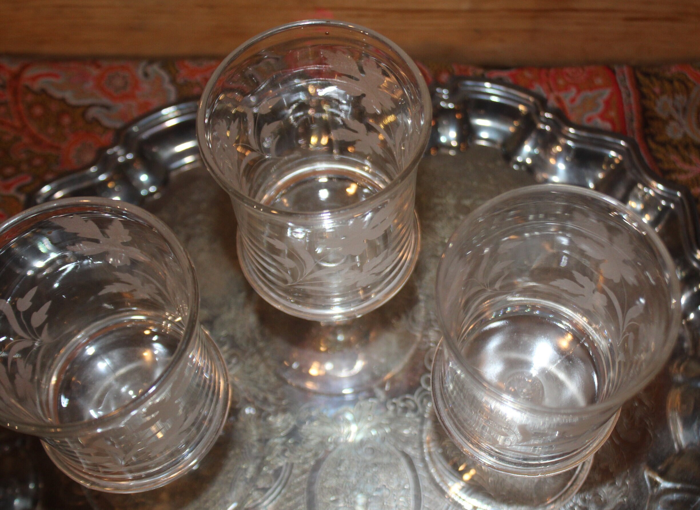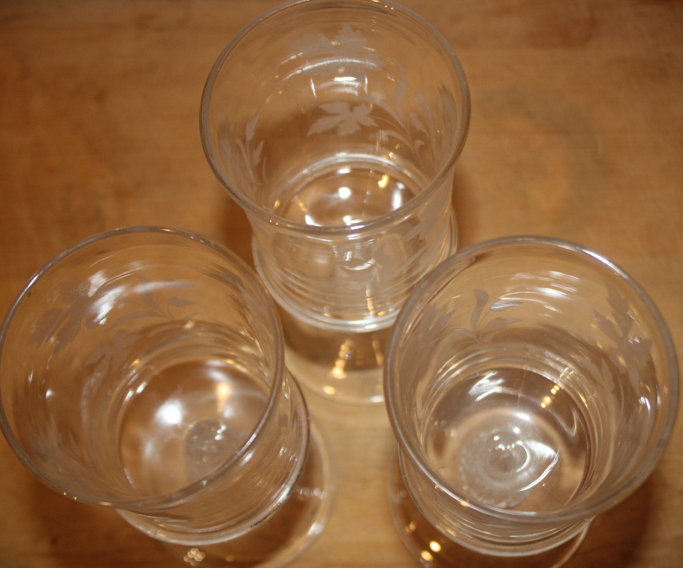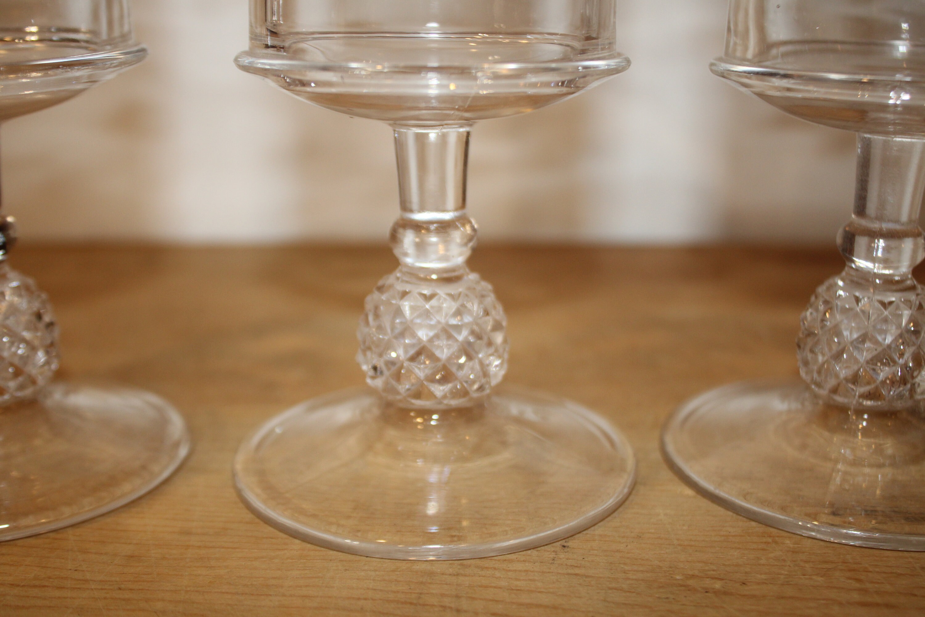 This Set of 3 EAPG Ripley Wine Goblets with Oak Leaves and Pineapple Stems from the late 1800's would be a lovely addition to your antique glass collection! The goblets have beautiful heavy pineapple pedestal bases supporting gorgeous etched glass tops. These glasses were made by the Ripley Company in Pittsburgh, Pa. They are approximately 7" tall x 3" in diameter. There are no chips or cracks. Please message us if you have any questions- Thanks for looking!