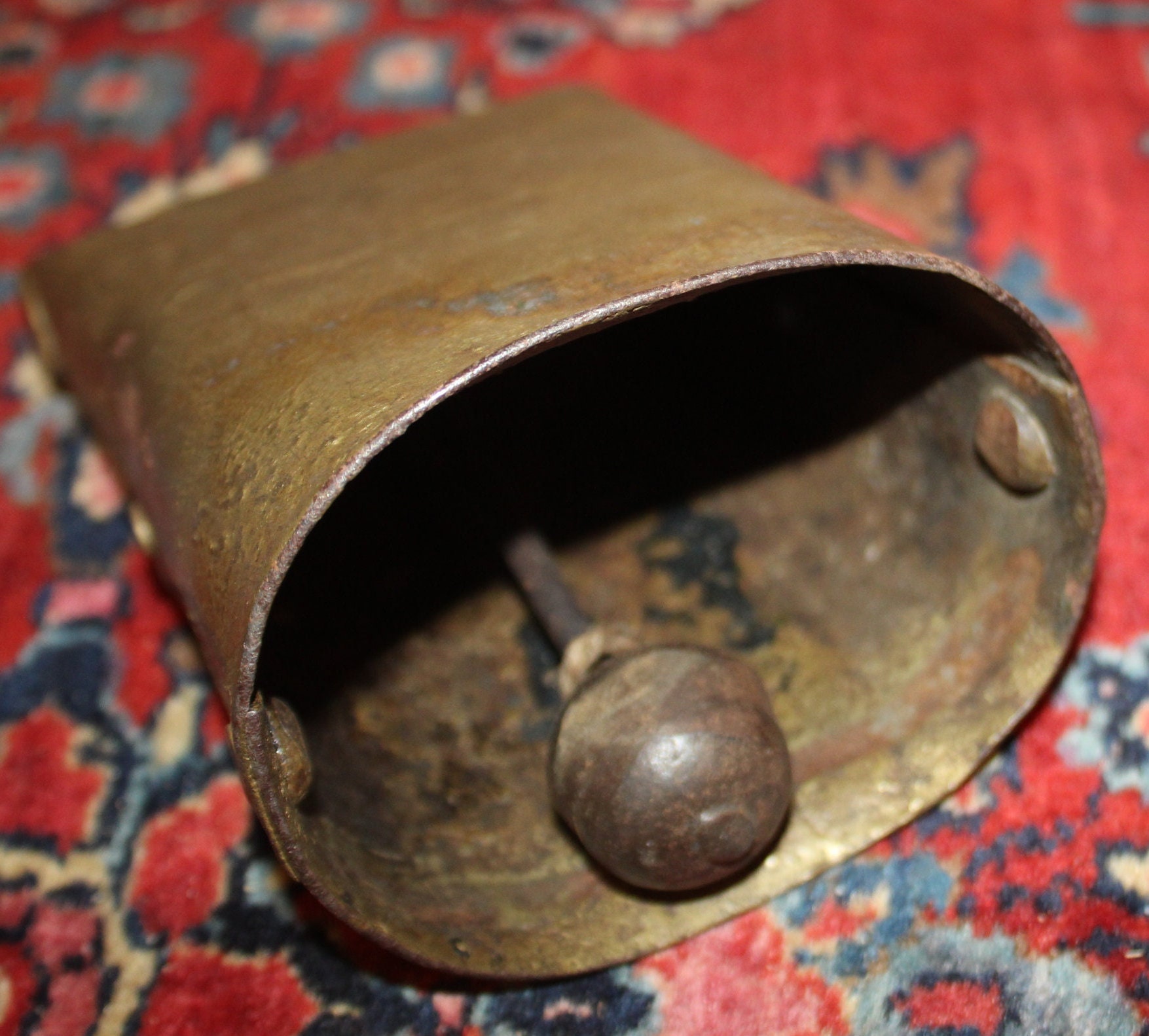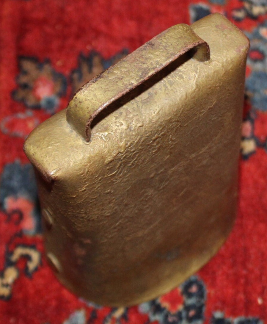 This Antique Gold-painted Iron Hand Hammered Cow Bell would be a great addition to your farm house decor! The iron is hand hammered and has a gorgeous patina- the clapper is original and sounds fantastic! It is 6.5"x 4"x 3"(at the base). Please message us if you have any questions-Thanks for looking!