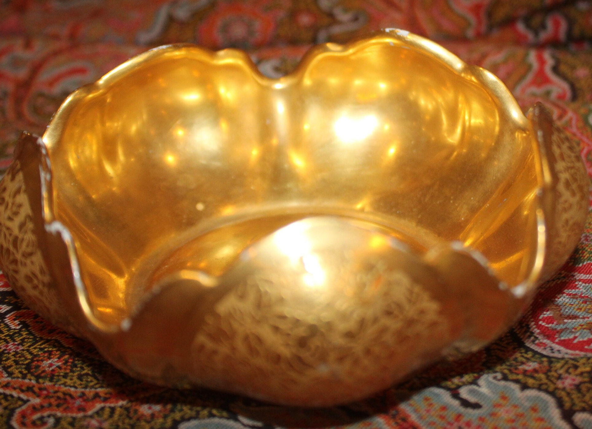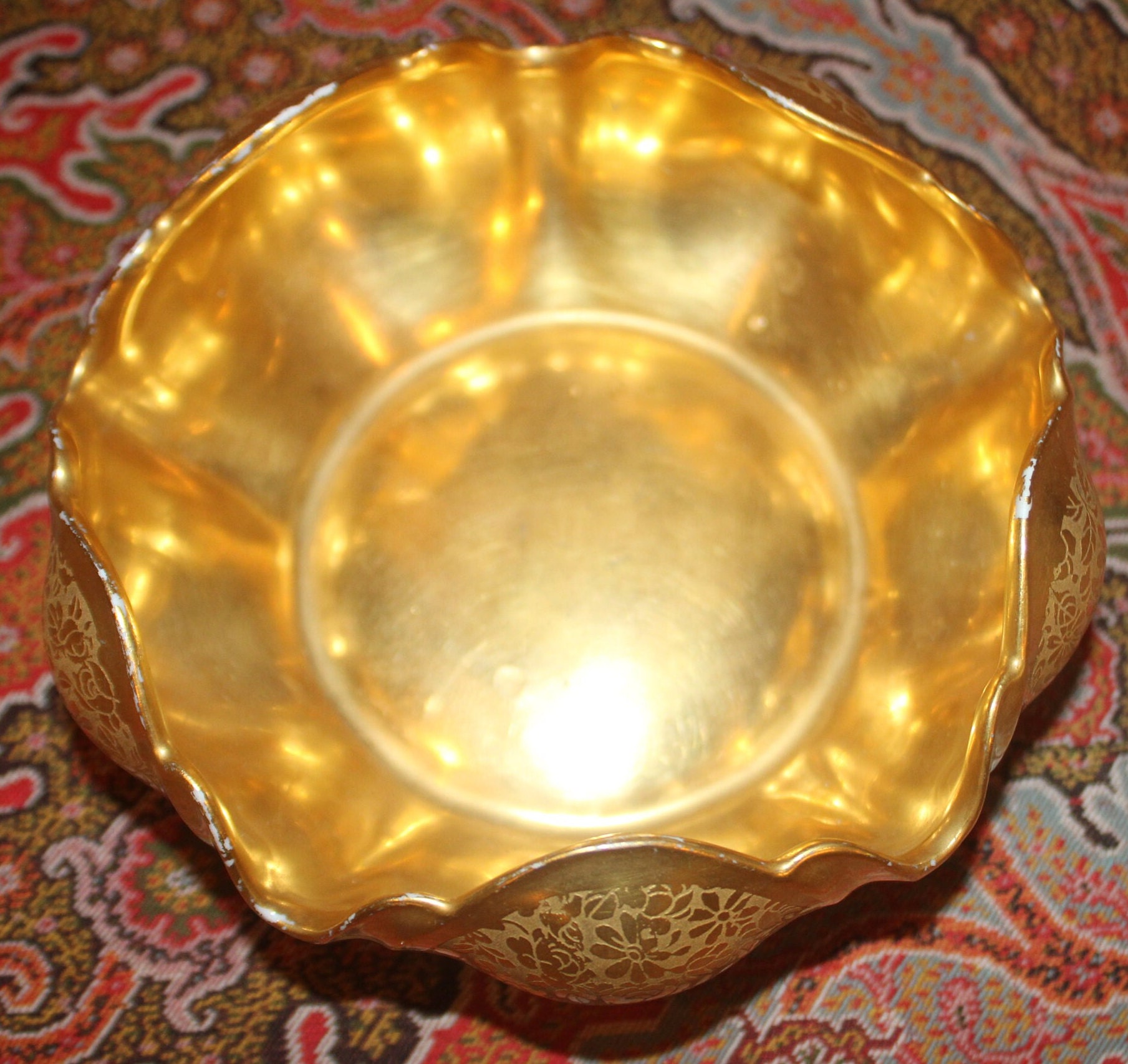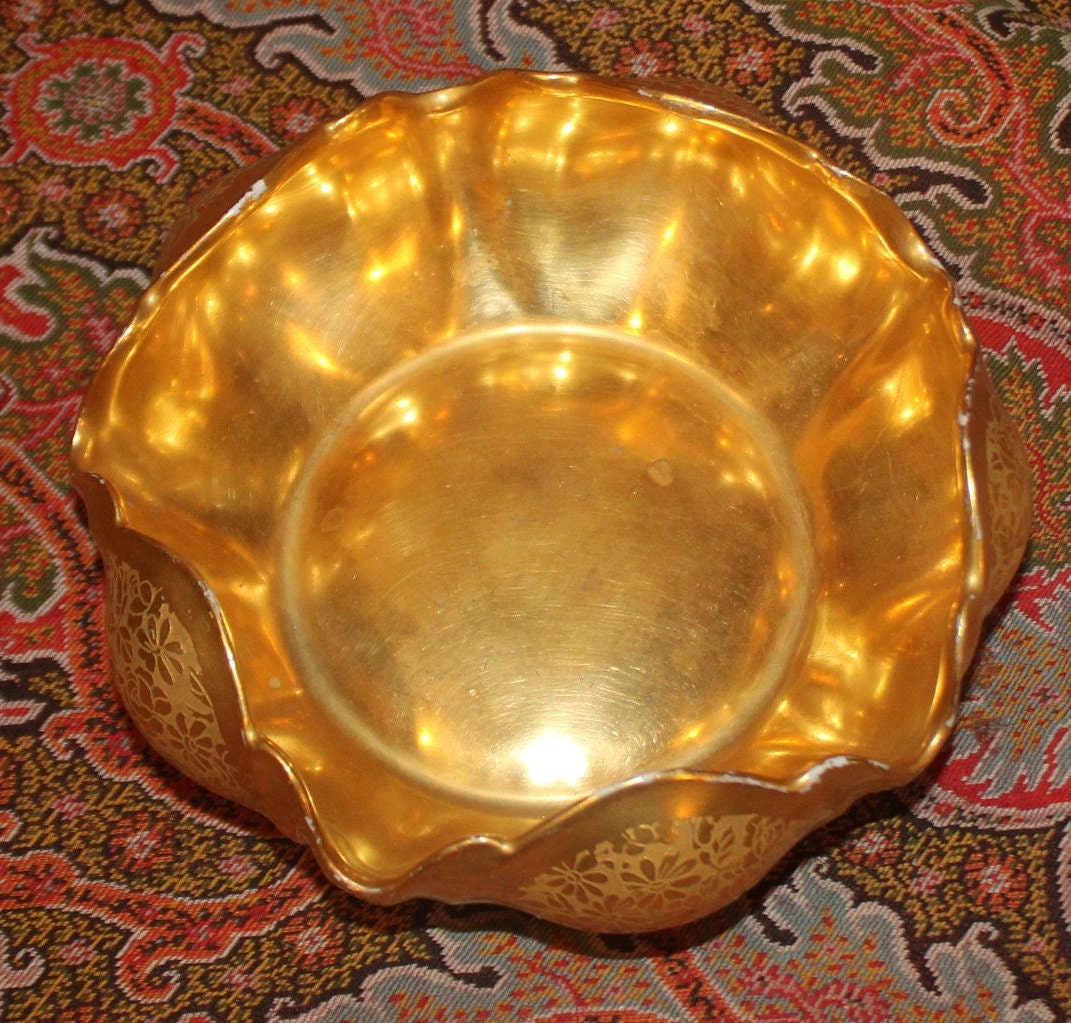 This Fabulous Gold Floral Chintz RS Germany Art Nouveau Trinket Dish is gorgeous! The hand painted gold (attributed to Pickard) is brilliant in color; the floral pattern and scalloped edge are stunning. It measures 4.5" in diameter x 2" tall-It is the perfect size to hold jewelry on a bedside table. There is minor paint loss to the scalloped edge which is reflective of age; there are no chips or cracks. Please message us if you have any questions- Thanks for looking!