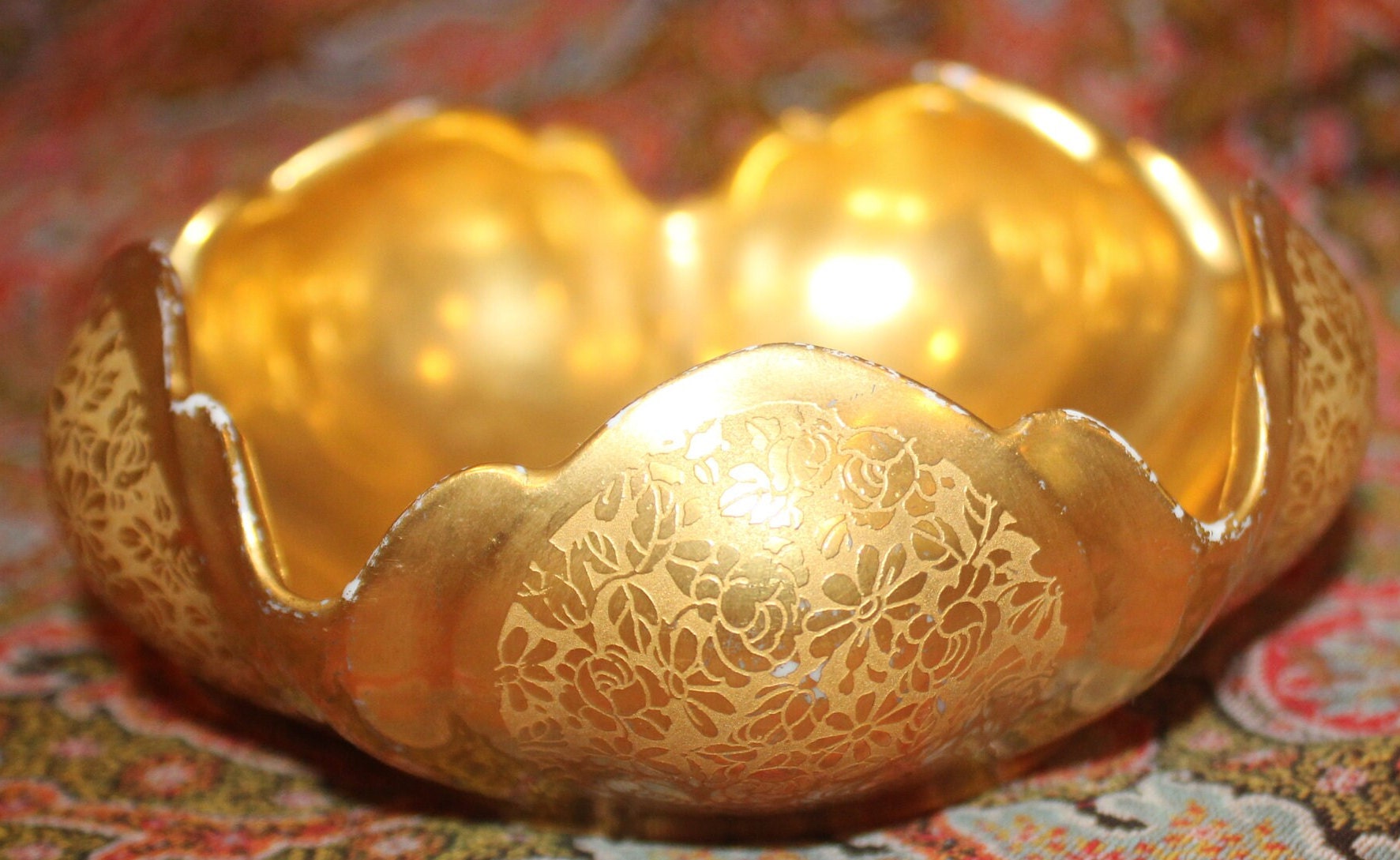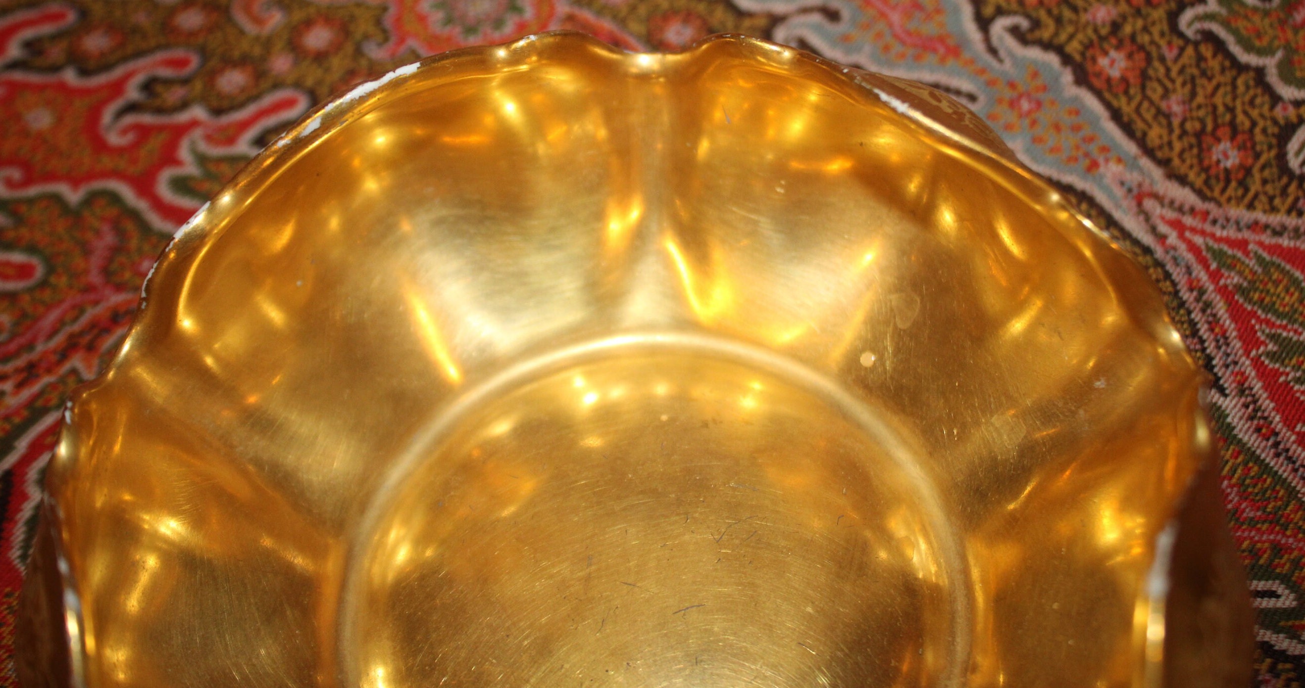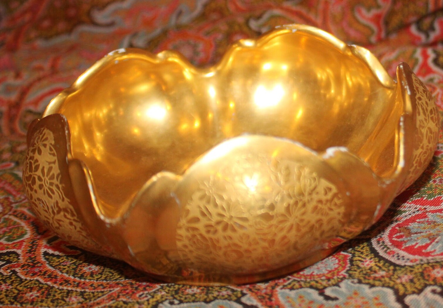 This Fabulous Gold Floral Chintz RS Germany Art Nouveau Trinket Dish is gorgeous! The hand painted gold (attributed to Pickard) is brilliant in color; the floral pattern and scalloped edge are stunning. It measures 4.5" in diameter x 2" tall-It is the perfect size to hold jewelry on a bedside table. There is minor paint loss to the scalloped edge which is reflective of age; there are no chips or cracks. Please message us if you have any questions- Thanks for looking!