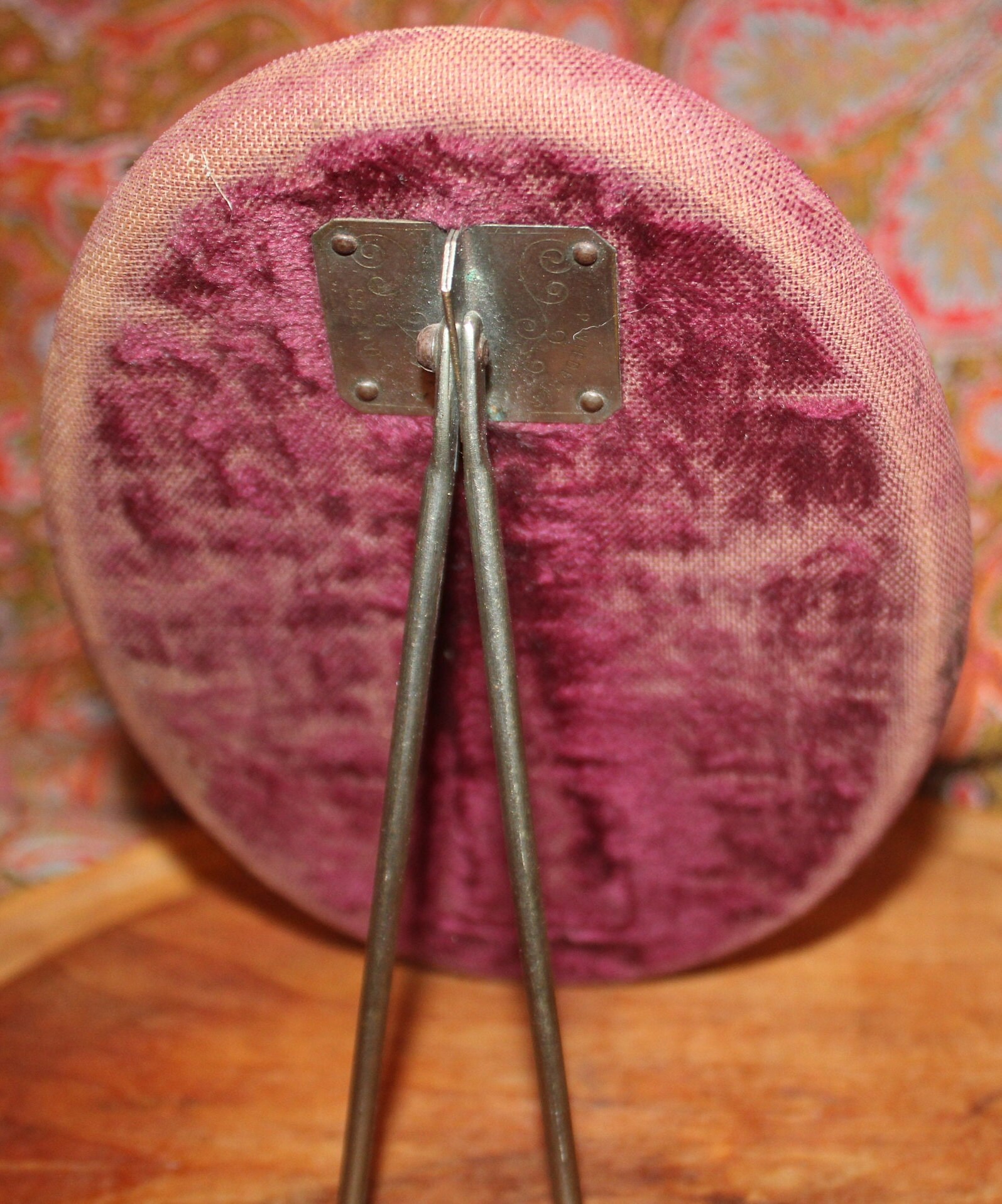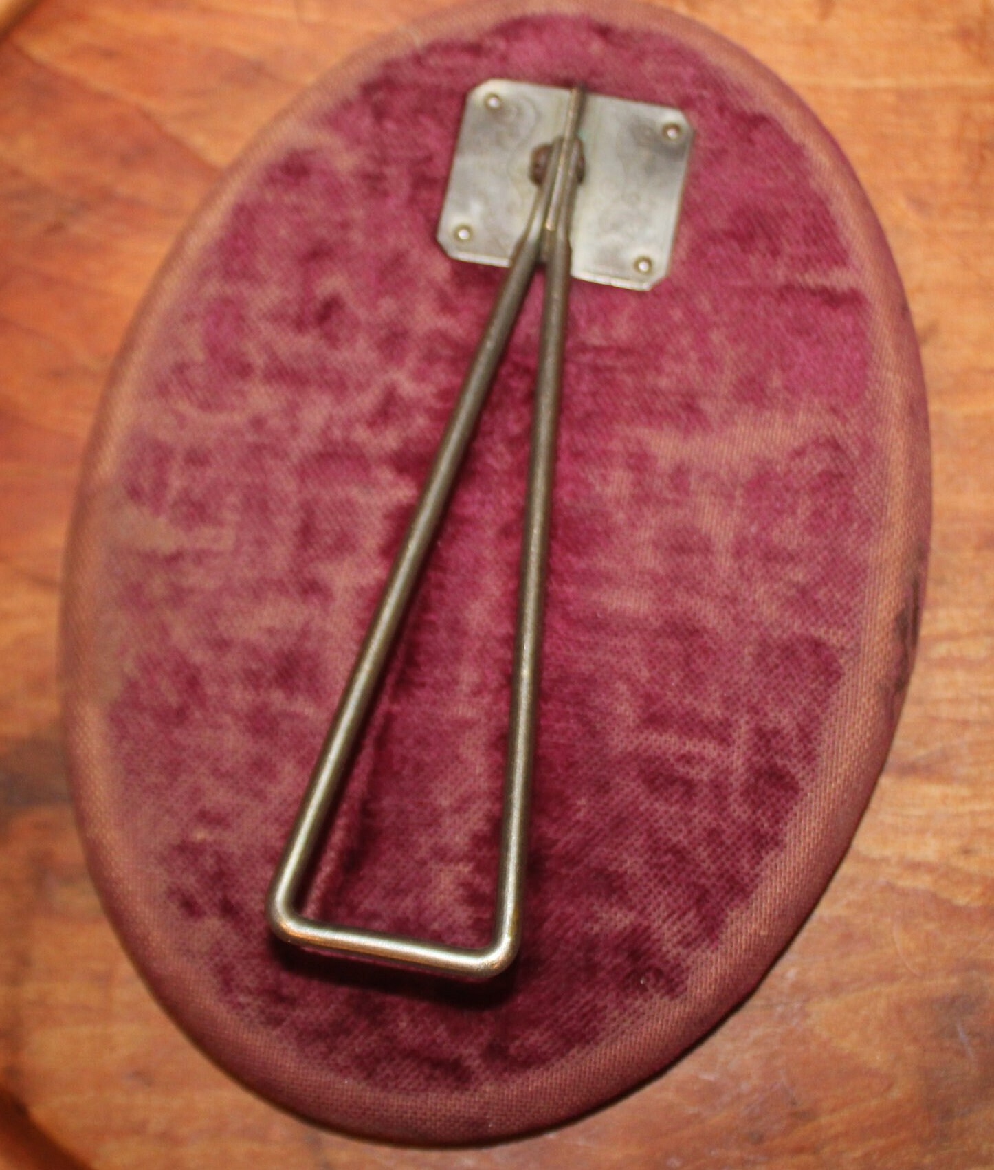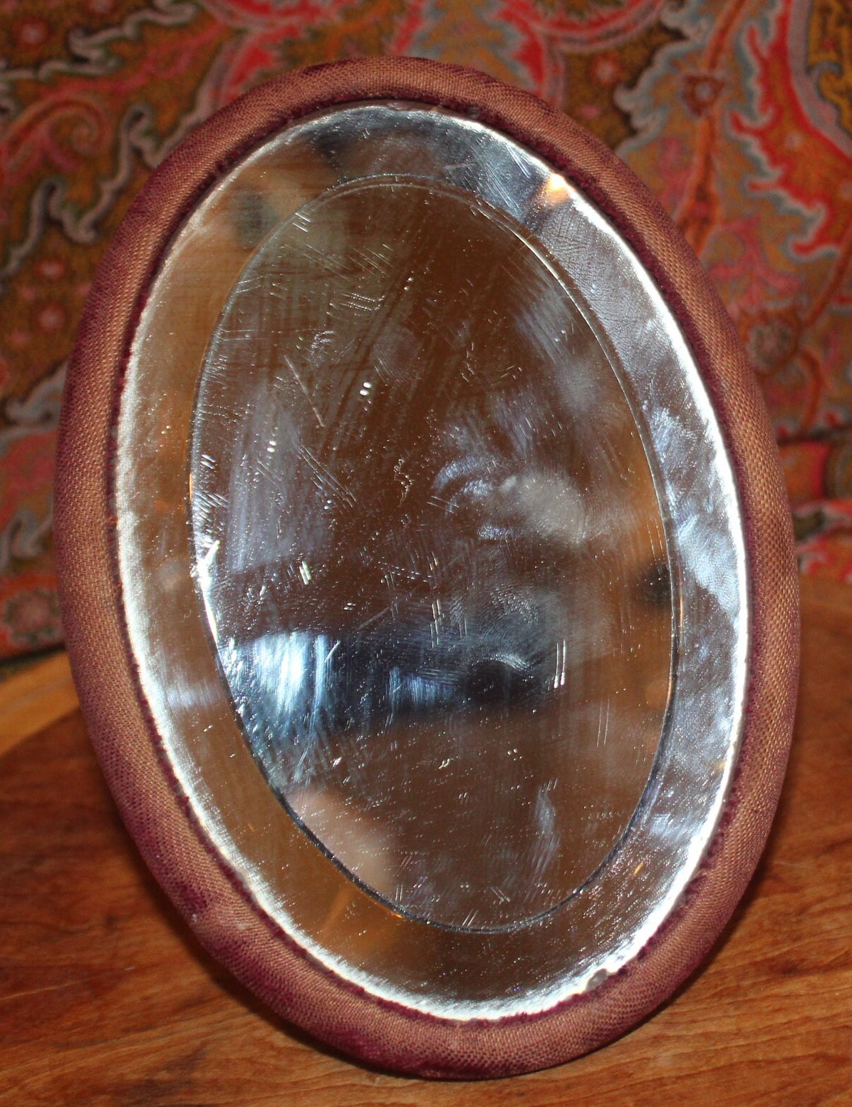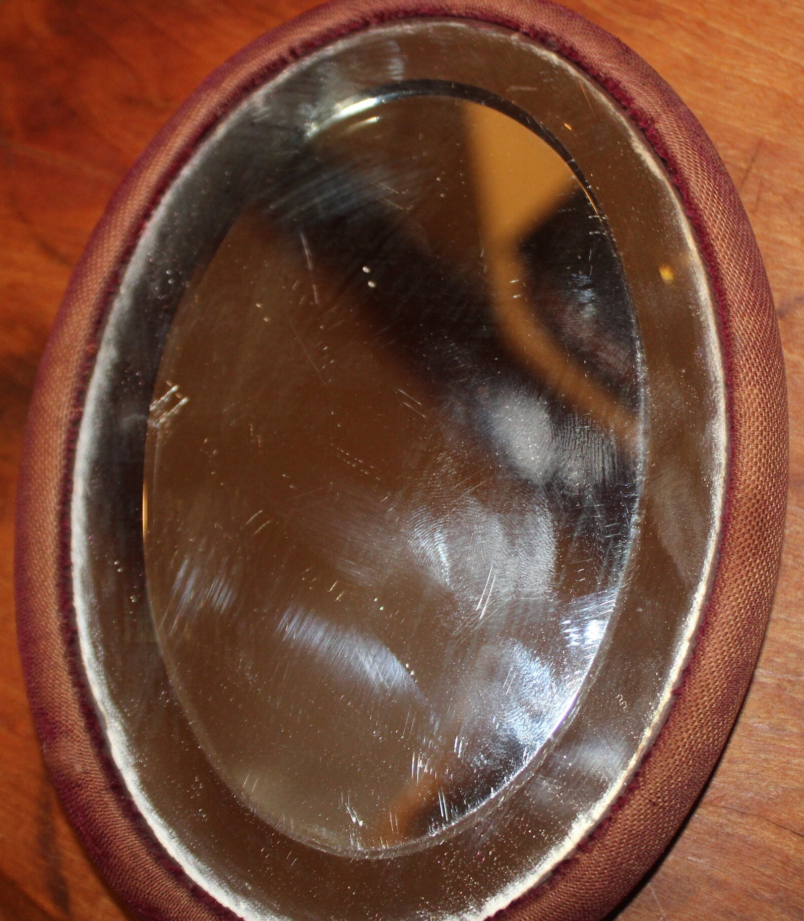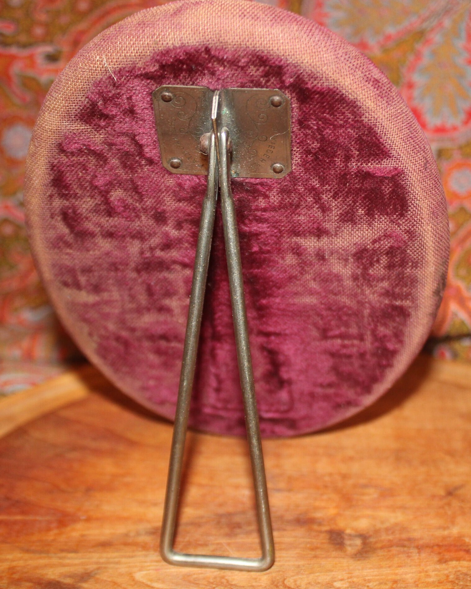 This Wonderful Velvet free-standing Beveled Glass Victorian Oval Mirror would be a lovely addition to any decor! It would look beautiful on a French farmhouse vanity; the antique velvet has the perfect wear only age and time can bring (please see photos). It is marked "patd Jan. 2 83 P. Wiederer" The fabric has no tears; the glass reflects perfectly (it has a tiny bit of silver loss near the frame edges); the metal mirror stand is very sturdy. The mirror is 5" wide x 7 in length. Please message us if you have any questions- Thanks for looking!