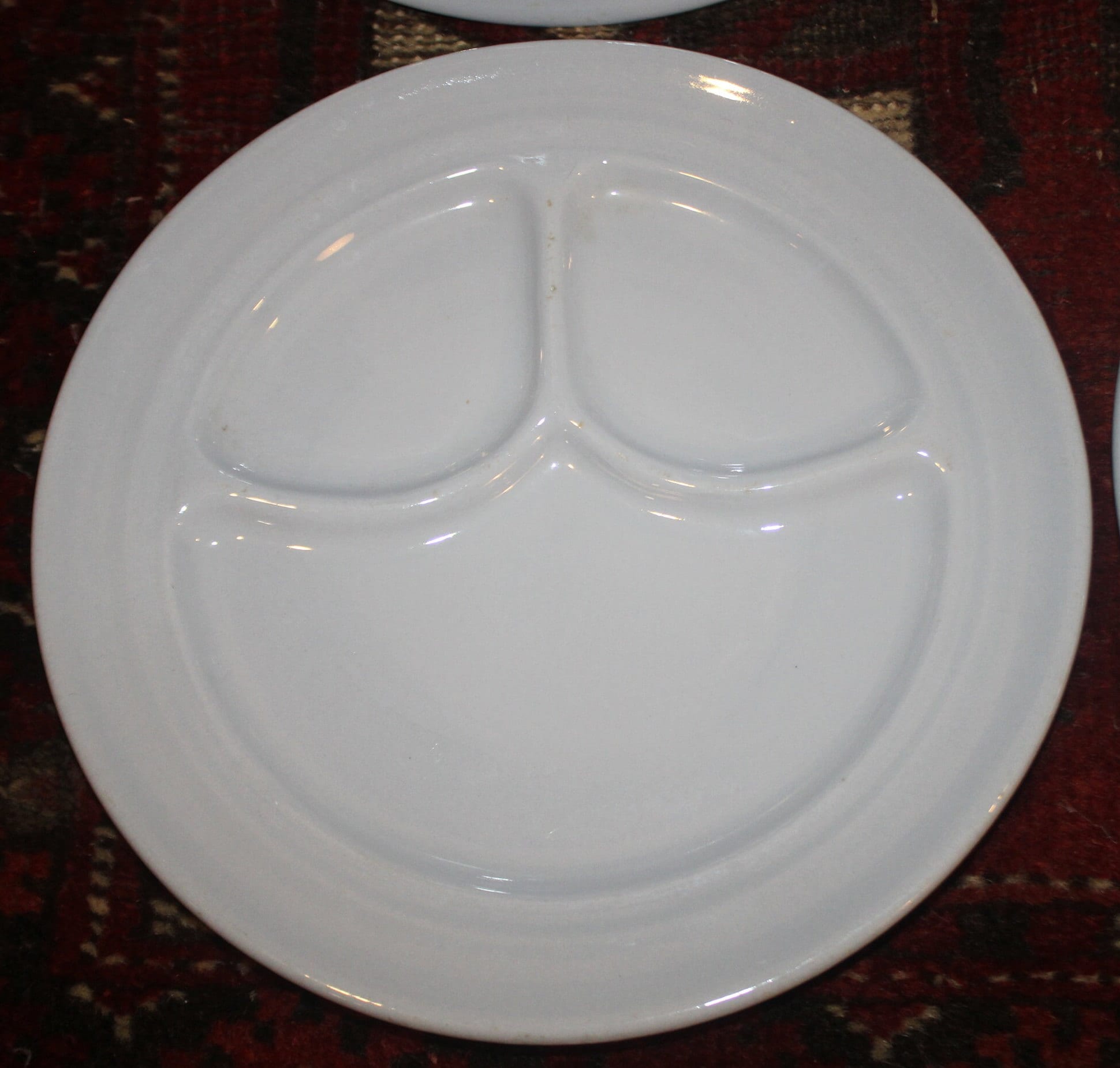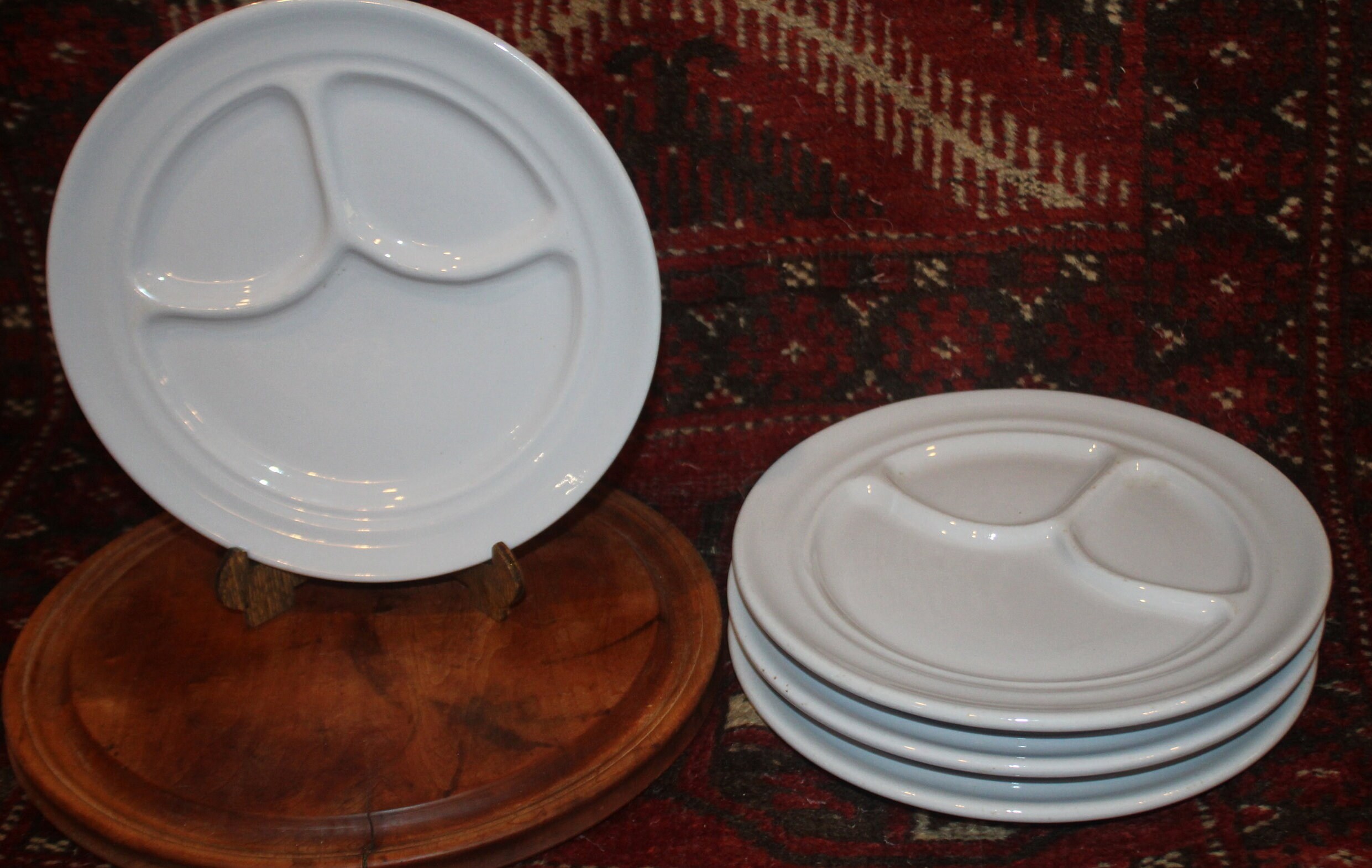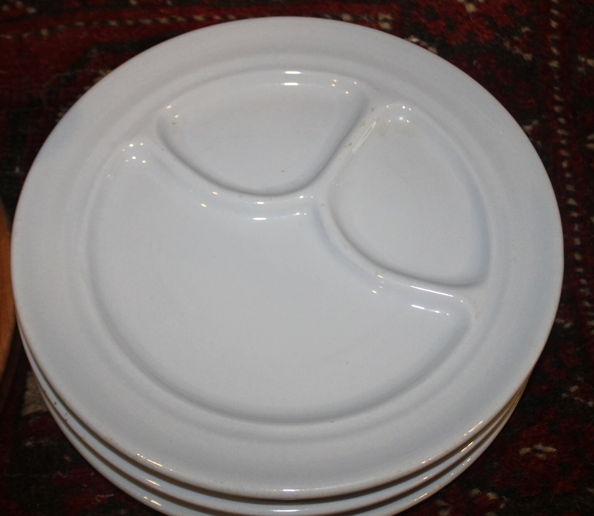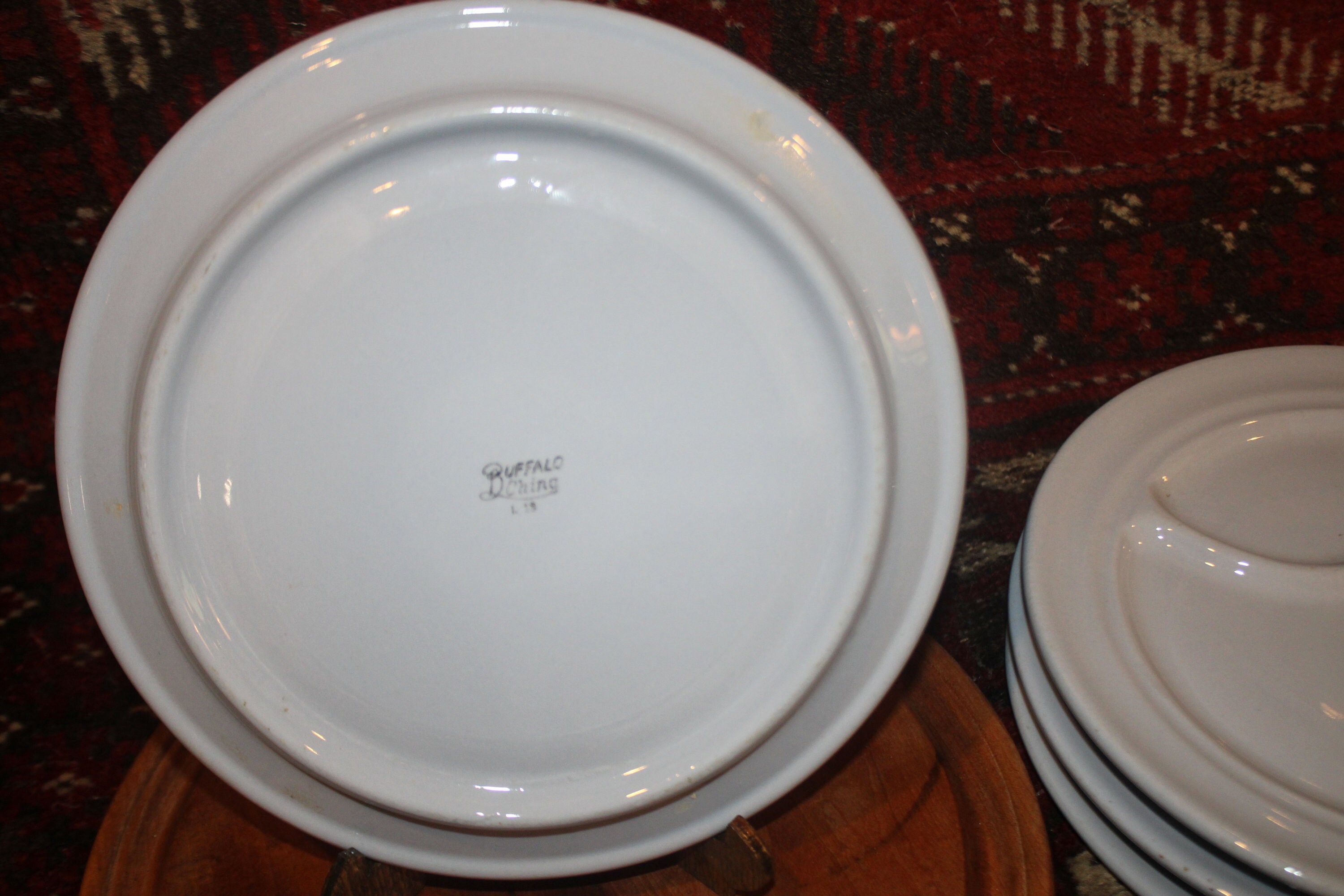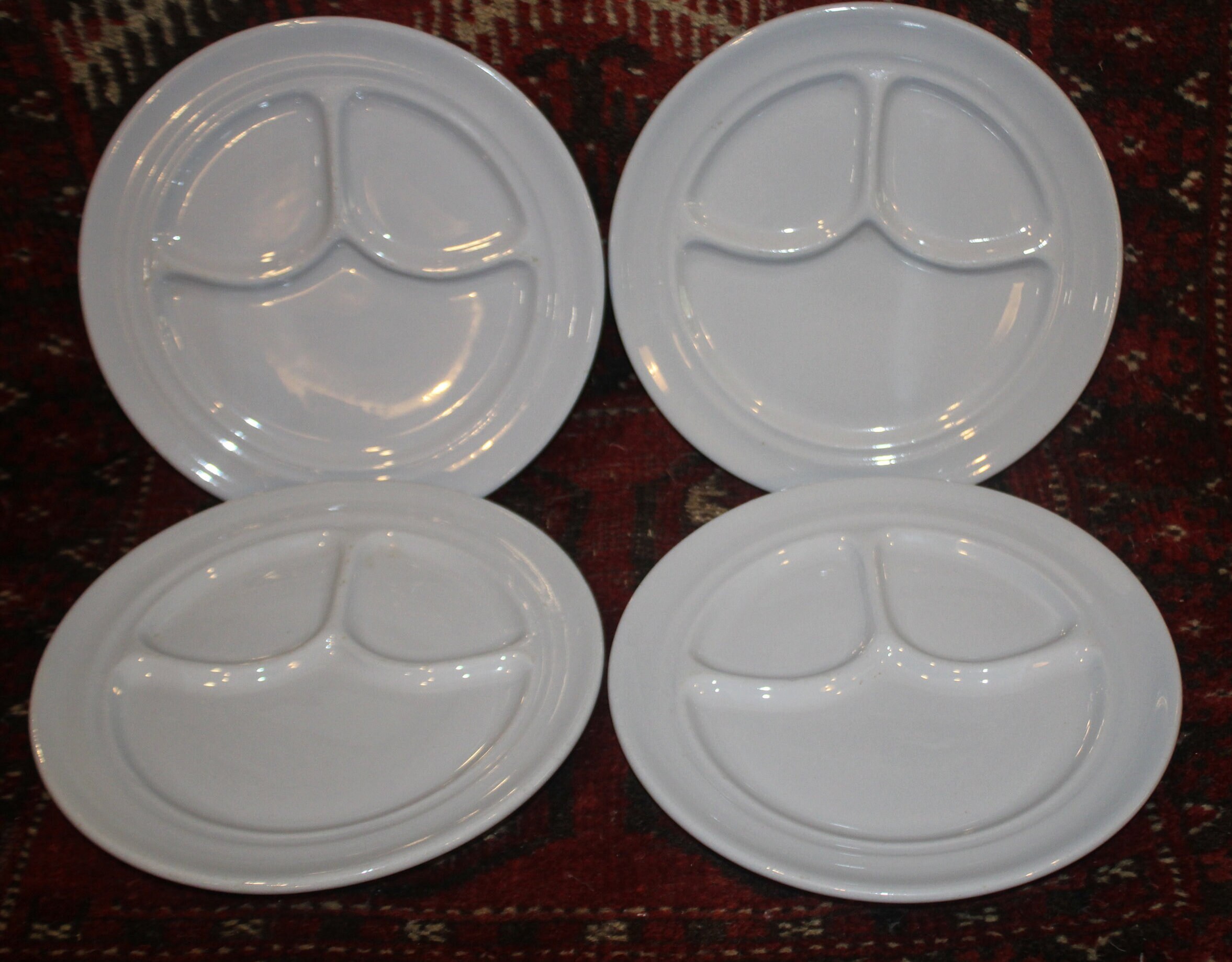 This Wonderful Set of 4 Buffalo China Lune ware/ Periwinkle Blue Divided Grill Plates would be a great addition to your table! They are very heavy duty for every day use and the perfect size- They are 9.5" in diameter. There are no chips or cracks. Please message us if you have any questions- Thanks for looking!