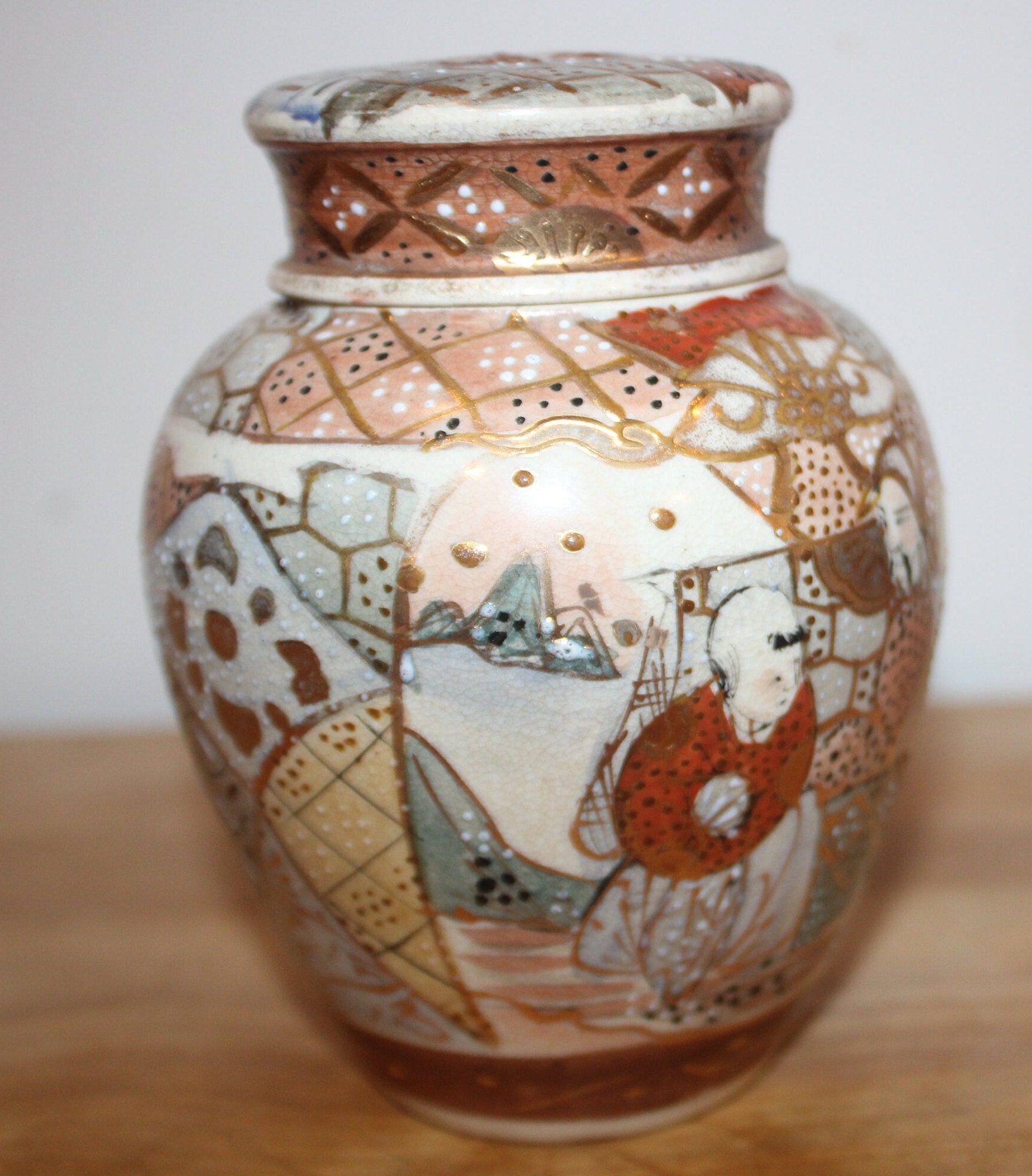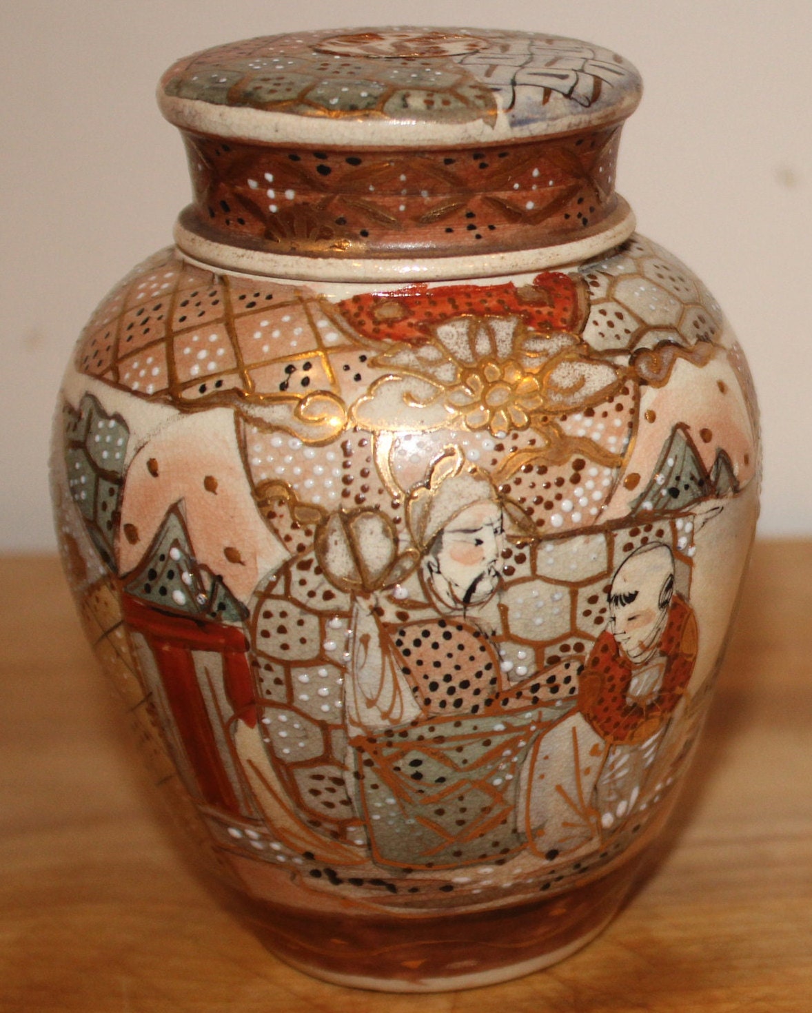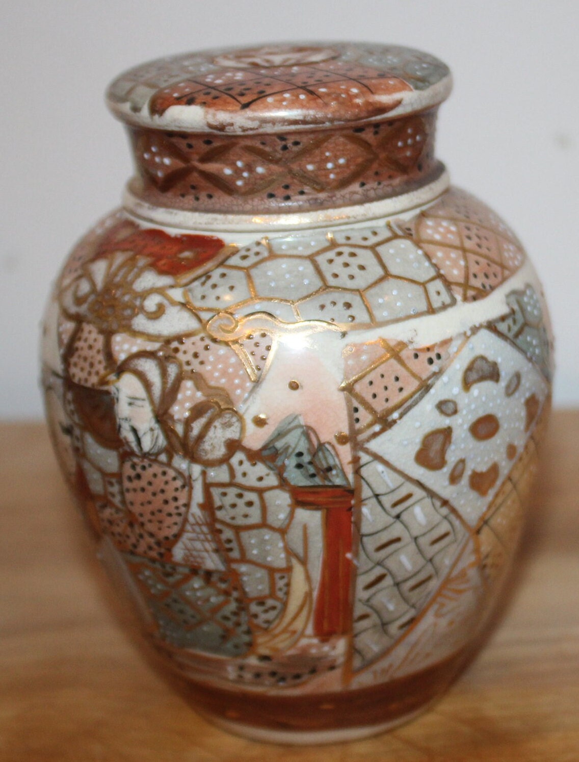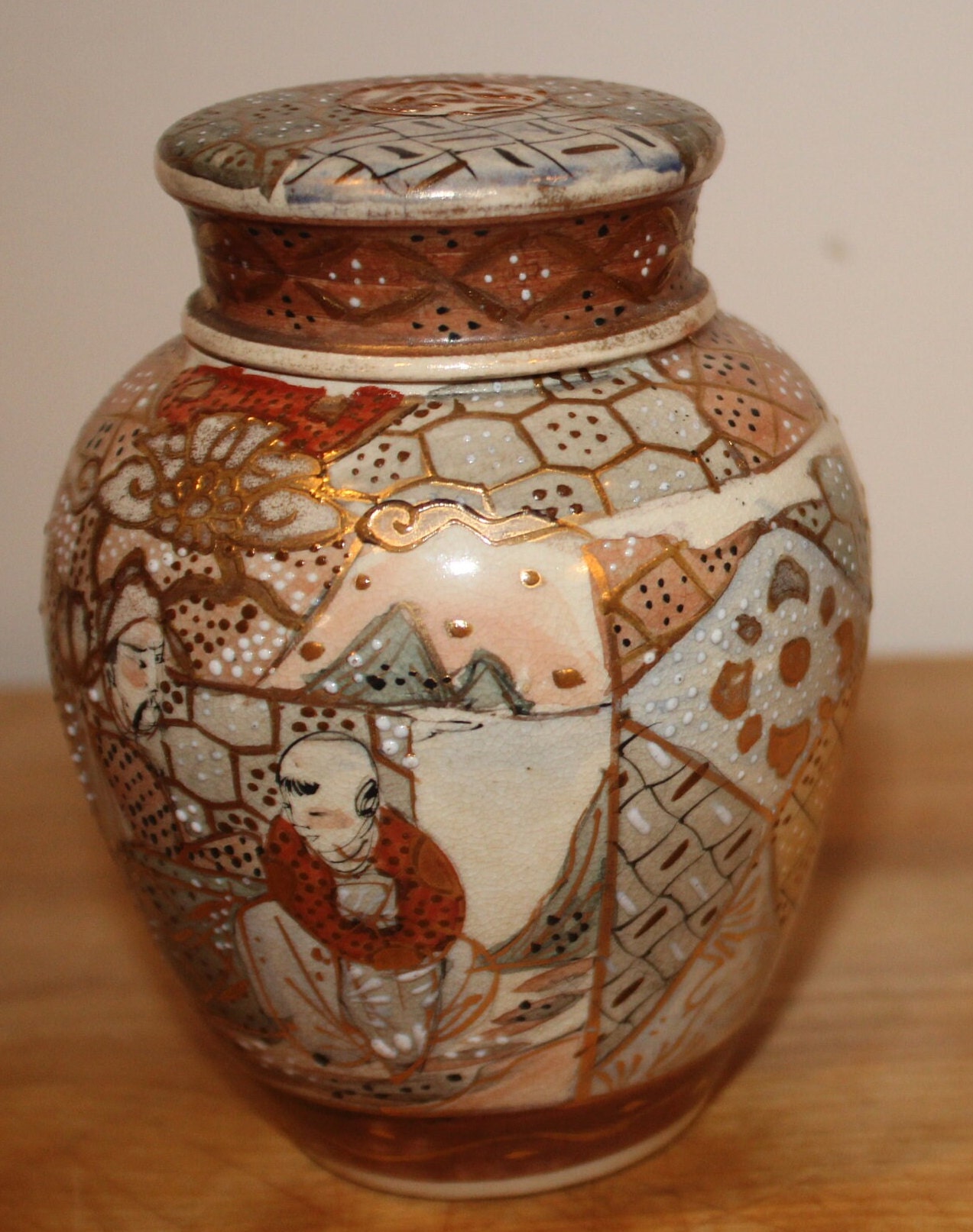 Handpainted Japanese Satsuma Ginger Jar with Lid - Signed Moriage Art