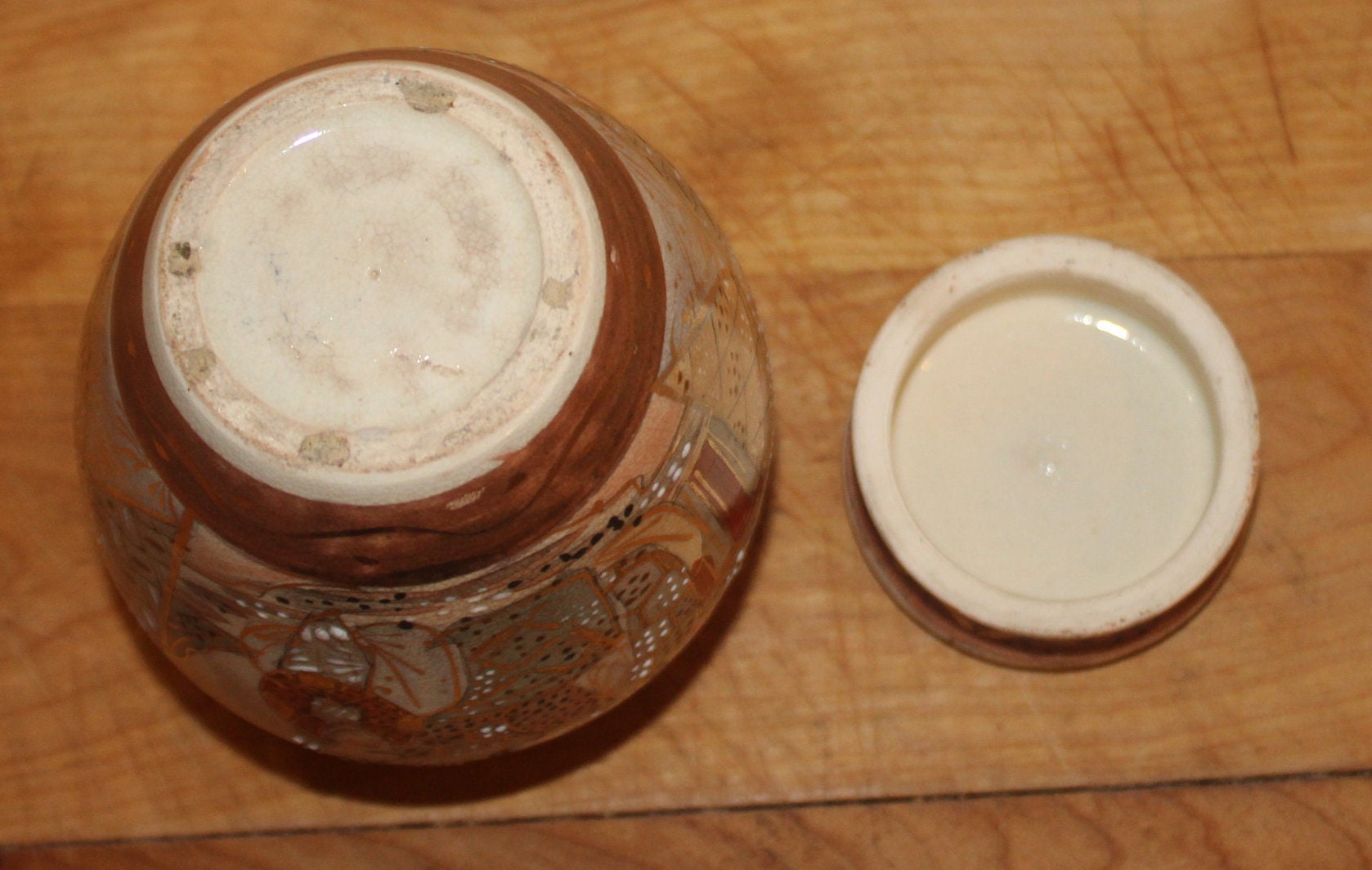 This Gorgeous Hand painted Japanese Satsuma Moriage Ginger Jar is available to you! The lid and upper lip of the jar are signed by the artist- the detailed intricate art work is beautiful!! The jar stands 5" tall with a 3.5" diameter; there is a very tiny chip to the inside of the rim which is difficult to see. Please message us if you have any questions- Thanks for looking!