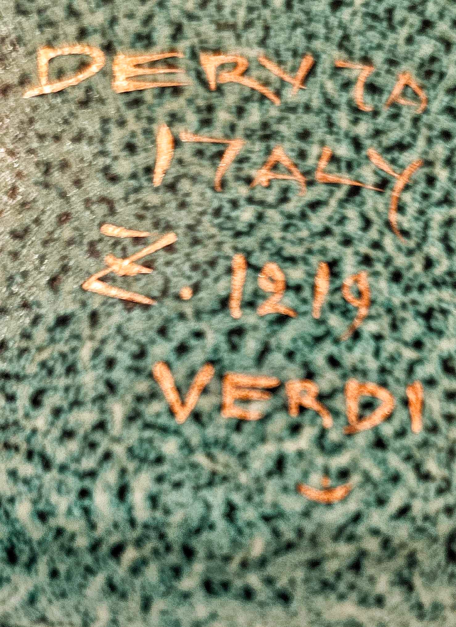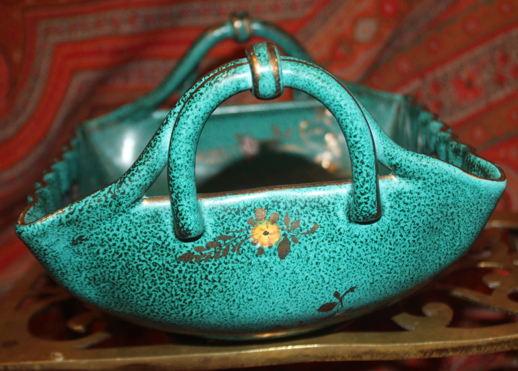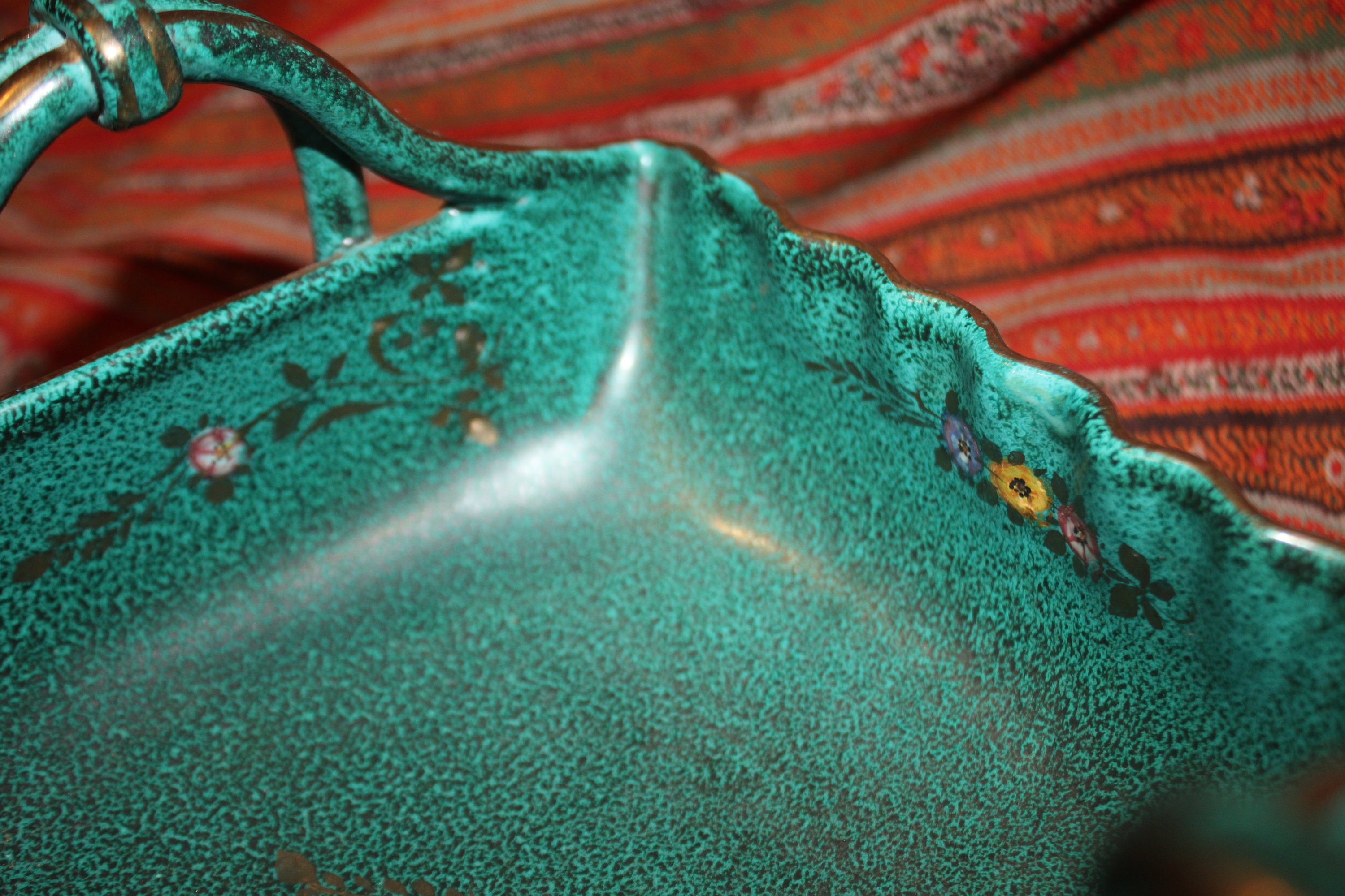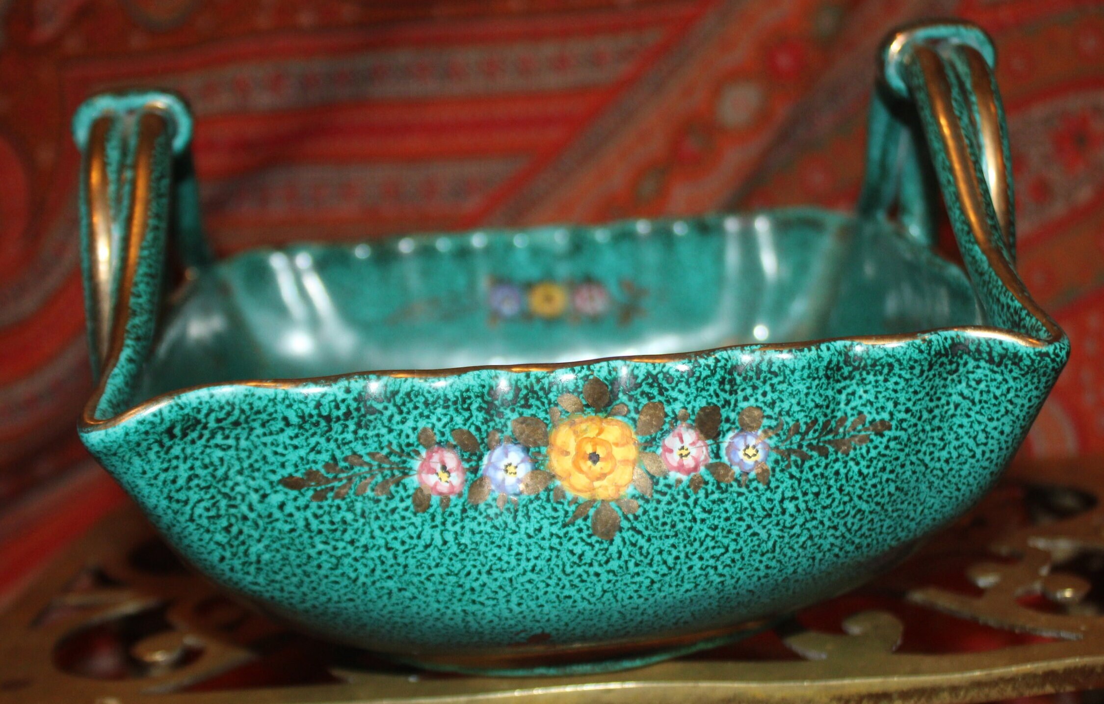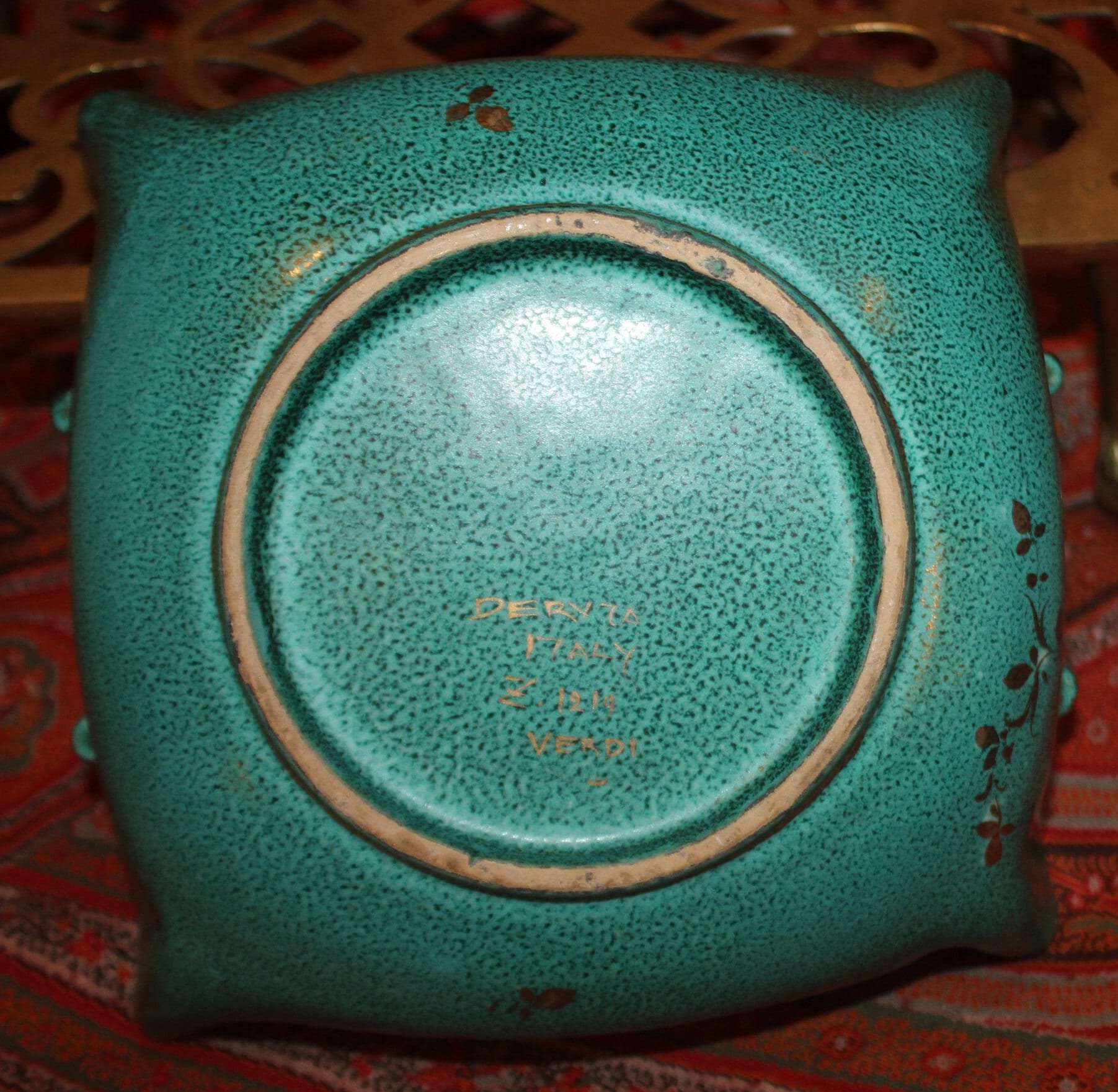This Art Nouveau Majolica Deruta Pottery Green Console Bowl with Hand painted Flowers and Gold Gilt is available to you and would be a beautiful piece to add to your collection! The delicate flowers are intricately hand painted; the gold gilt trim is gorgeous! The square bowl is 7" wide x 2.75" deep- There are no chips or cracks. The base of the bowl is marked "Deruta Italy z1219 Verdi". Please message us if you have any questions- Thanks for looking!