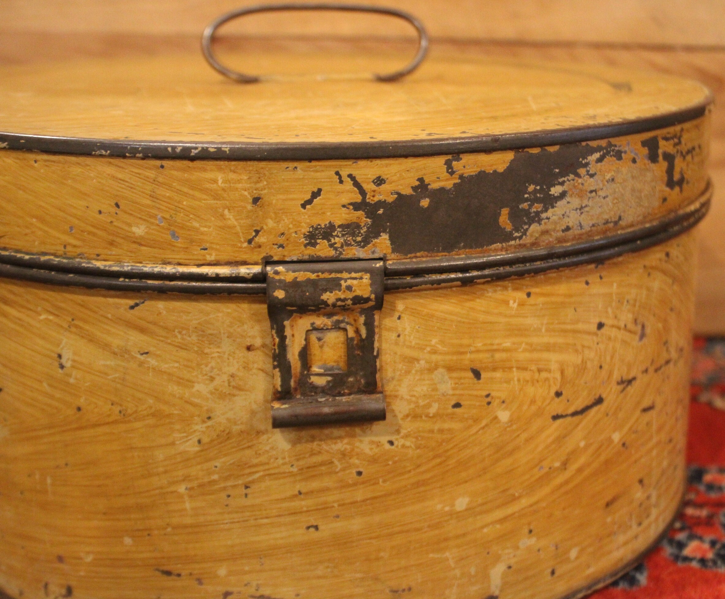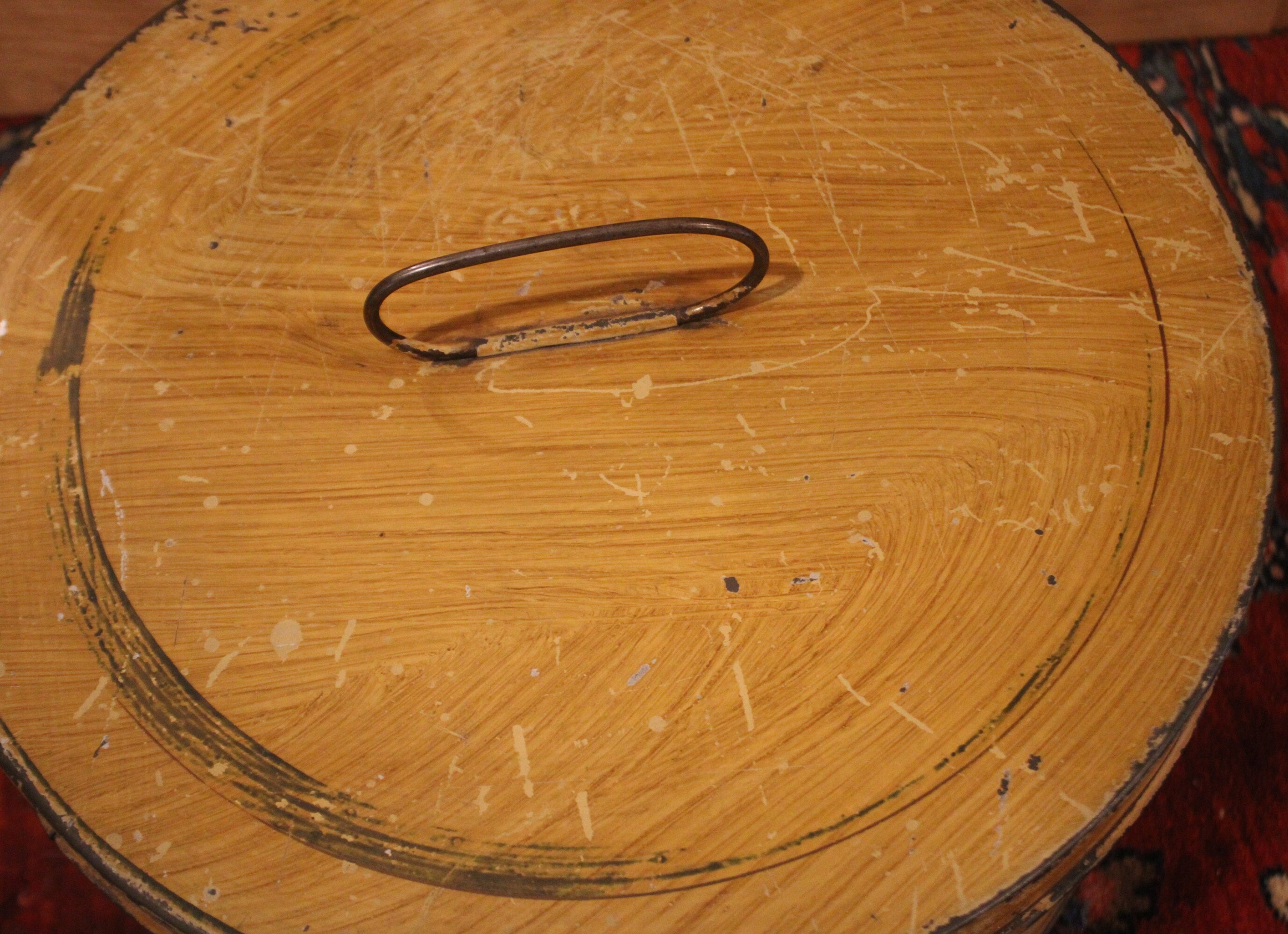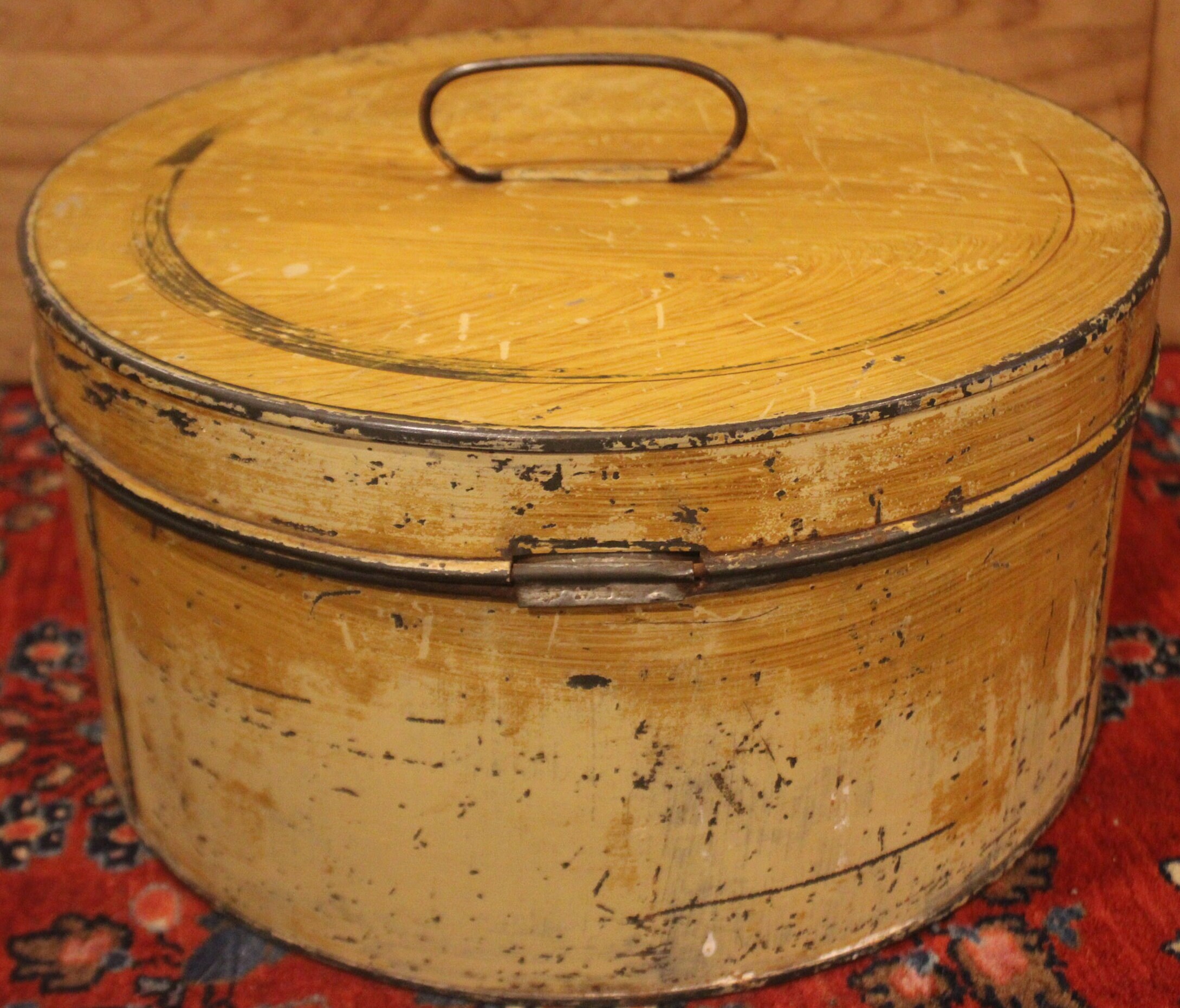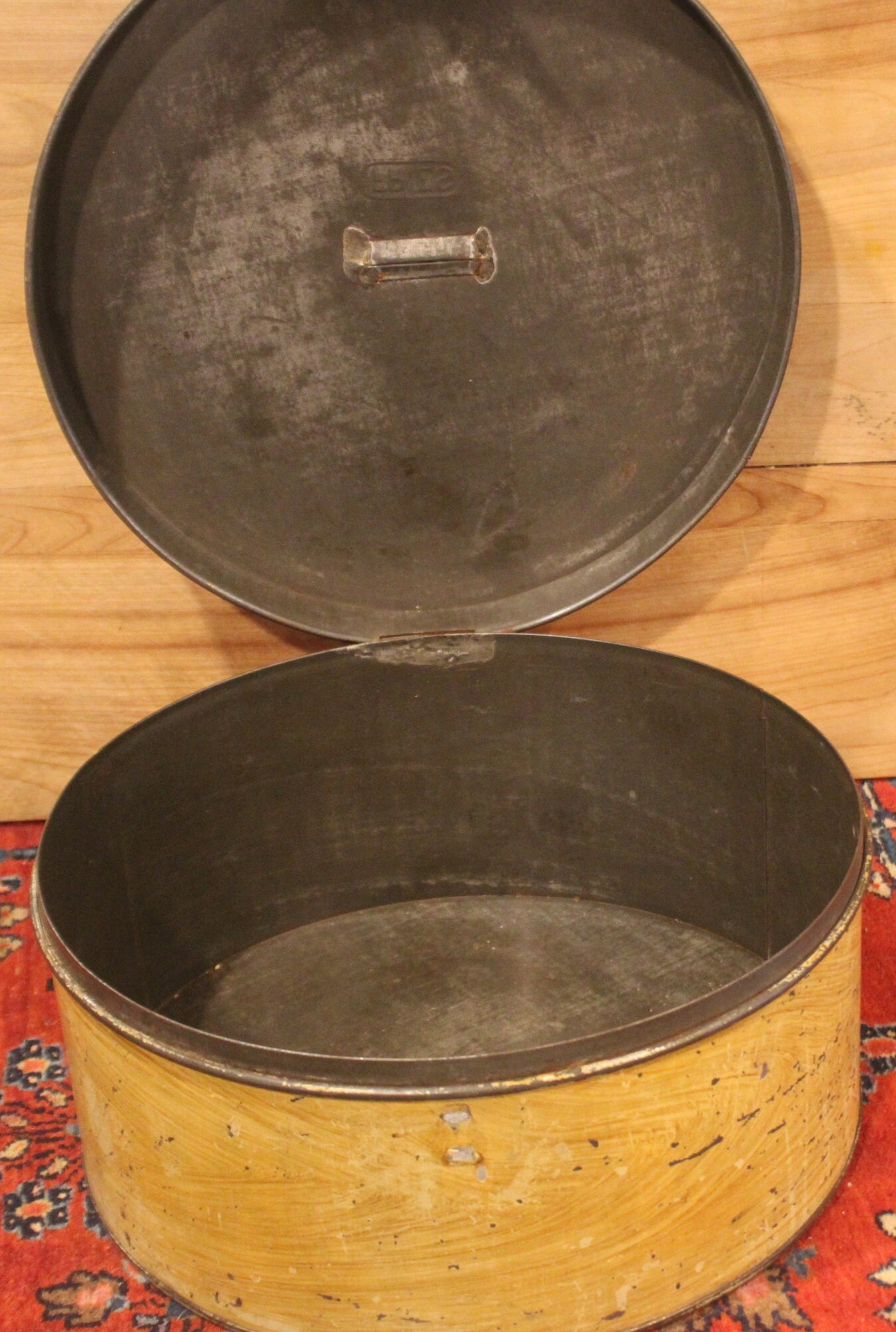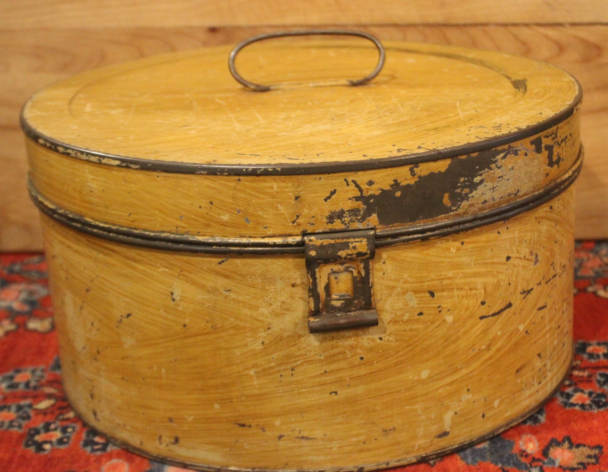 This Great Antique Round Tin "Fries" Spice Box in Mustard Paint would make a fantastic storage container in a farmhouse country kitchen! The mustard grain paint is gorgeous with wear to the paint in all the right places. It measures 13" in diameter x 7" in height; It is in wonderful condition with no dents- but the front latch is missing; the hinges work great. It would look darling accenting a country kitchen! Please message us if you have any questions- Thanks for looking!