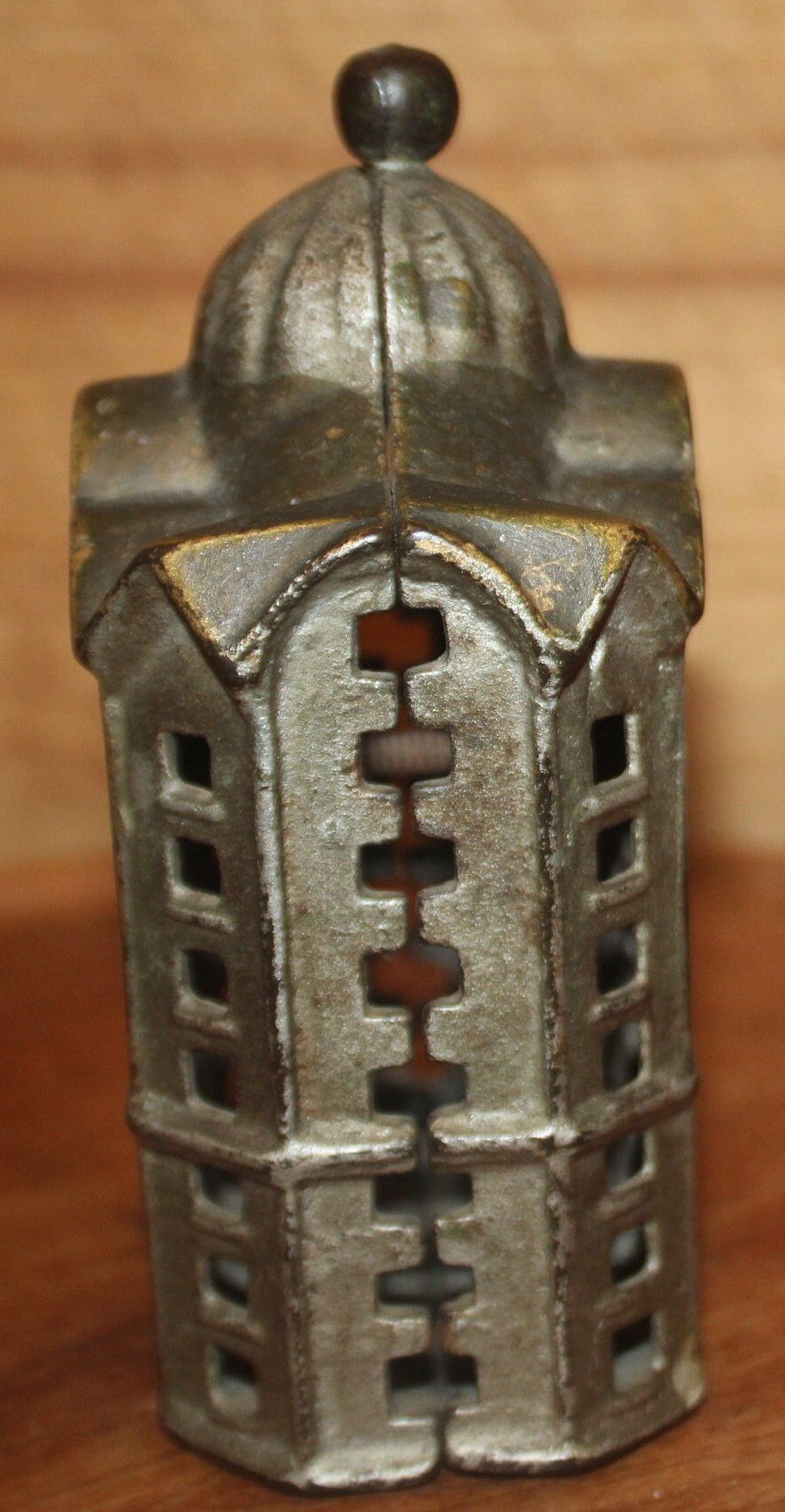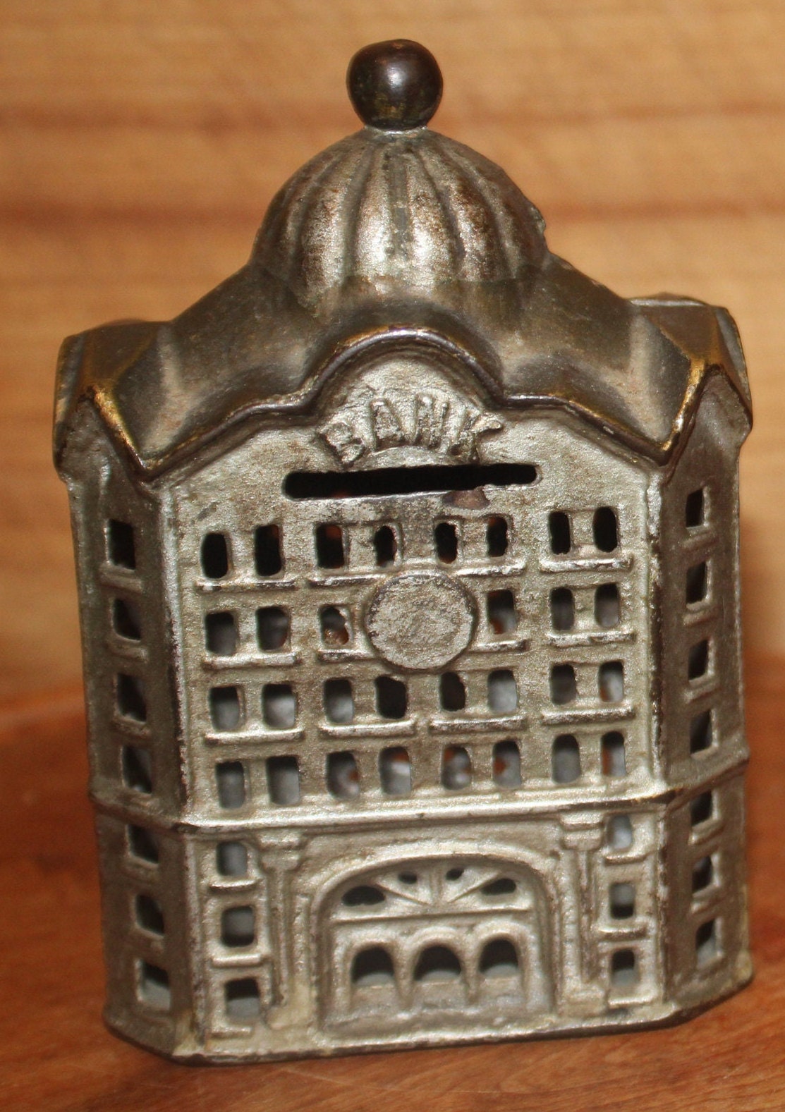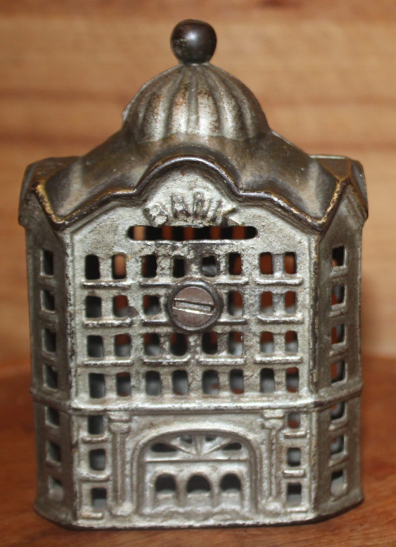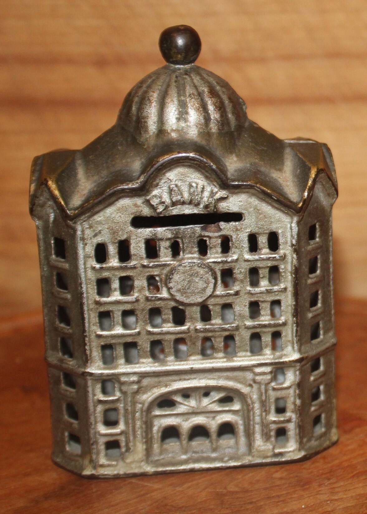 Wonderful A.C. Williams Cast Iron Coin Bank with Original Silver Paint-19th Century