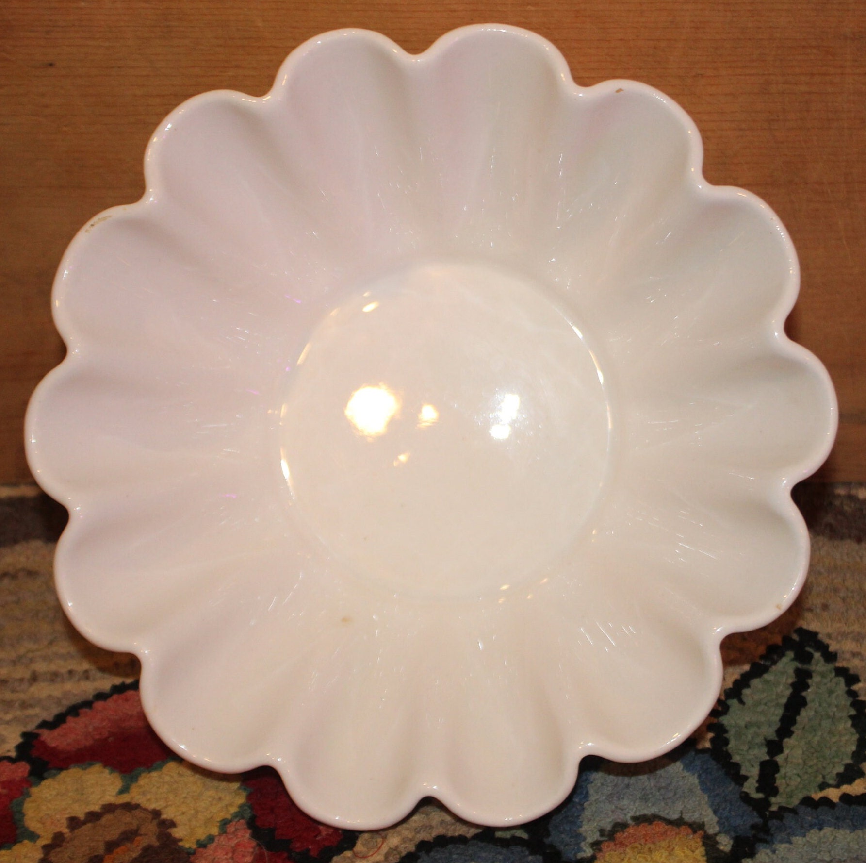 This Nice Vintage Large White Scalloped Porcelain Pudding Mold is so pretty- It would look great in a farmhouse kitchen! It is 8.25" in diameter x 3.25"tall and heavy like ironstone- with no chips, cracks, or hairlines. It is marked "Calif. USA Oven Proof". Please message us if you have any questions- Thanks for looking!