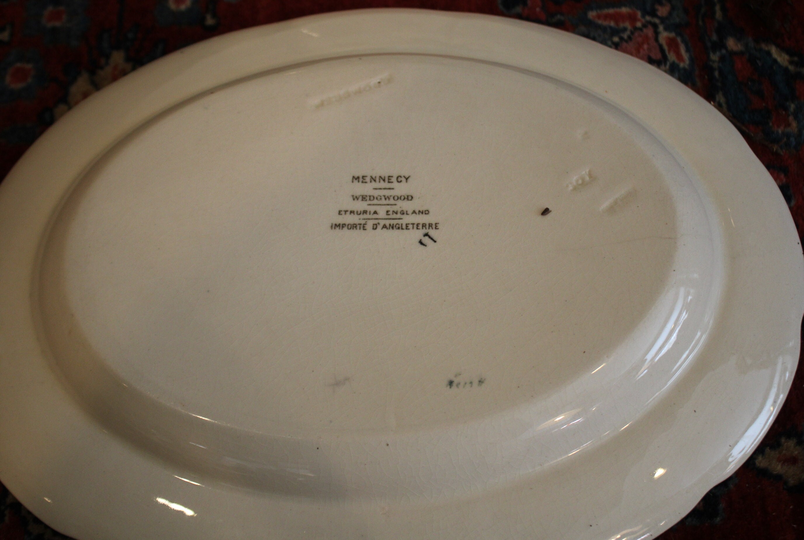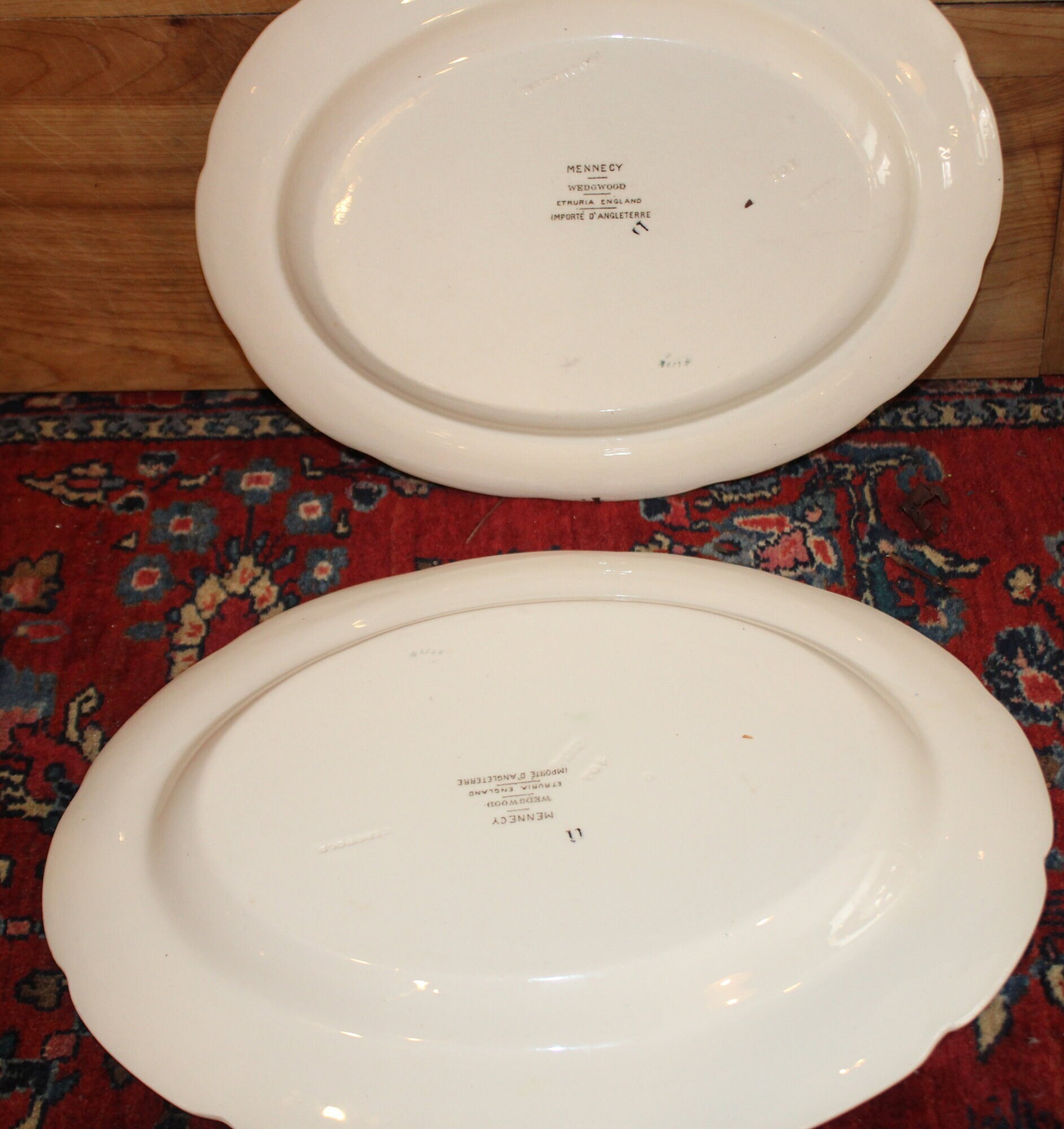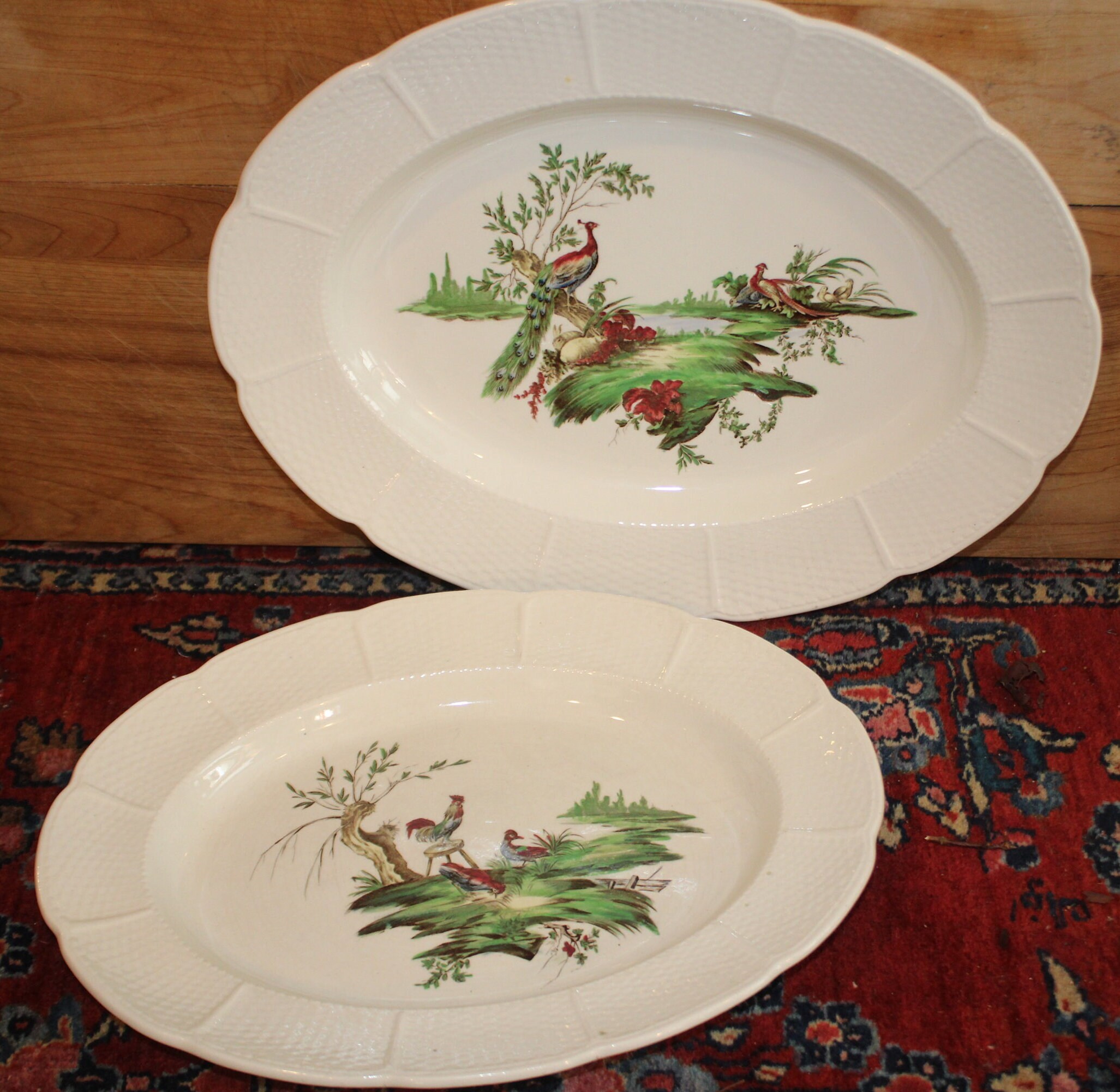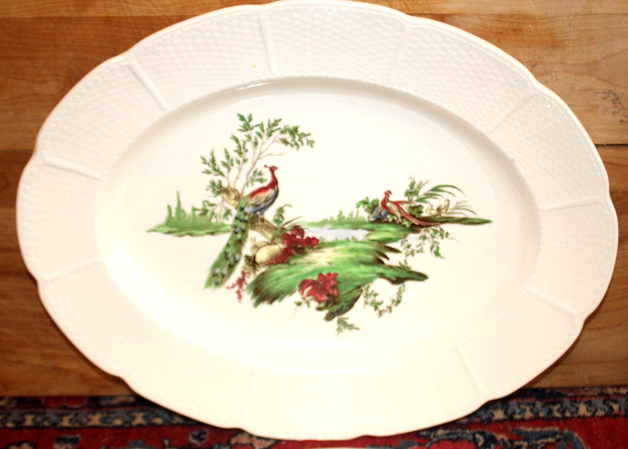 These Wonderful Vibrant Hand-Colored Wedgwood Transferware Farm Animal Mennecy Platters are gorgeous and would add a pop of color to any table! They are beautifully decorated with brilliant colored peacocks, a rooster, and a duck. The largest platter is 14" long x 11"; the smaller platter is 12.5" x 9.5"- there are no chips or cracks. Please message us if you have any questions- Thanks for looking!