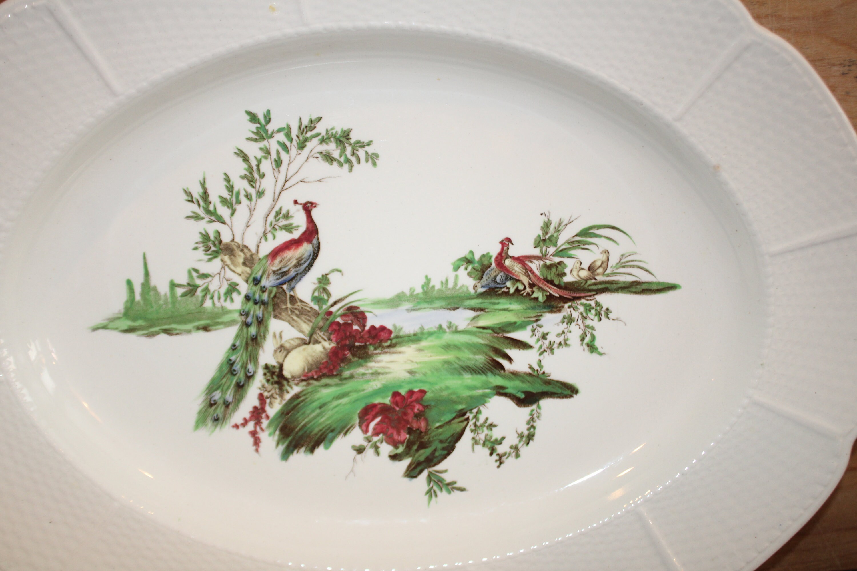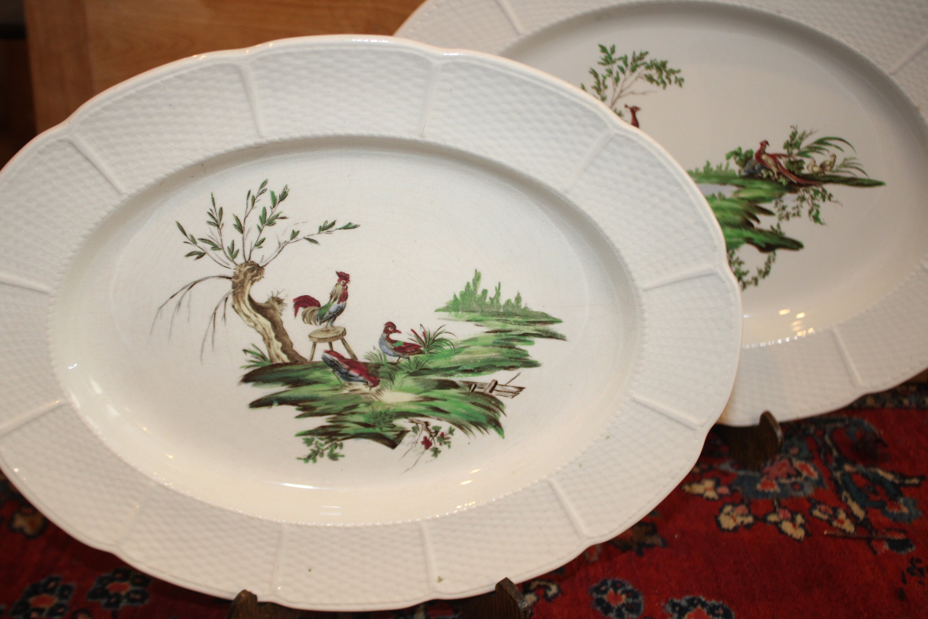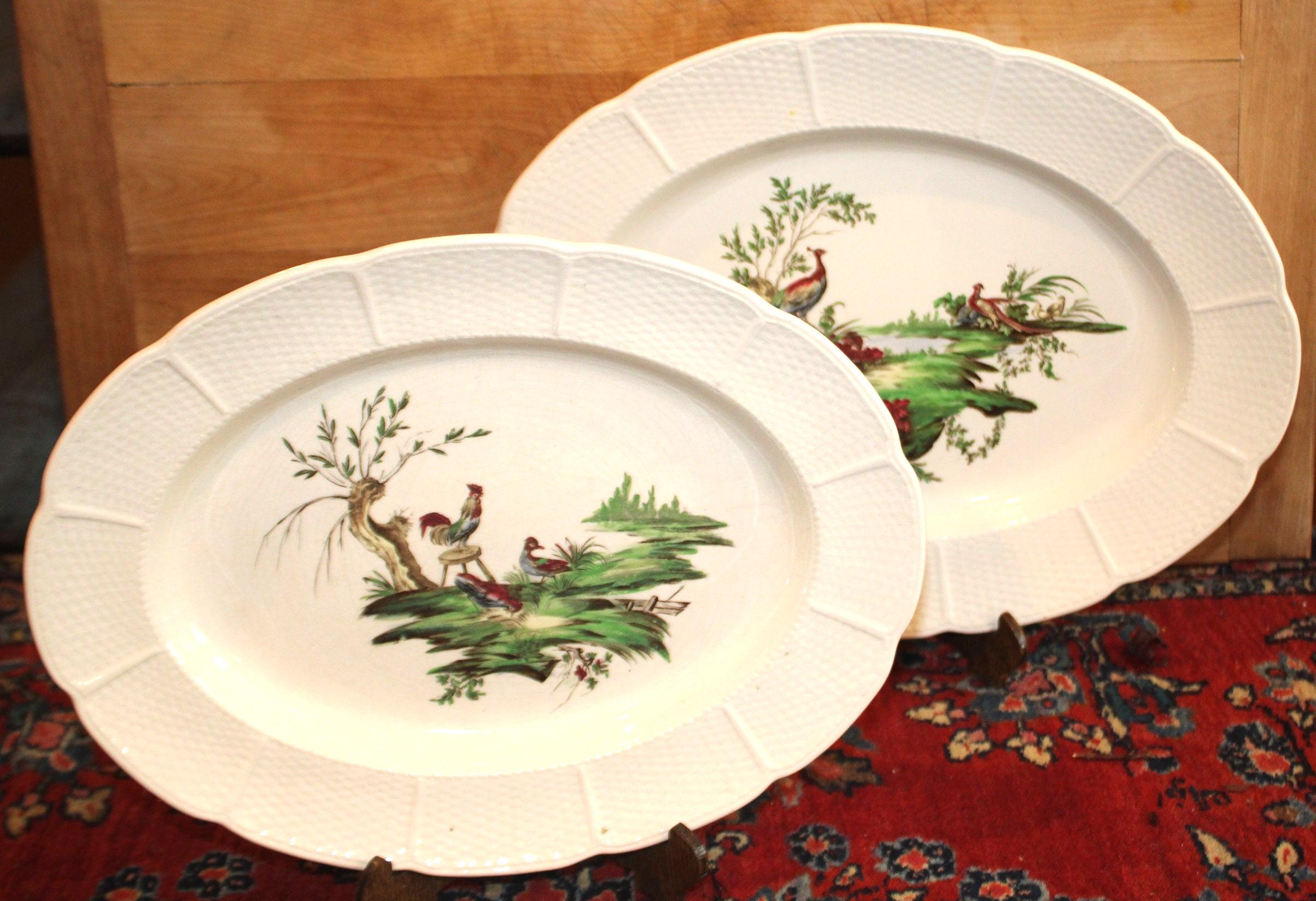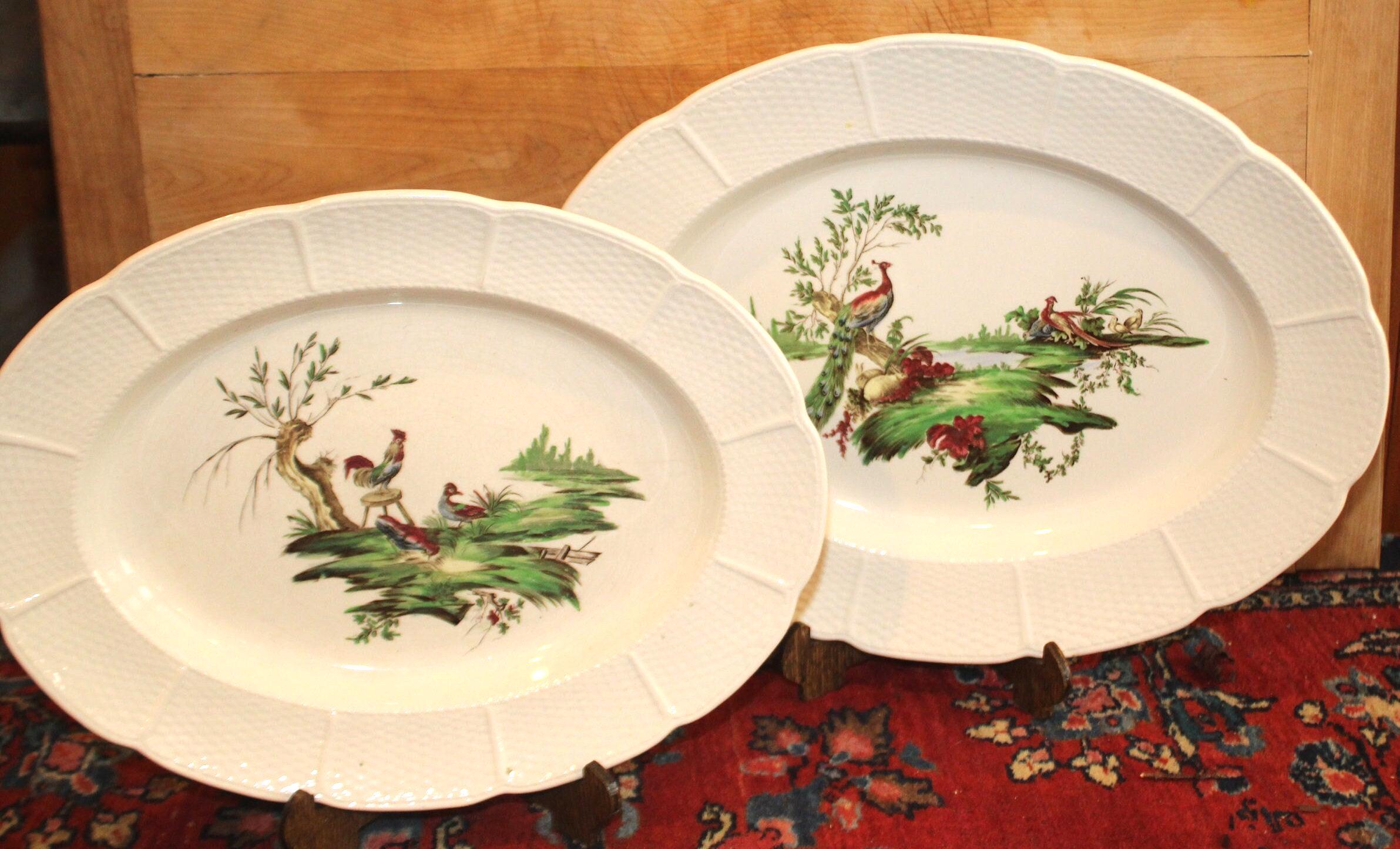 19th Century Wedgwood Transferware Platters, Hand-Colored Bird Design