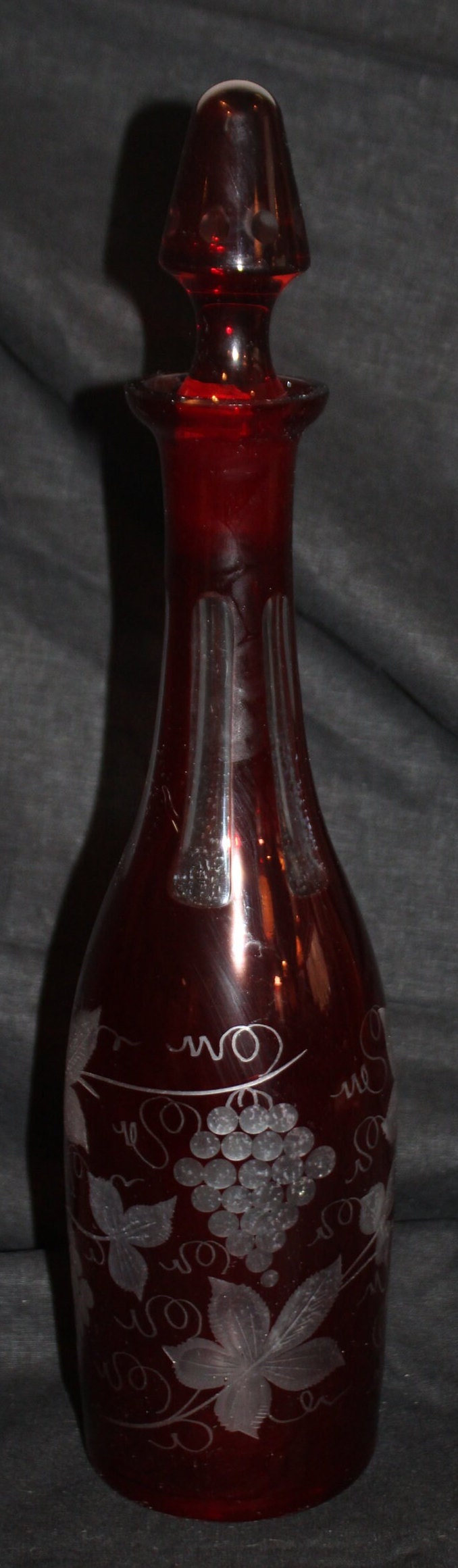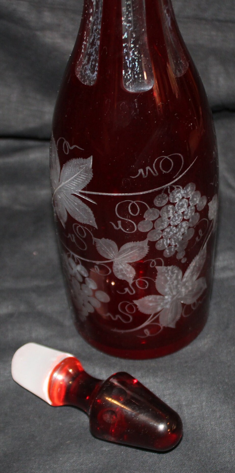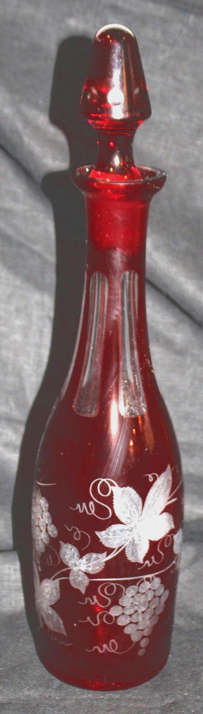 Gorgeous Antique Ruby Red Cranberry Cut to Clear Glass Decanter- Grape Vines/Grapes/Wine