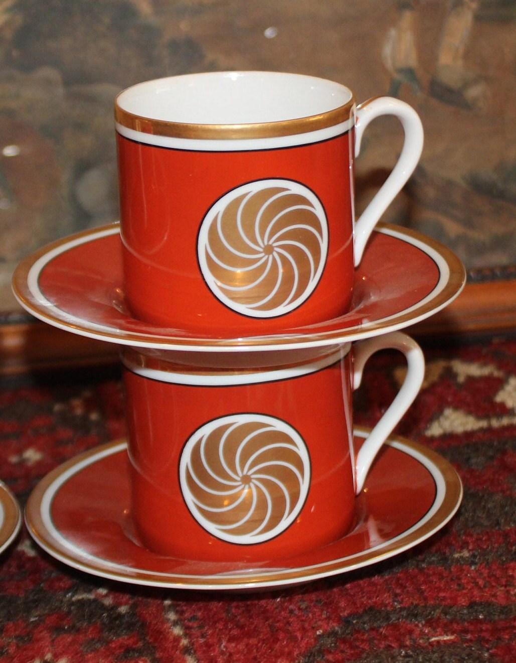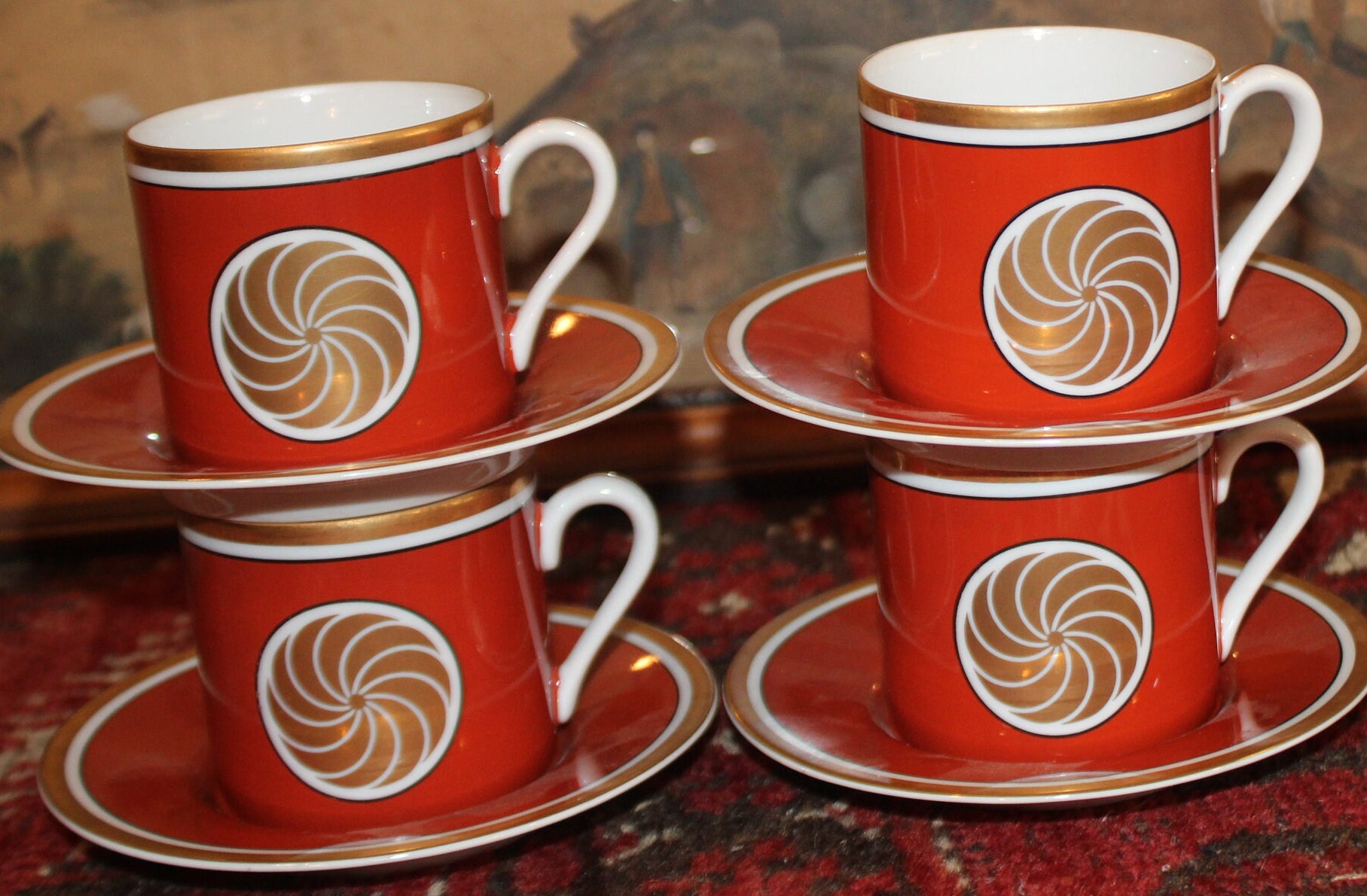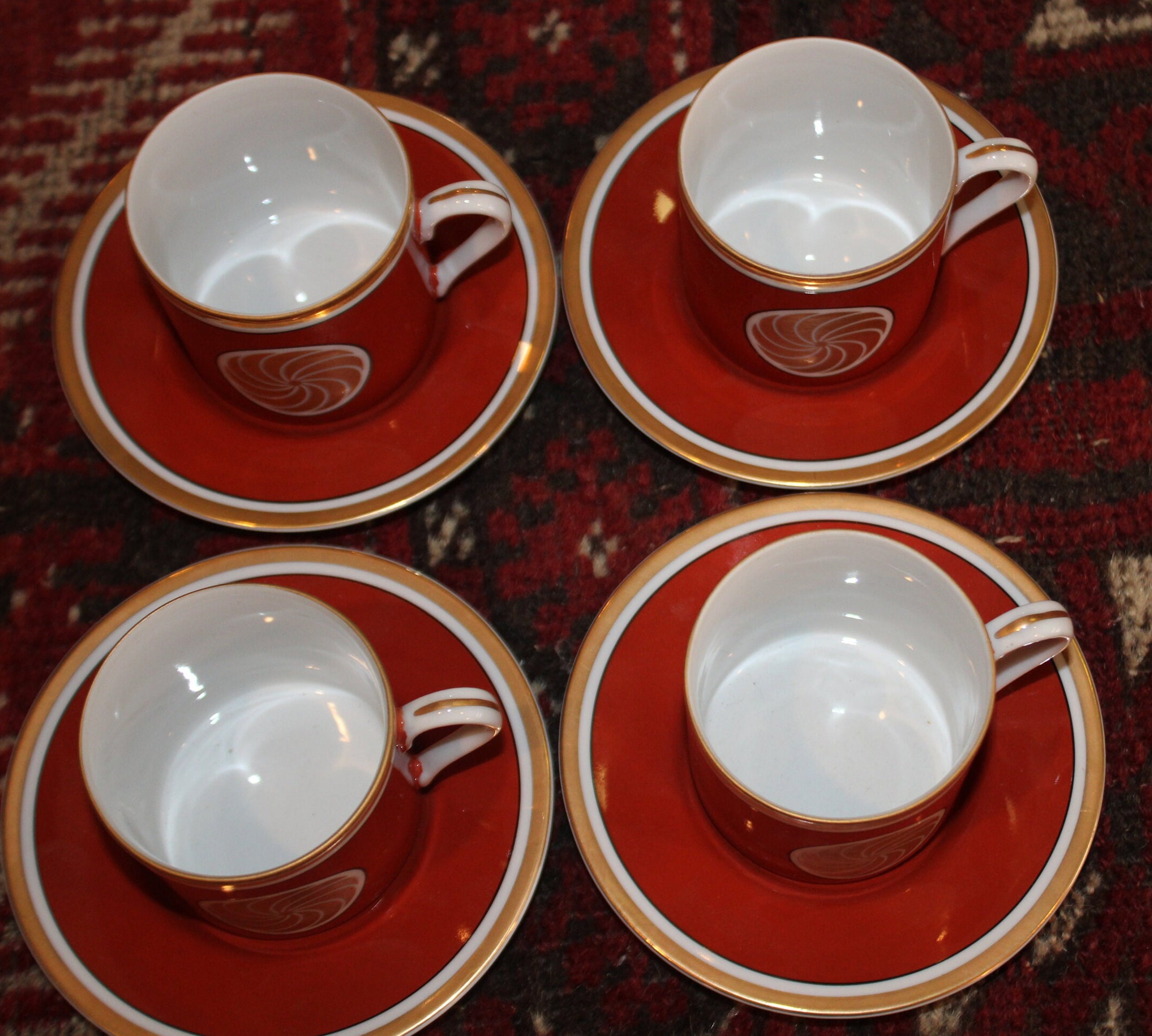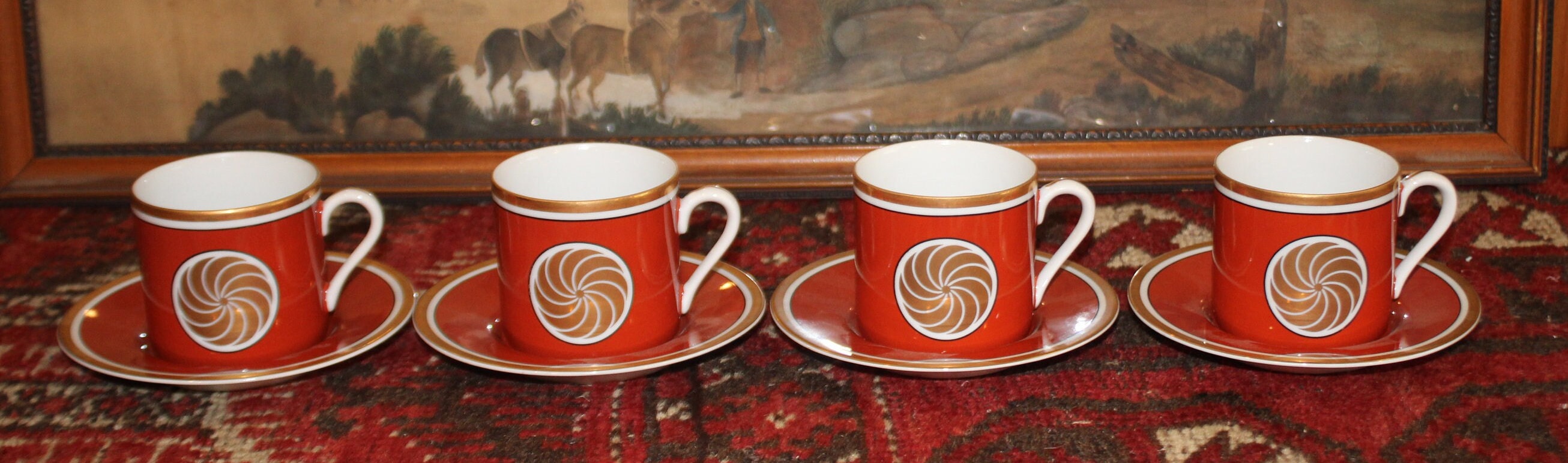 Set of Four Fitz & Floyd Medallion d’Or Burnt Orange Demitasse Tea Cups and Saucers- circa 1970's
