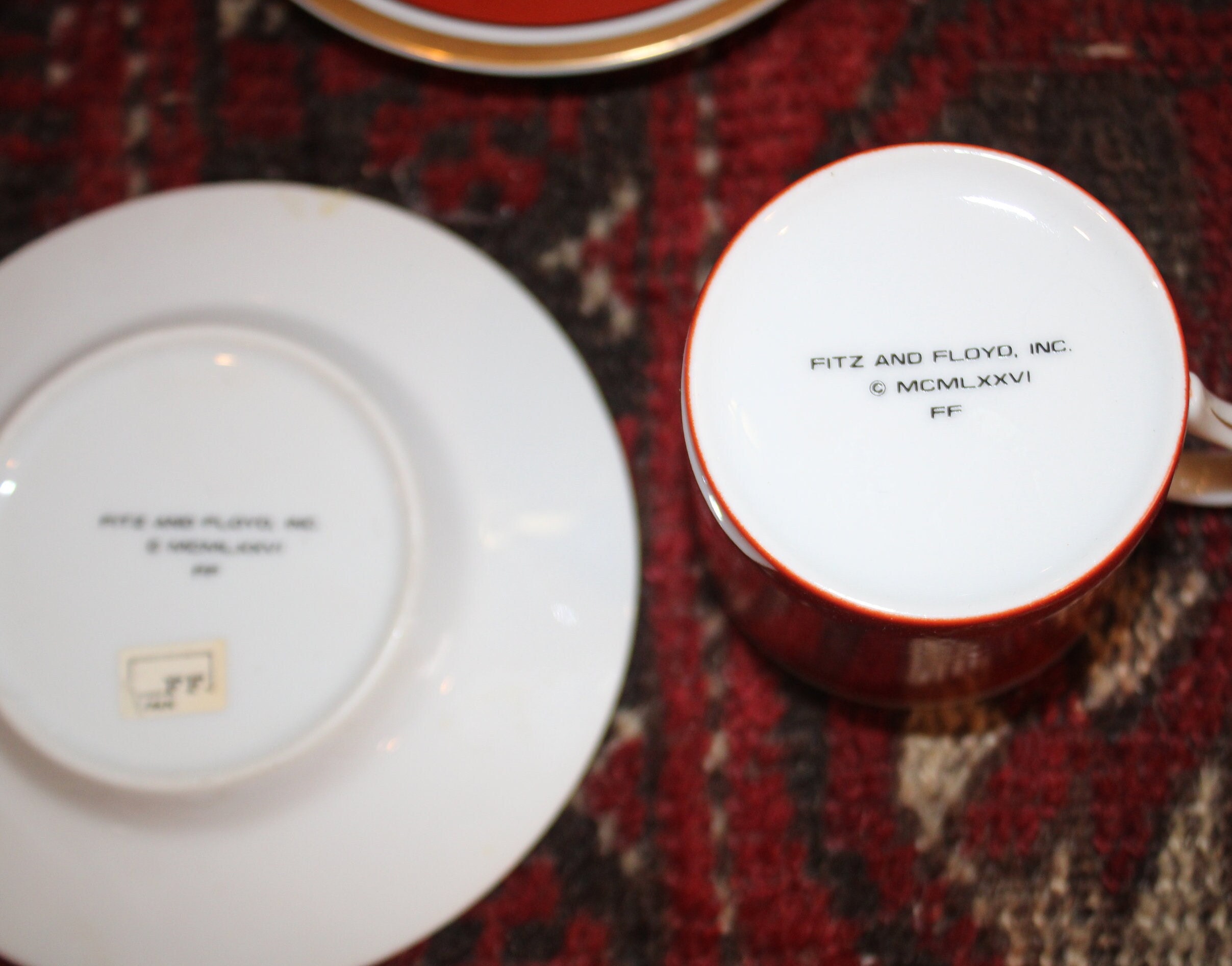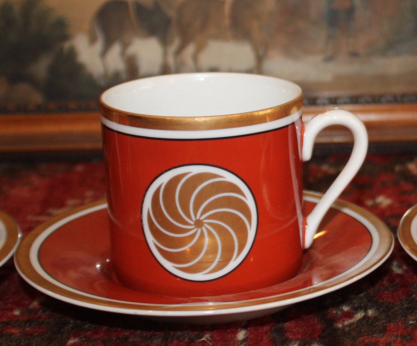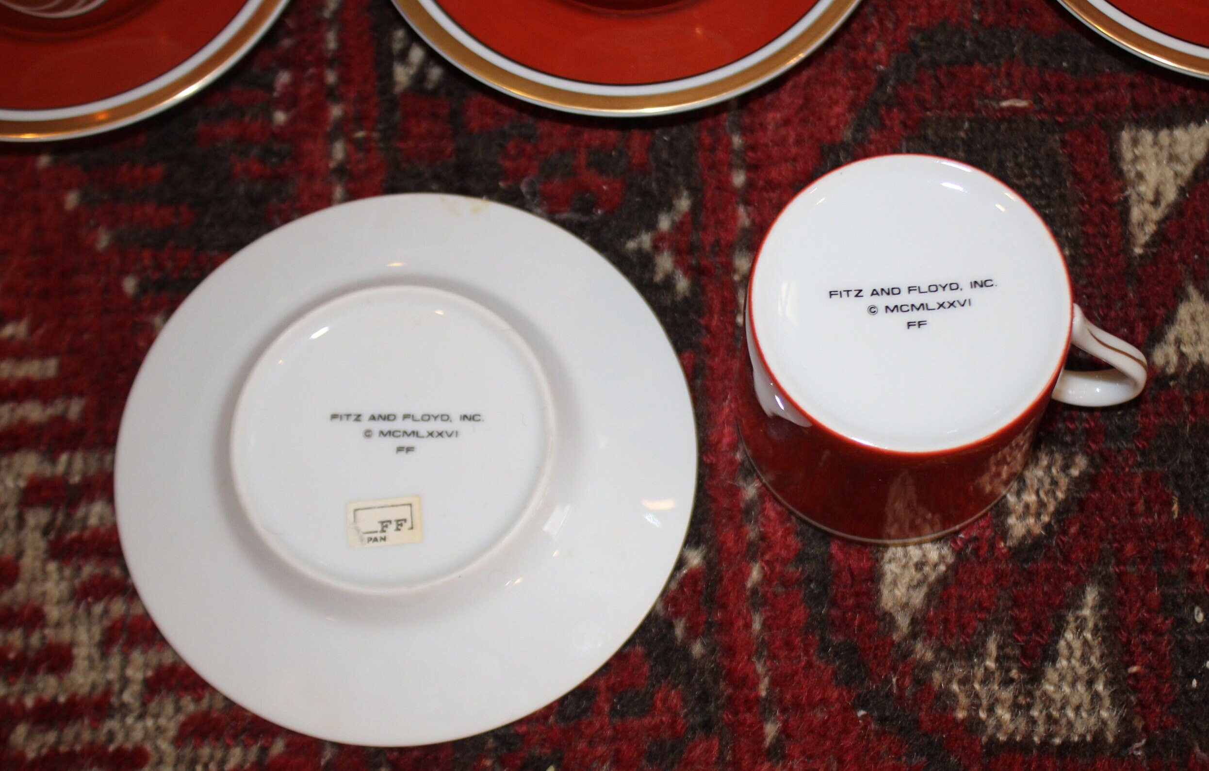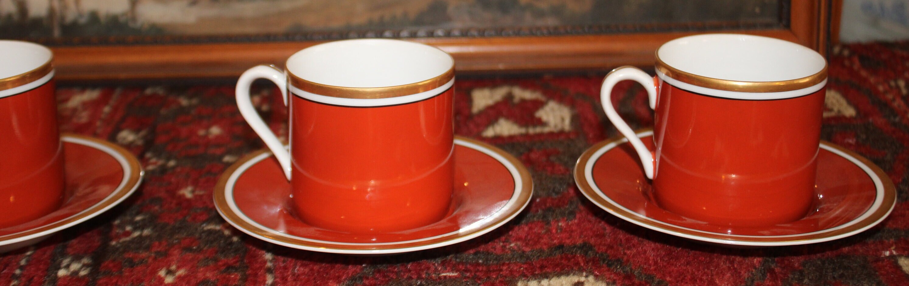 Set of Four Fitz & Floyd Medallion d’Or Burnt Orange Demitasse Tea Cups and Saucers- circa 1970's