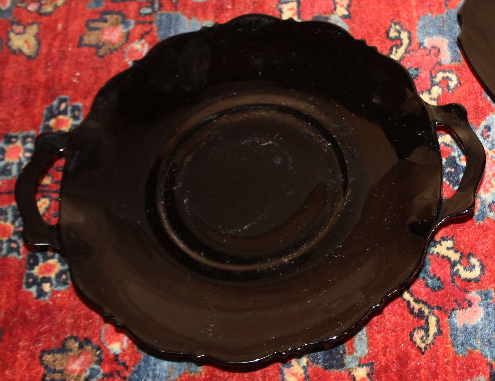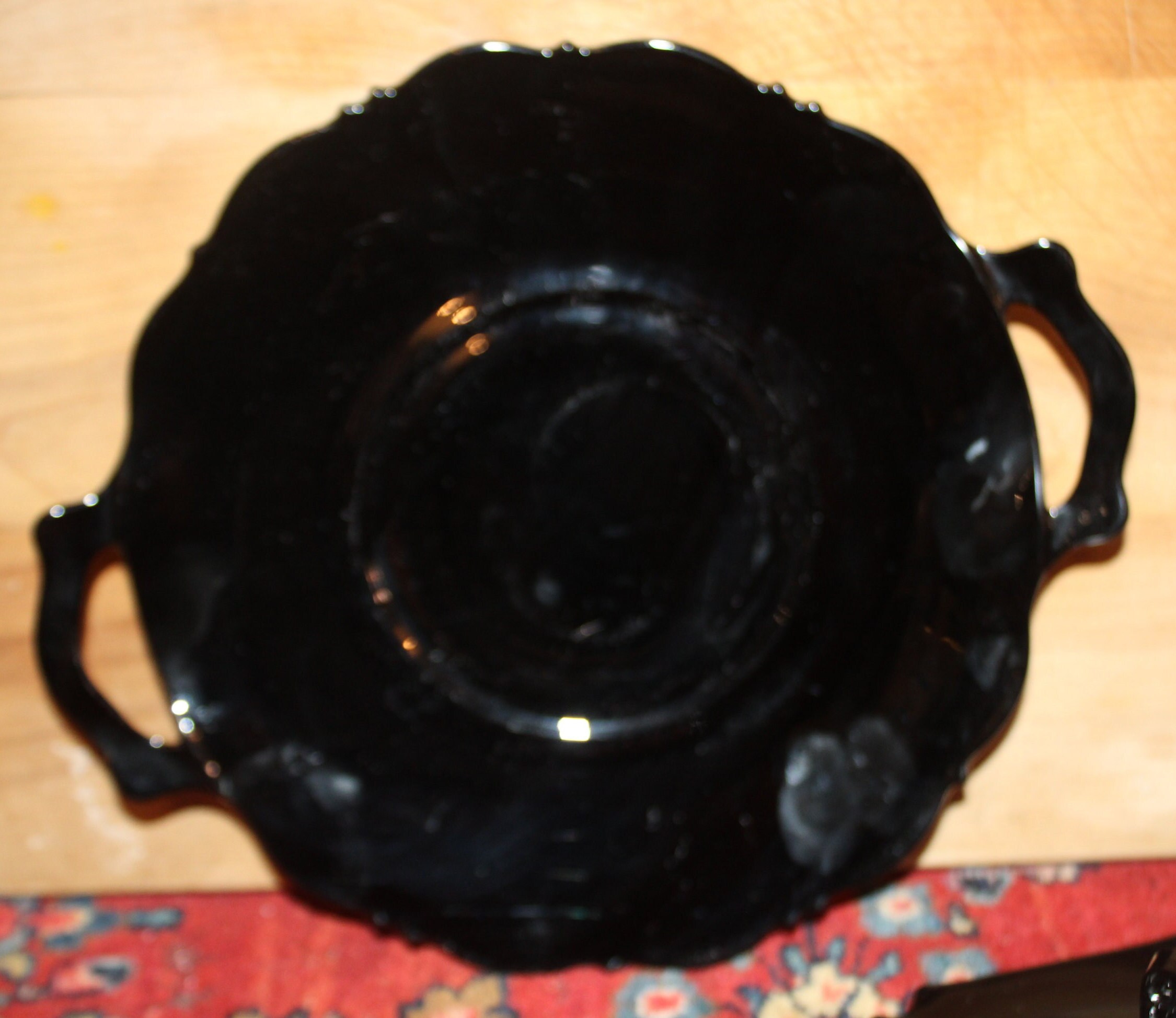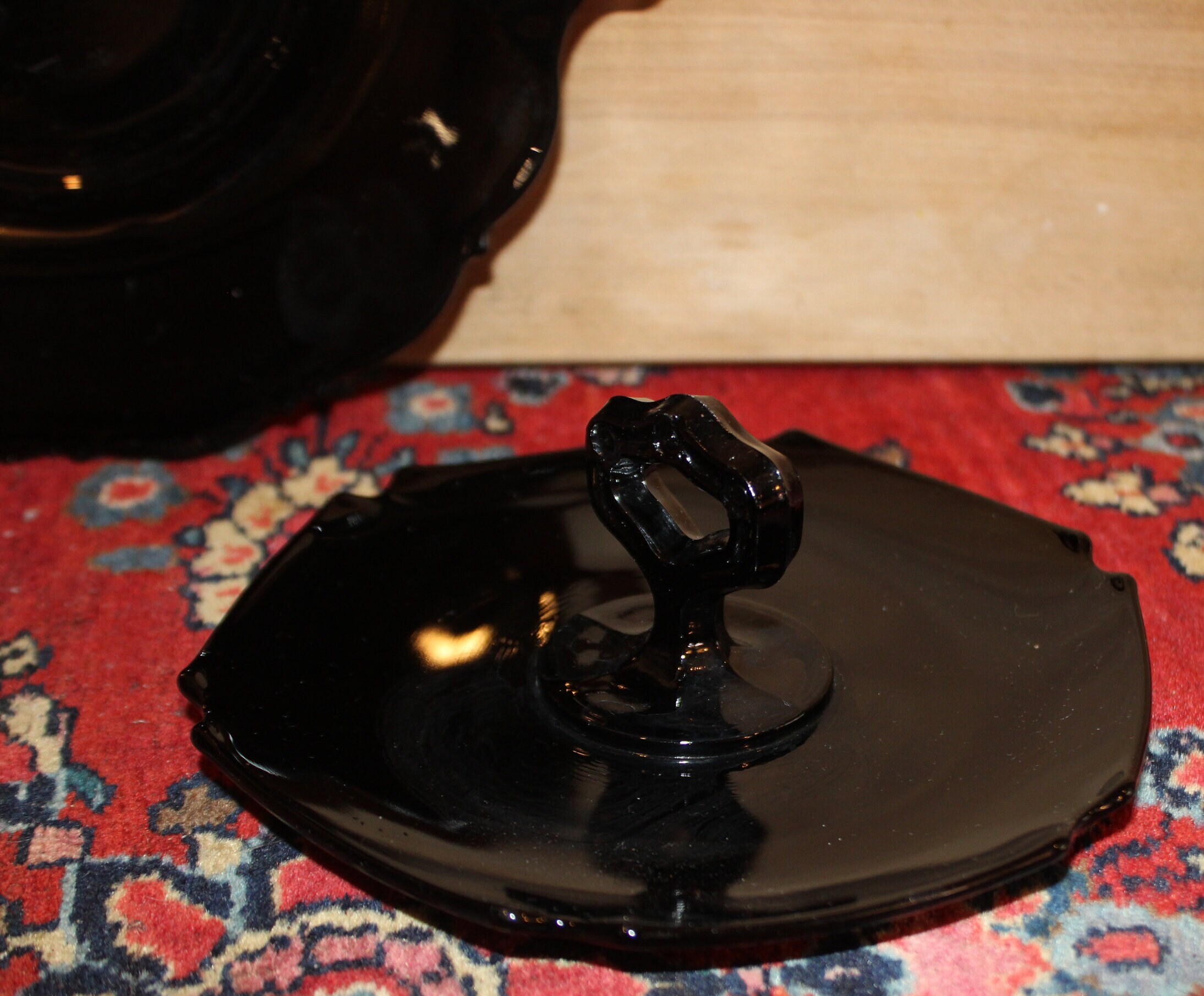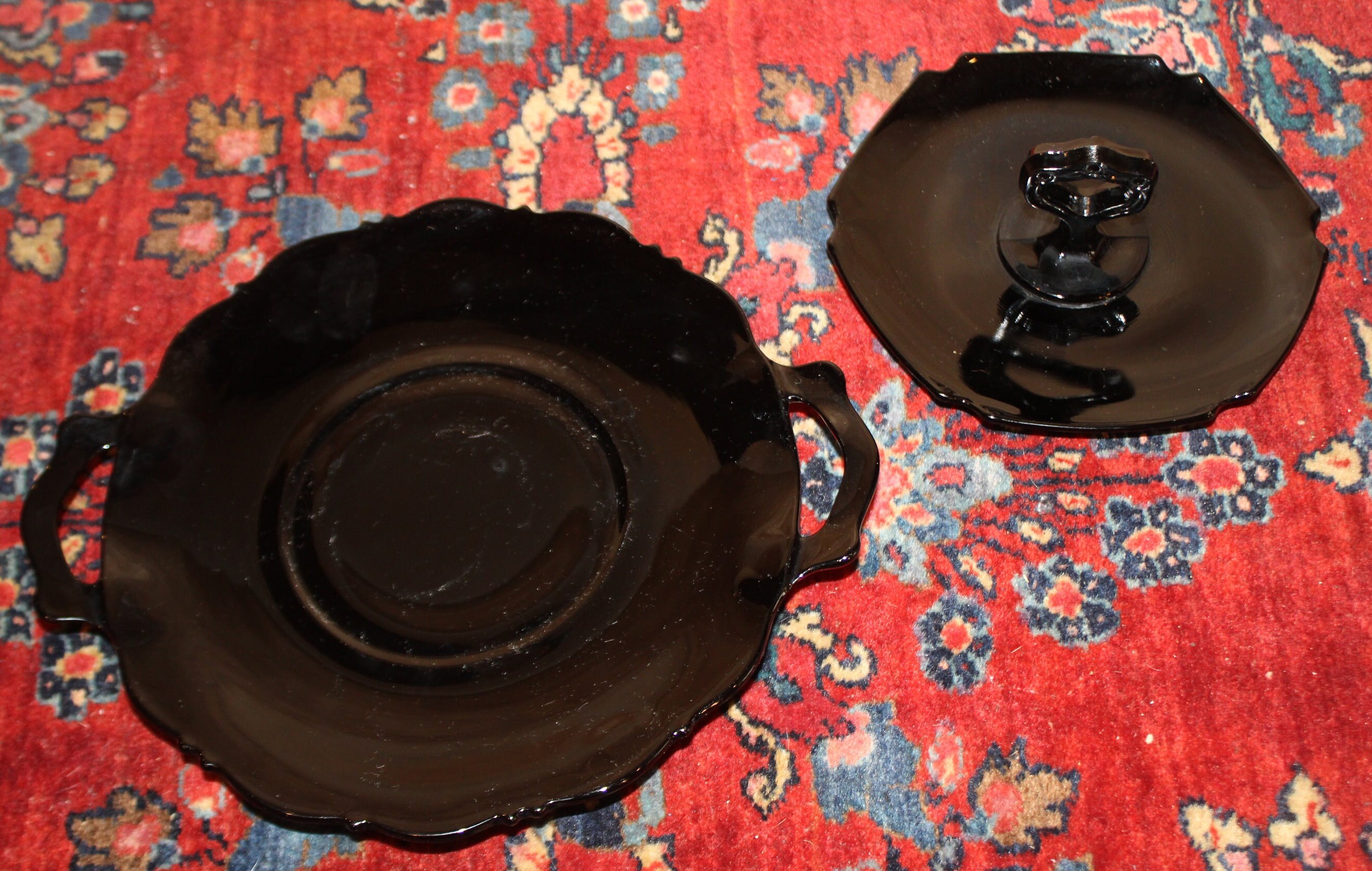 These Two Gorgeous Black Amethyst Depression Glass Candy/Dessert Dishes would be fabulous to use at your next event- We have used them in the past to serve chocolate covered strawberries- and the red of the strawberries displays beautifully atop the black glass dishes. The two handled dish is 10" wide and the one handled dish is approximately 6.25" in diameter (the central handle is 2.75" tall). There are no chips or cracks on either dish. Please message us if you have any questions- Thanks for looking!