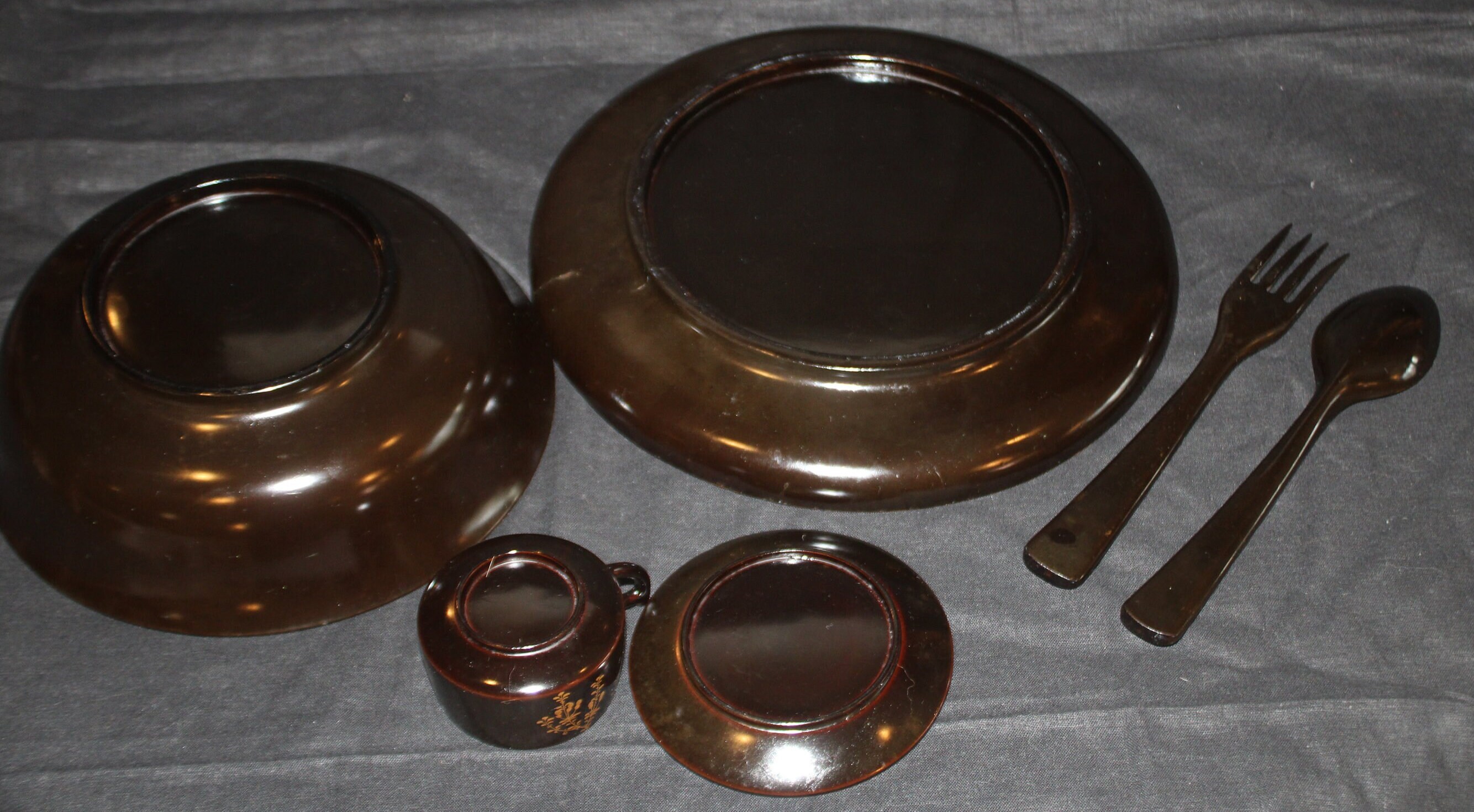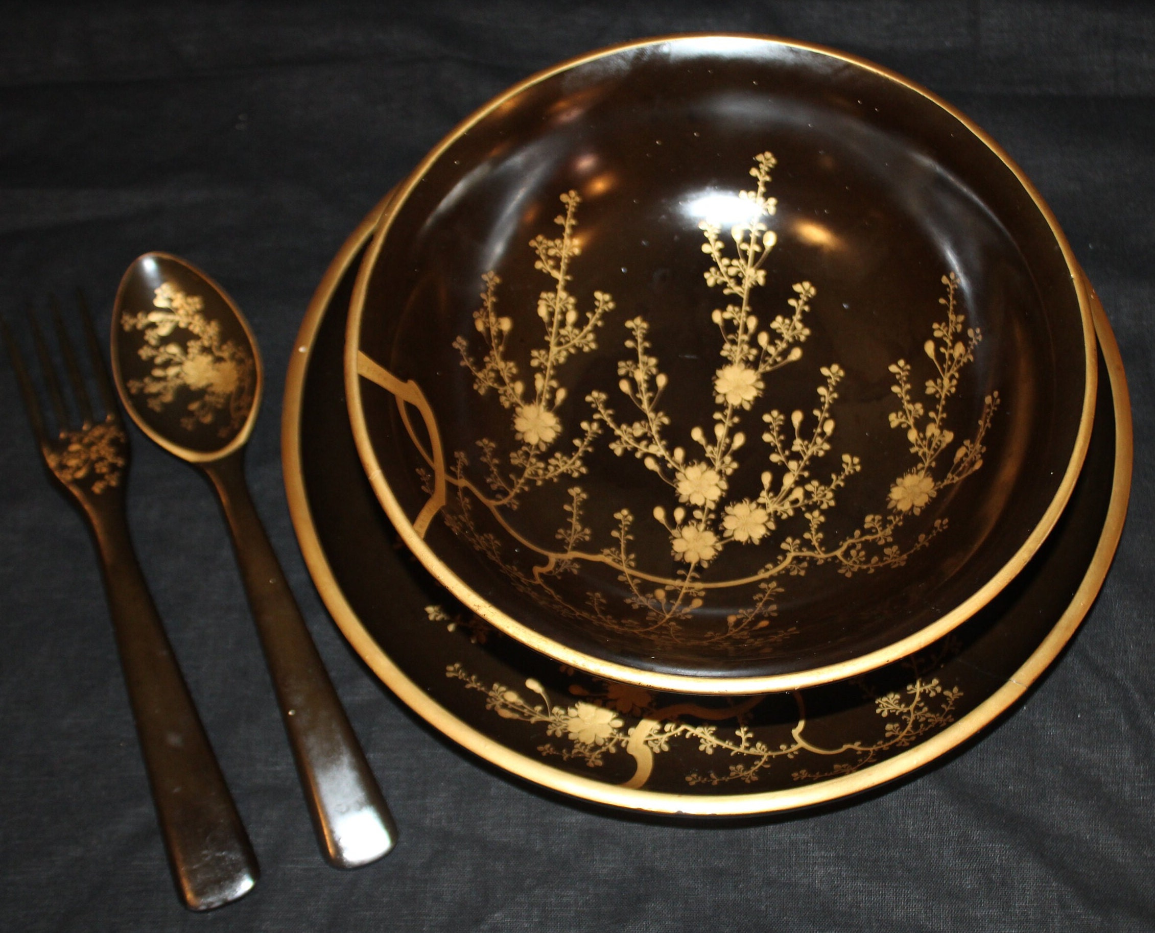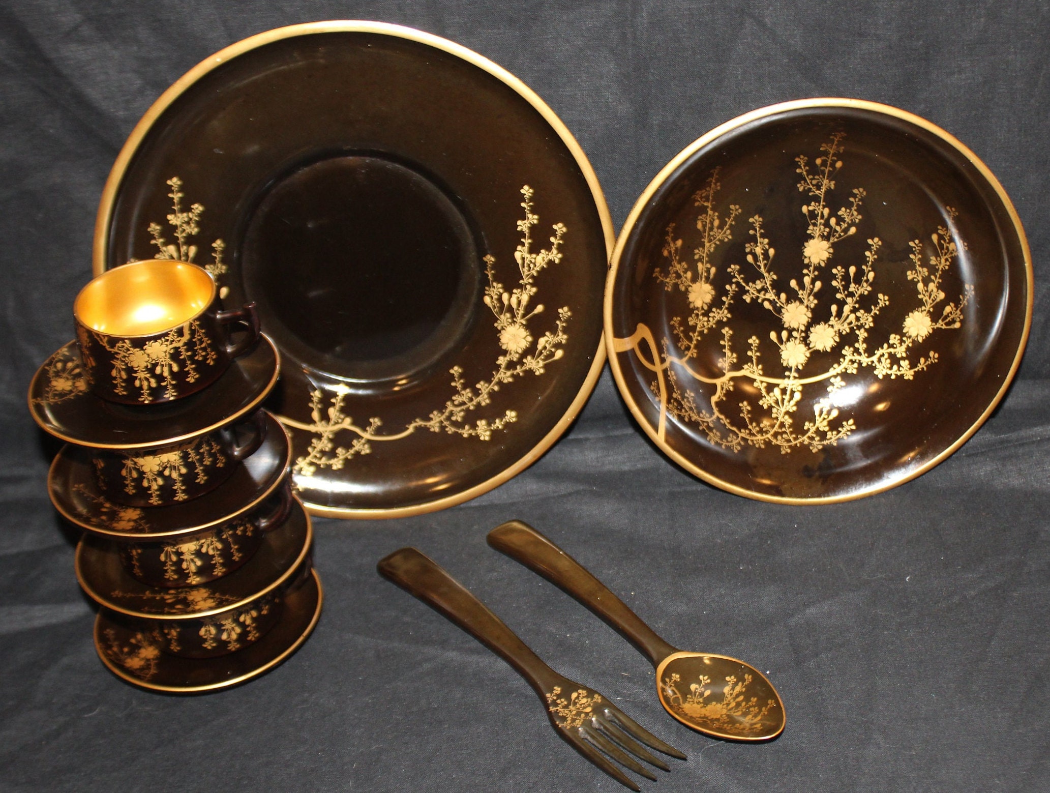 This Beautiful Vintage Hand-painted Japanese Lacquerware Set with four teacups and saucers, a rice bowl with the underplate, and a spoon and fork is available to you! Serve your warmed saki or tea in the cups, your rice or soba noodles in the bowl, and your seafood or sushi on the underplate at your next Asian extravaganza! Each element is beautifully hand painted with matching foliage and blossoms in gold gilt. The plate is 10" in diameter; the bowl is 8.25" in diameter x 2.75" tall, and the teacup saucer is 4.25" in diameter. The underplate has a small 1" crack on the rim which is very hard to notice (shown in our last photo)- otherwise everything is in great condition including the paint. Please message us if you have any questions about this light weight set- Thanks for looking!