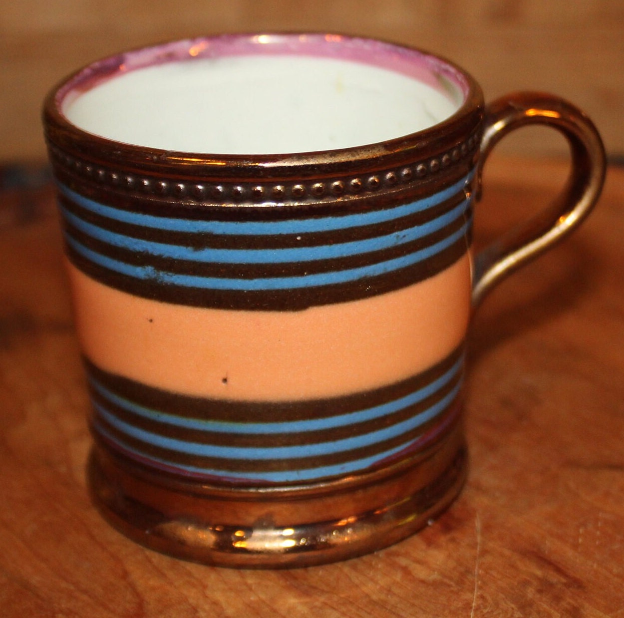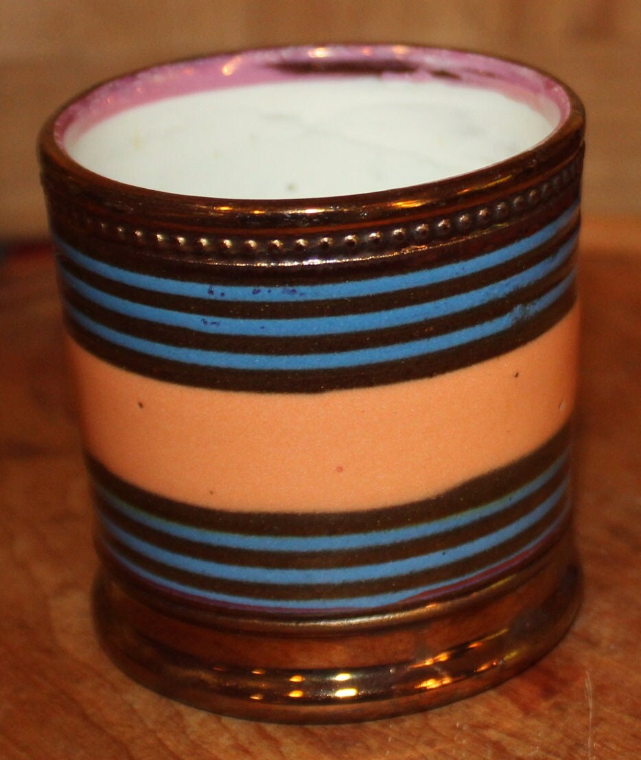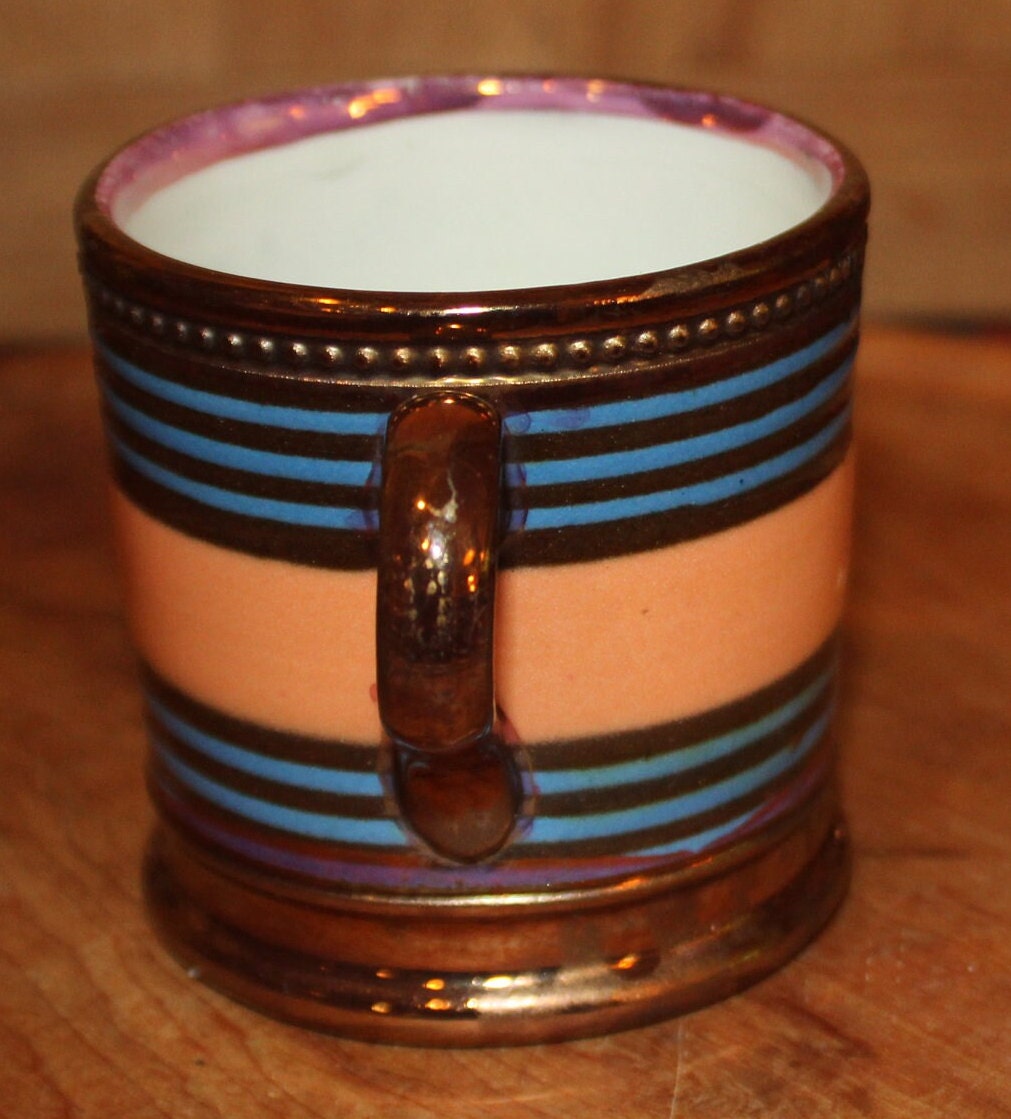 This Antique 19th Century English Lustre Striped Mug/Cup is just stunning and would be a fabulous addition to your collection! It has a raised beaded design, thin blue stripes, and a coral band; the interior upper rim is pink. It is 3" tall x 2.75" in diameter with No chips or cracks. Please message us if you have any questions- Thanks for looking!