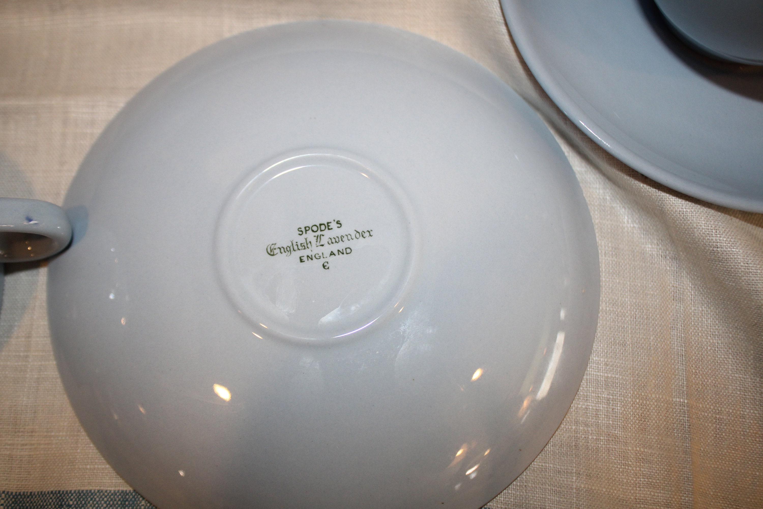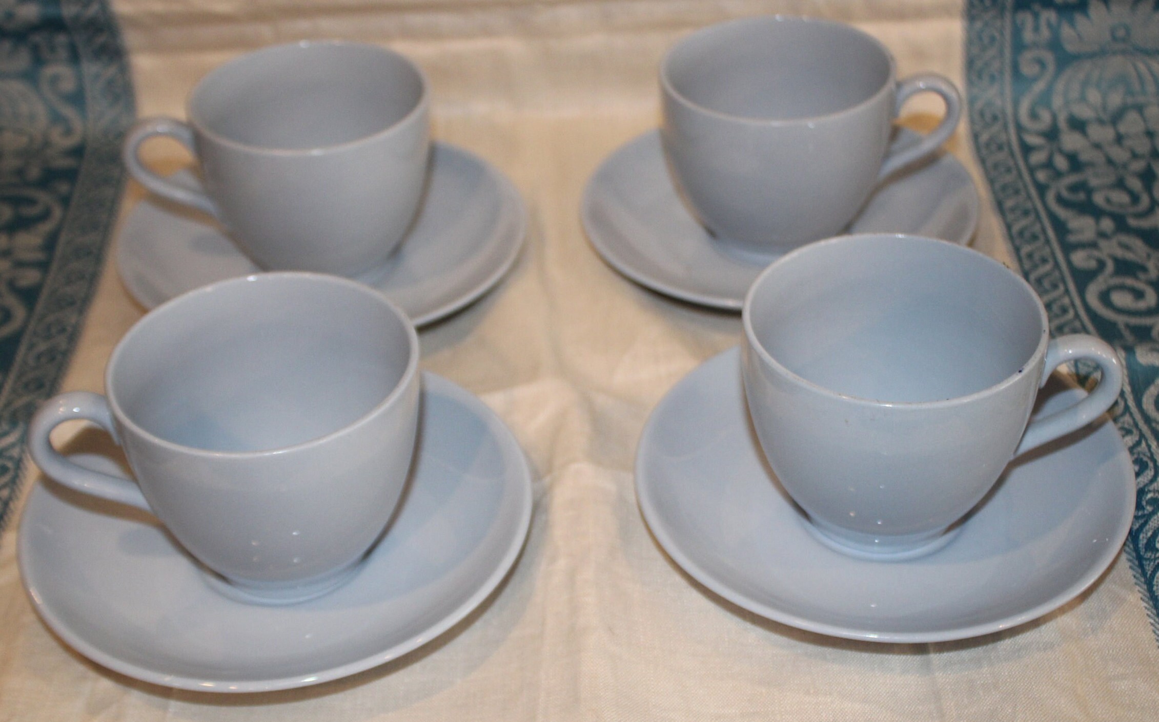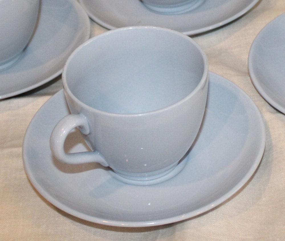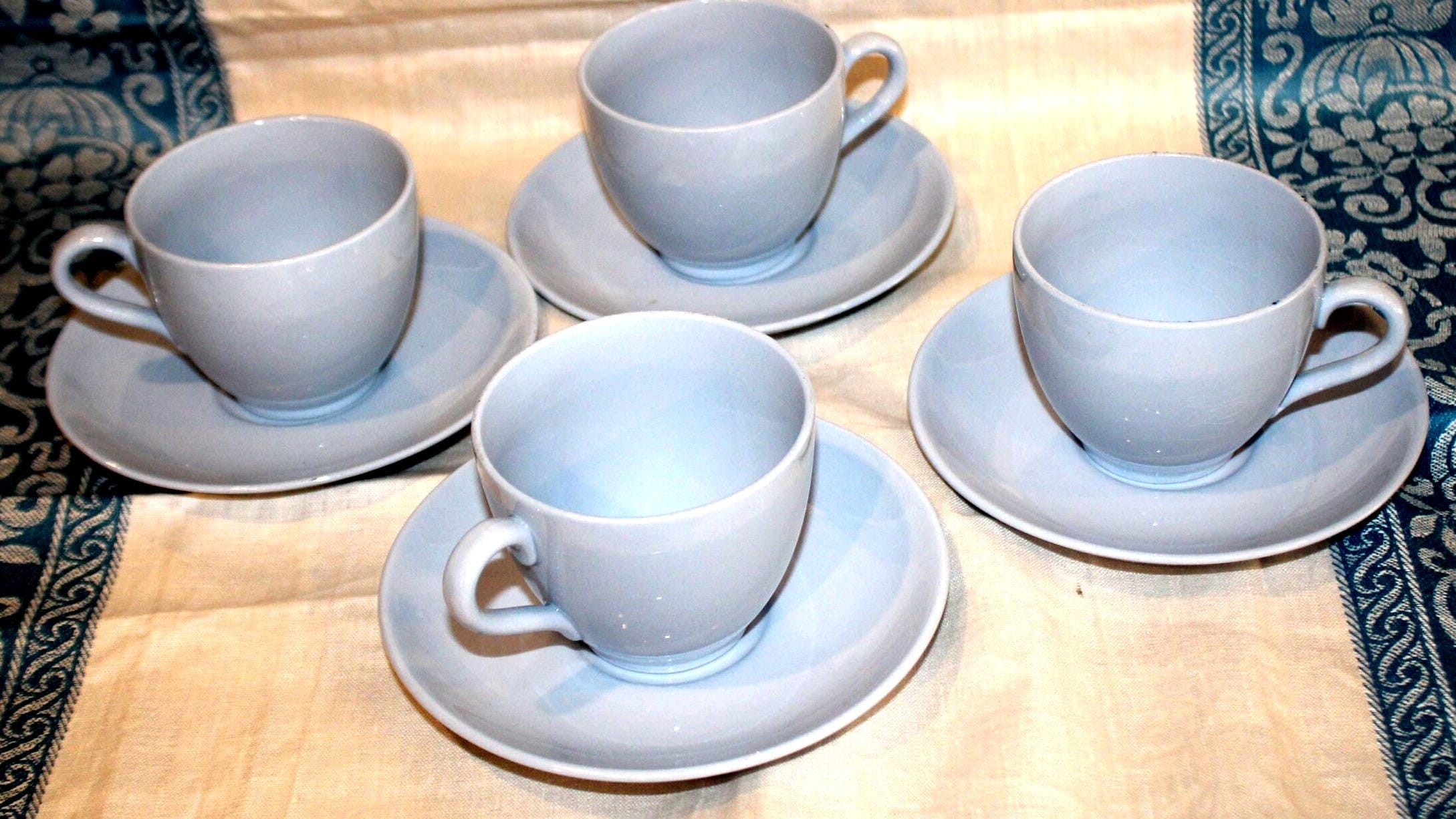 This Set of 4 Beautiful Vintage Spode English Lavender Teacups and Saucers is available to you! The pale periwinkle blue hue of these Spode cups is so peaceful and calming- they are sure to delight your guests at your next tea party! The cups are 4.25" wide x 2.75" tall and rest on a 5.5" saucer. There are no chips or cracks- we have two sets of four available. Please message us if you have any questions- Thanks for looking!