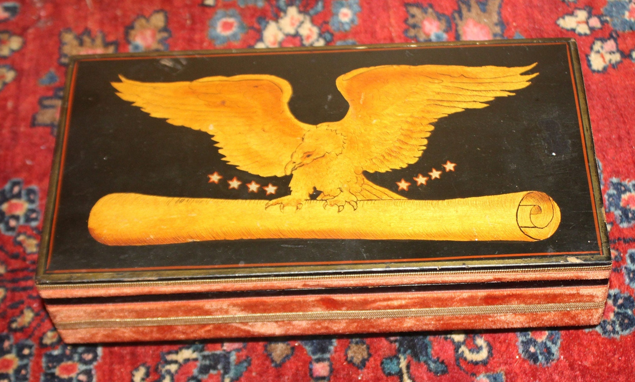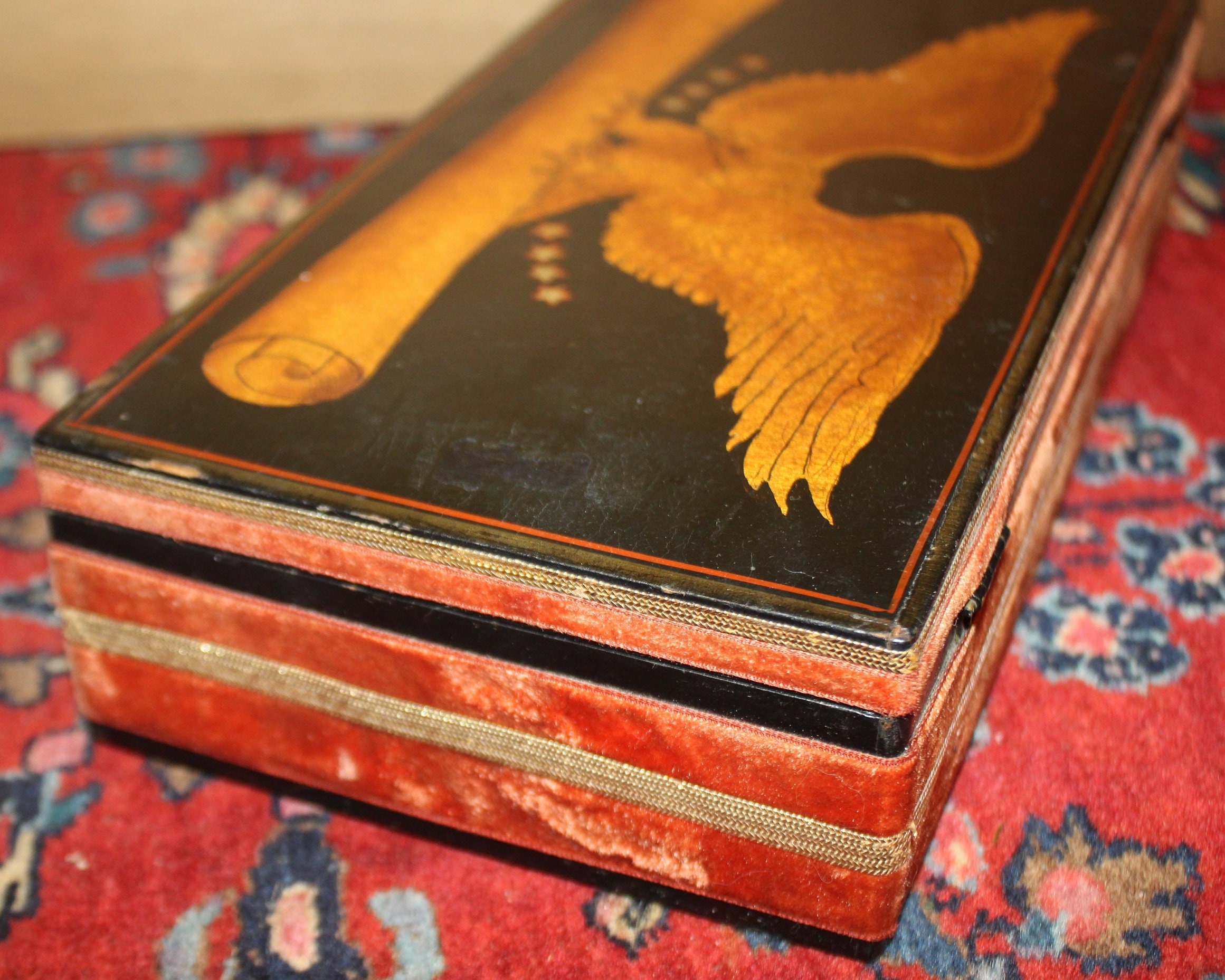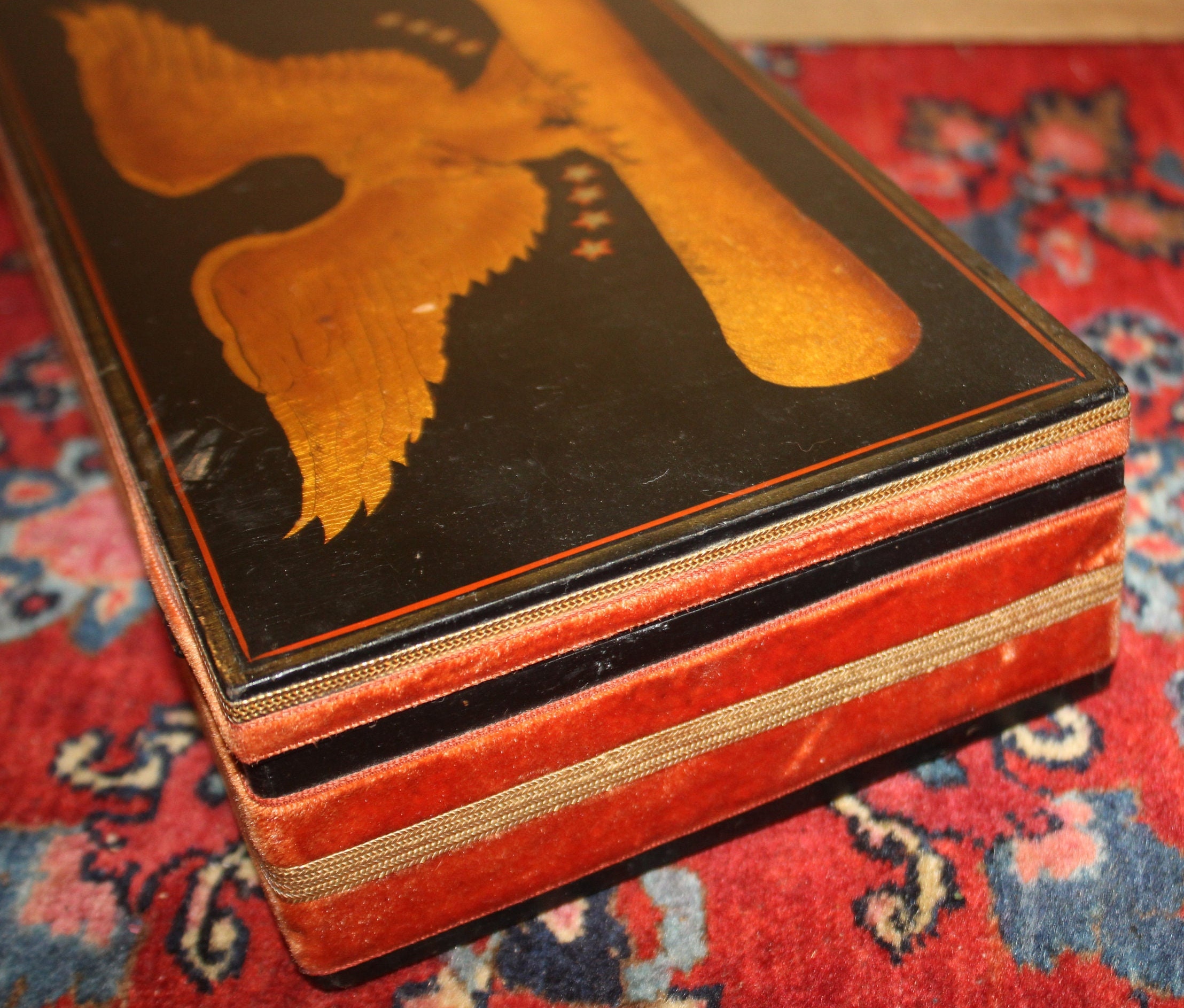 The Eagle on this Patriotic Box is fantastic and so detailed!! We believe the hinged black box was made in the 40's while the decoration (velvet ribbon and eagle painting) was applied more recently- it is signed "by Nan" on the interior lid next to a brass eagle emblem. It is 10.5" x 5.75" x 2.5" and is in great condition- it would be perfect to use as a jewelry box or valet Please message us if you have any questions- Thanks for looking!