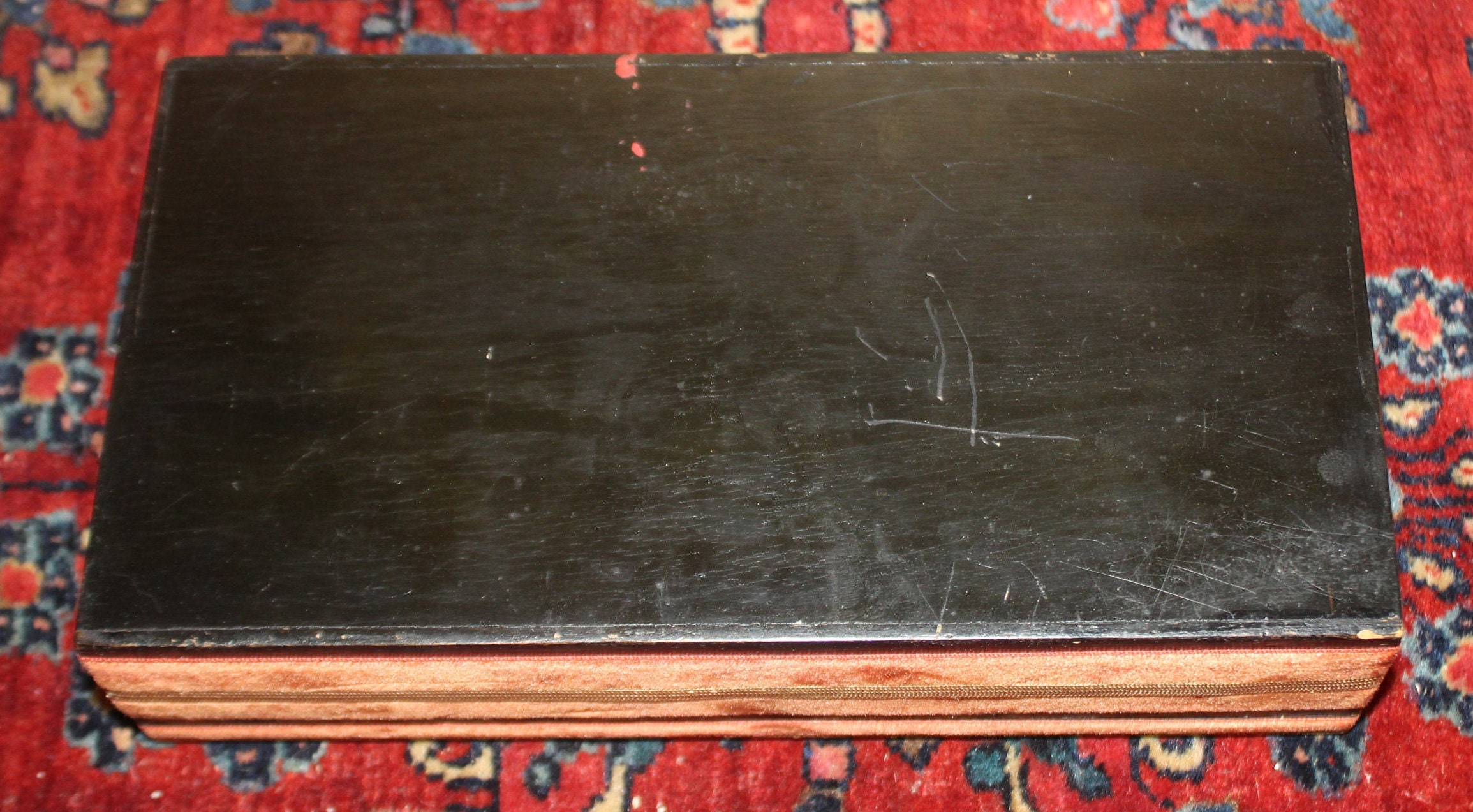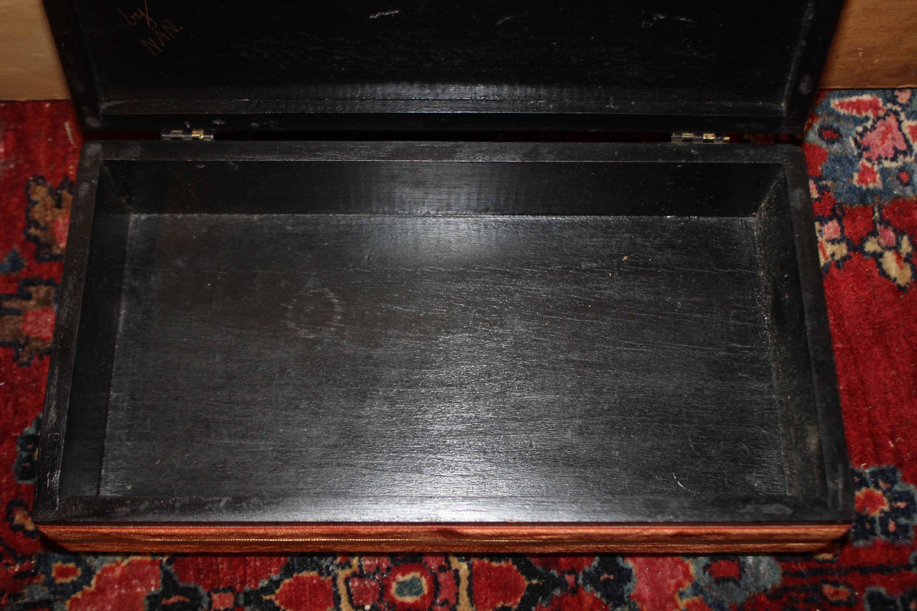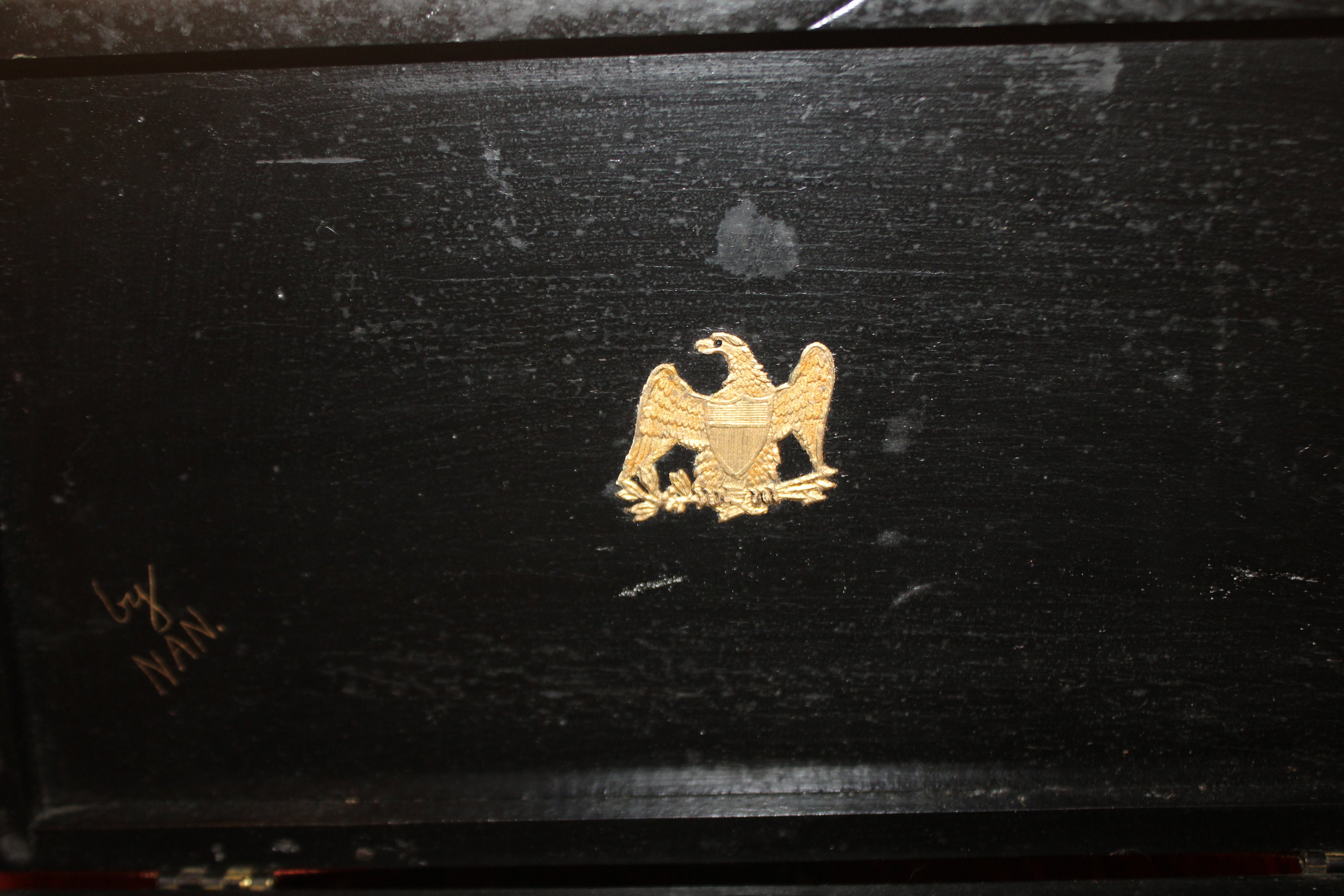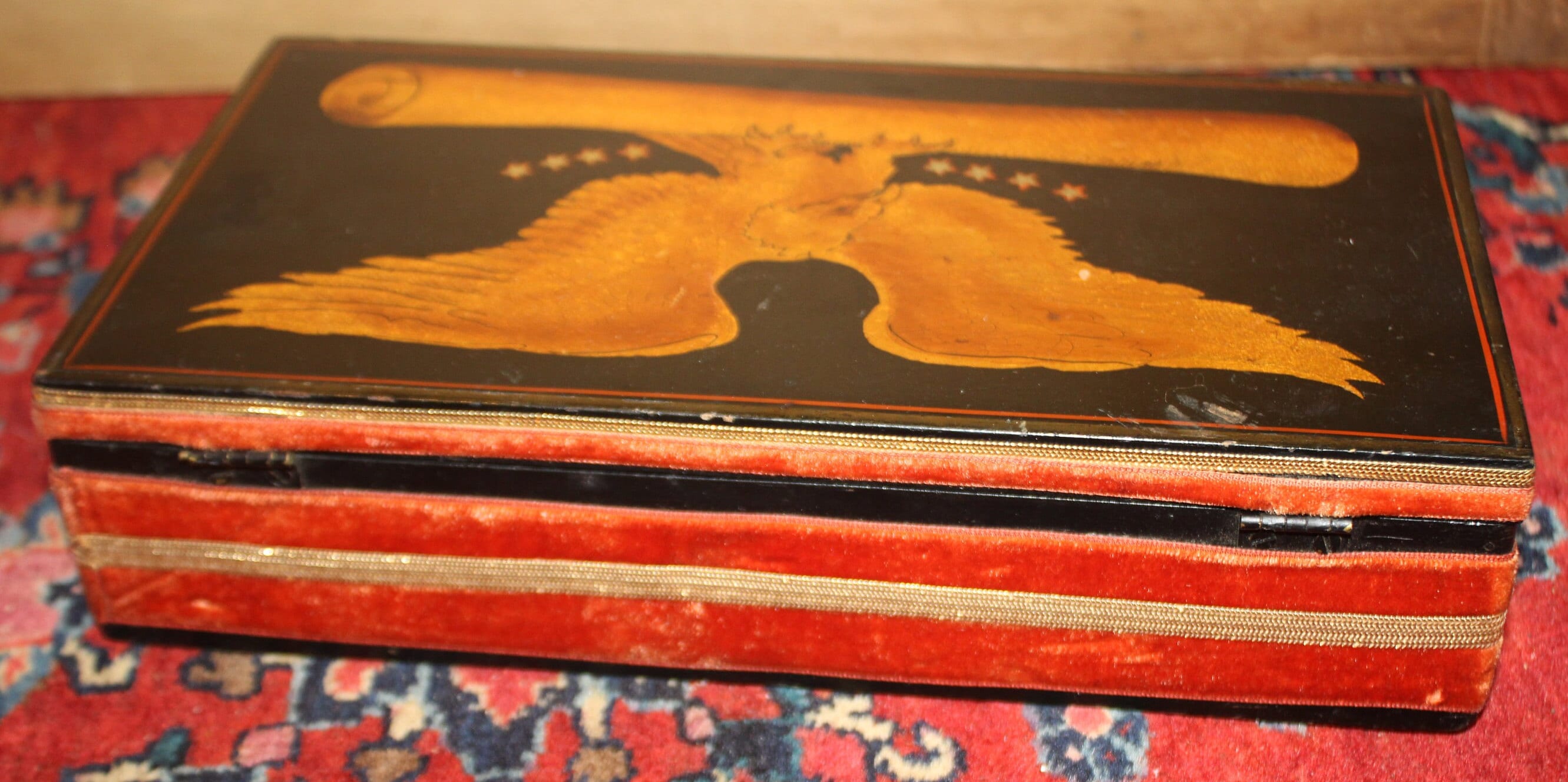 The Eagle on this Patriotic Box is fantastic and so detailed!! We believe the hinged black box was made in the 40's while the decoration (velvet ribbon and eagle painting) was applied more recently- it is signed "by Nan" on the interior lid next to a brass eagle emblem. It is 10.5" x 5.75" x 2.5" and is in great condition- it would be perfect to use as a jewelry box or valet Please message us if you have any questions- Thanks for looking!