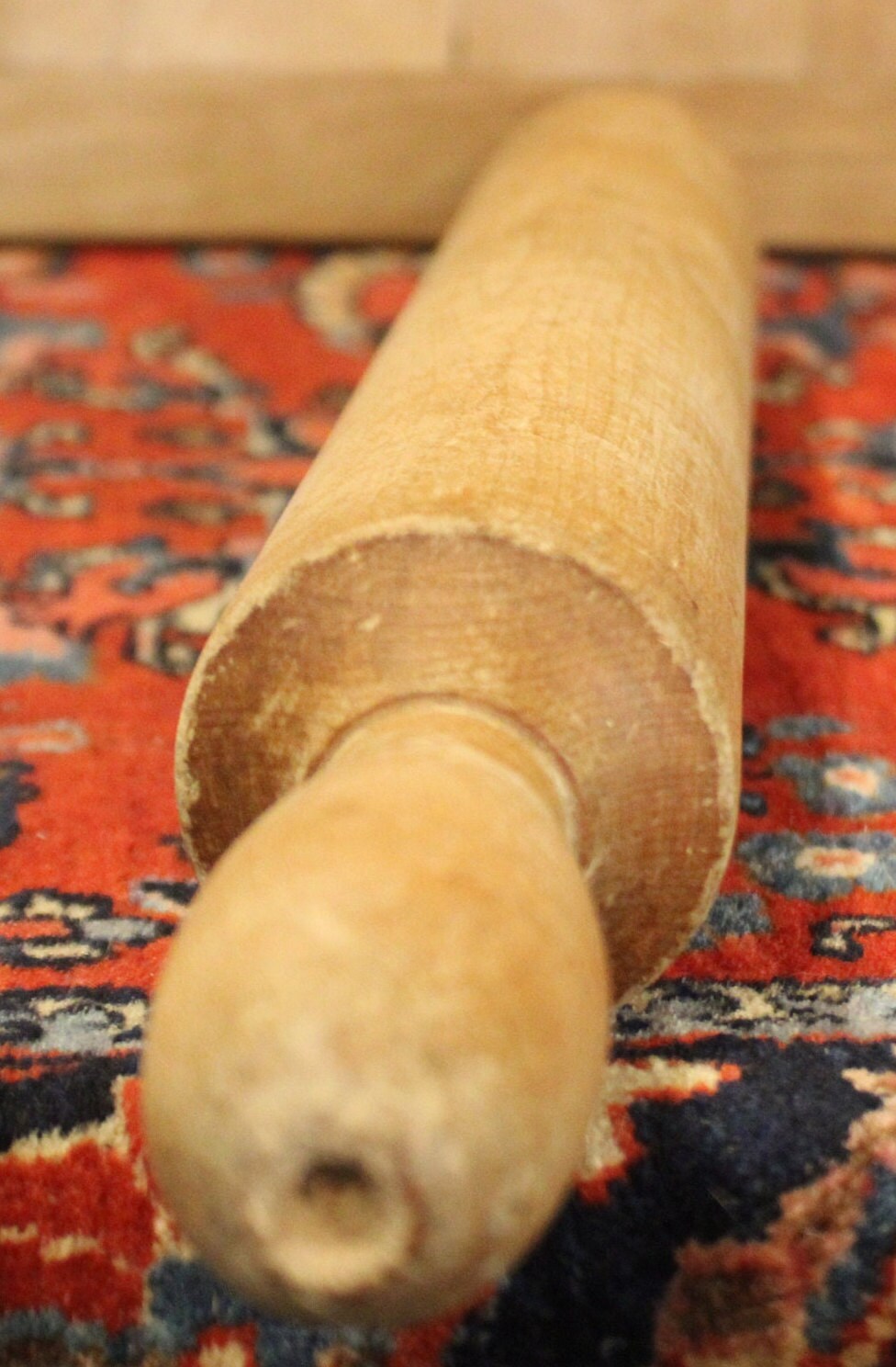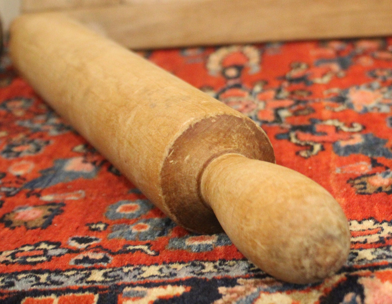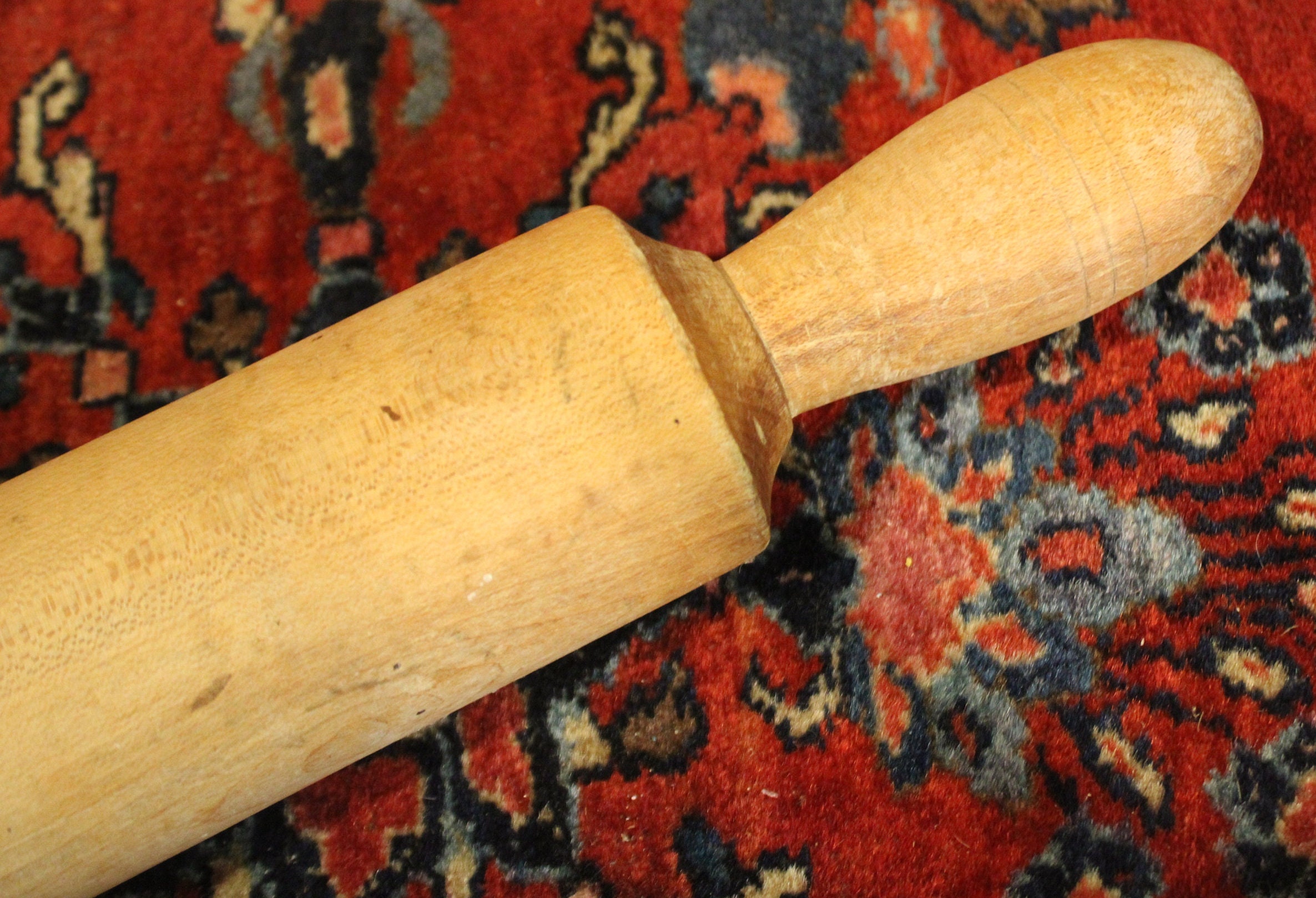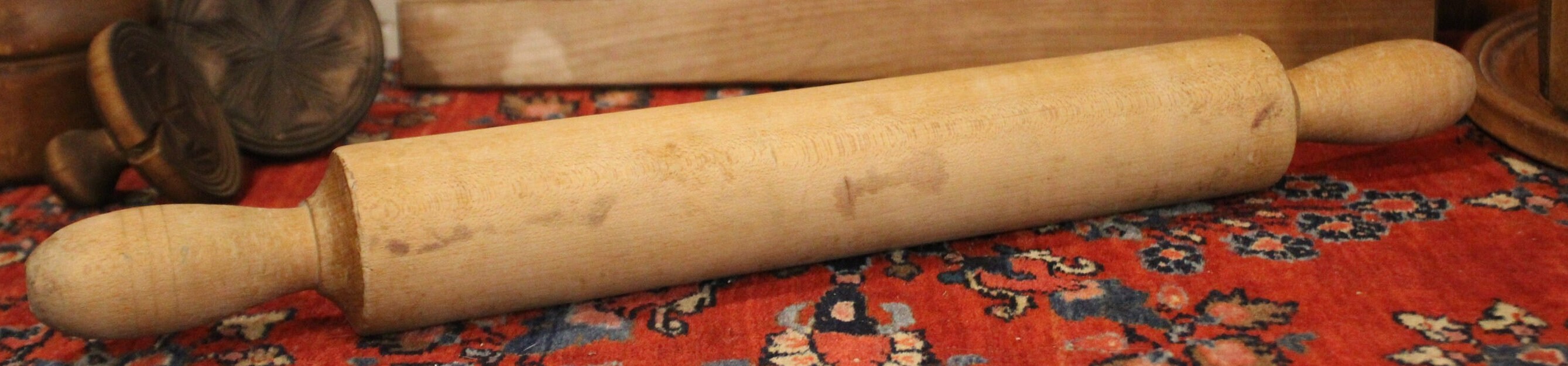 This Wonderful Long 21 Inch Antique Maple One-Piece Rolling Pin would be a great gift for the pie baker in your life -maybe you will even receive a reward pie in return ;) ! It weighs 1 lb 12 oz. and is 21" from tip to tip; the barrel is 13.25" long with a 2.5" diameter. We believe it to be lathe turned prior to 1920; it has a warm rich patina with wear that is reflective of age. It is turned from one piece of maple and has 3 incised rings around each handle; there are no chips or cracks- it does have a drill hole at one end which perhaps was made for hanging. Please message us if you have any questions- Thanks for looking!