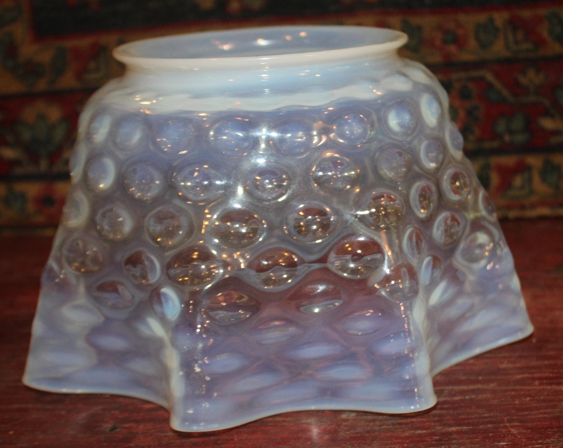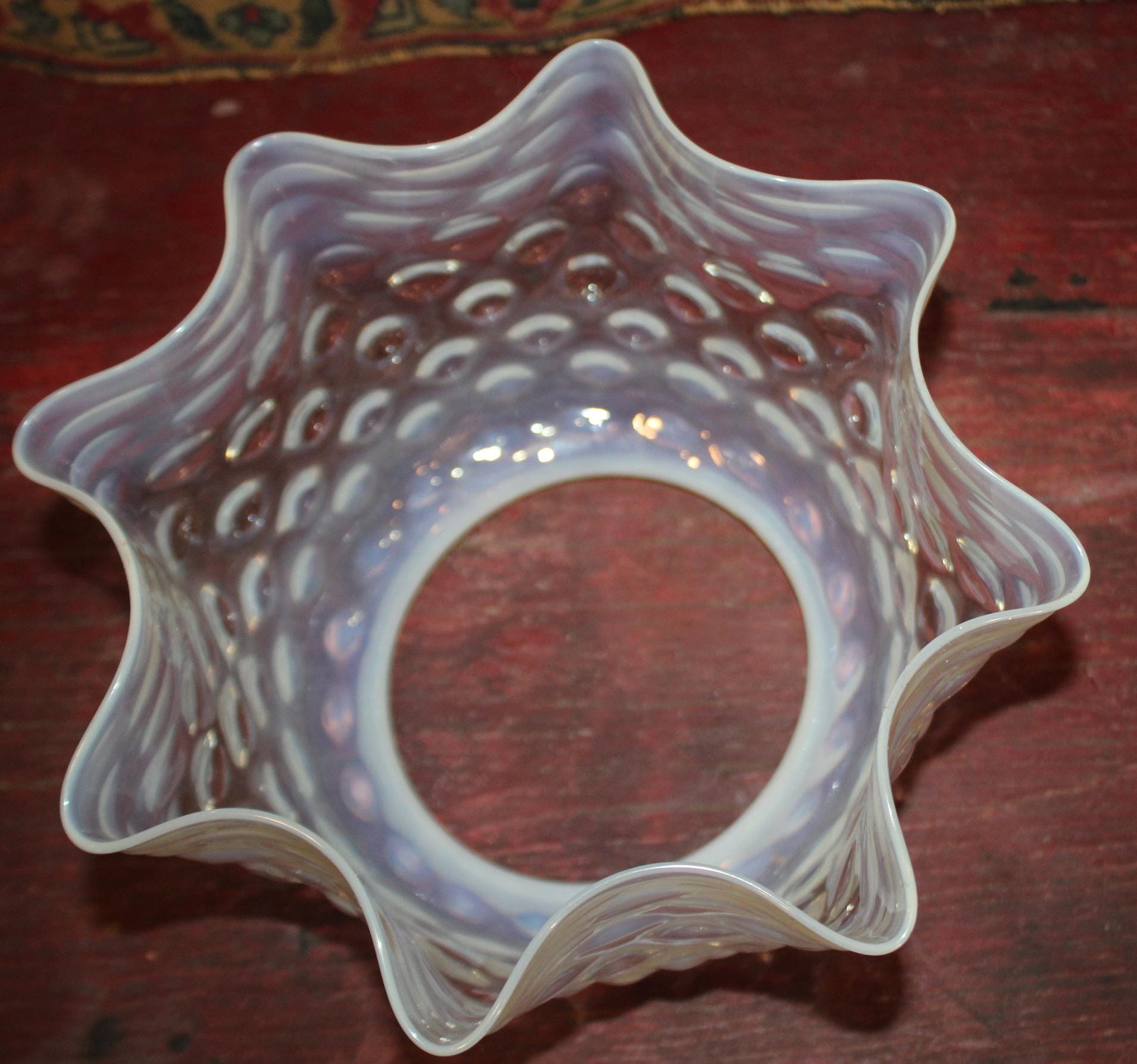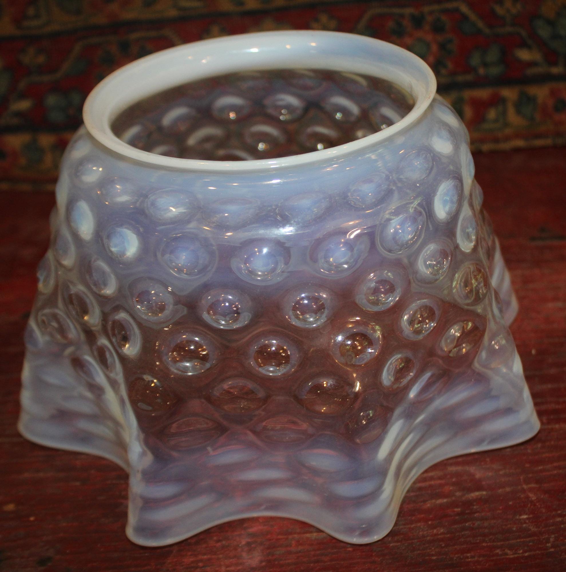This Antique Victorian Opalescent Hobnail Glass Lamp Shade is GORGEOUS- and so delicate! The rim is 4 7/8" in diameter; 5 3/4" deep; the glass flares to 9"; it rings beautifully when dinged; there are no chips or cracks. Please message us if you have any questions- Thanks for looking!