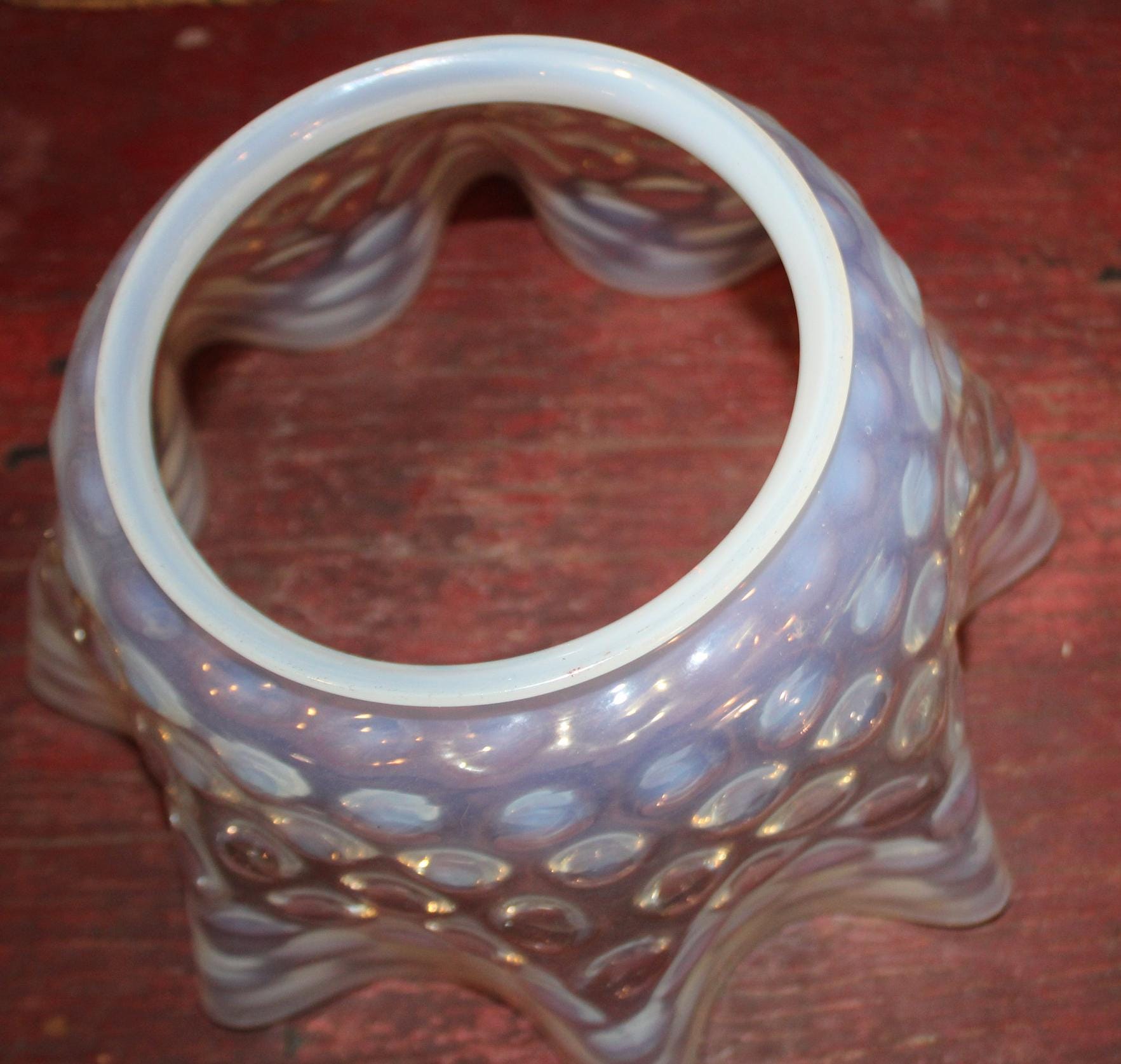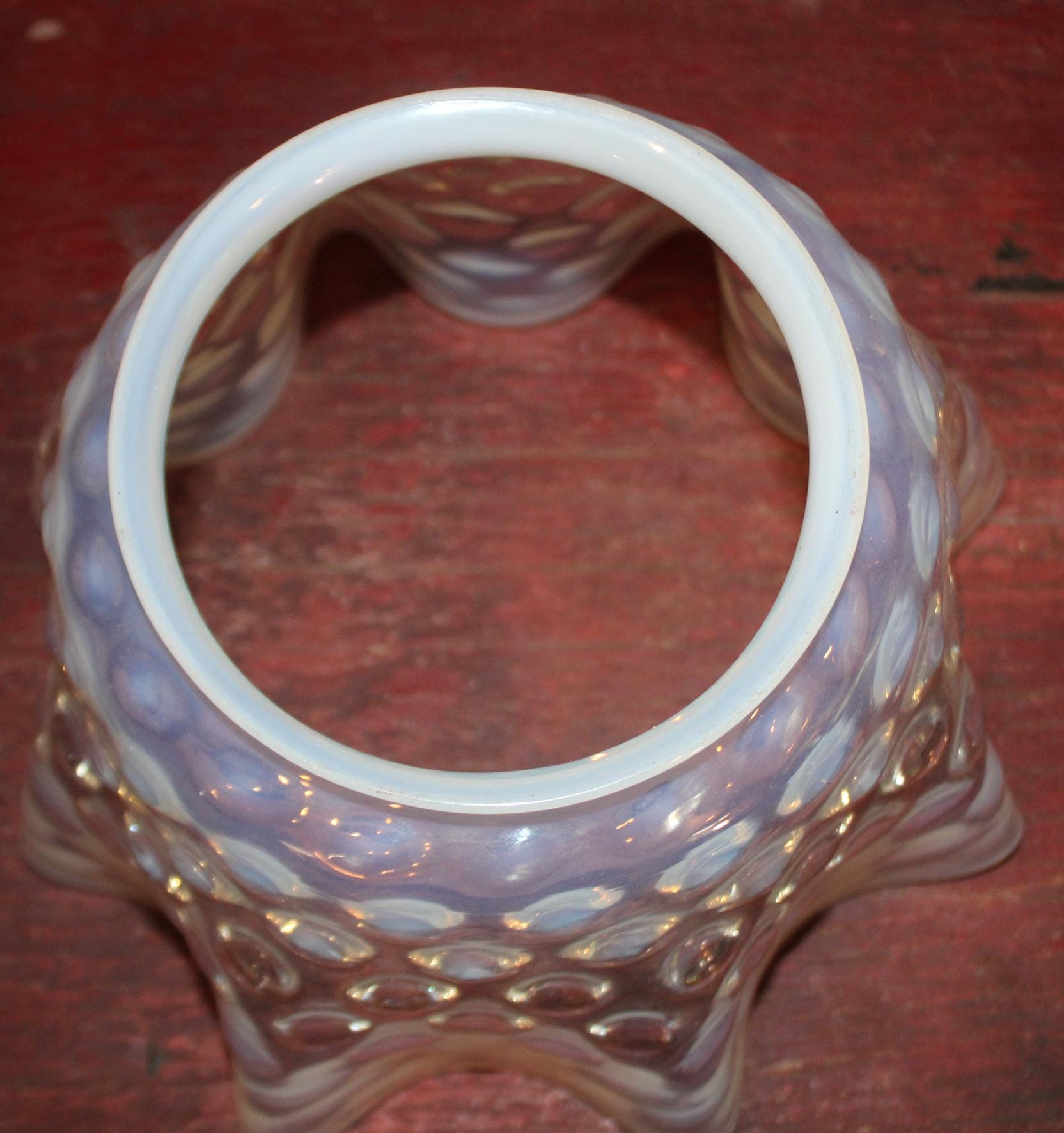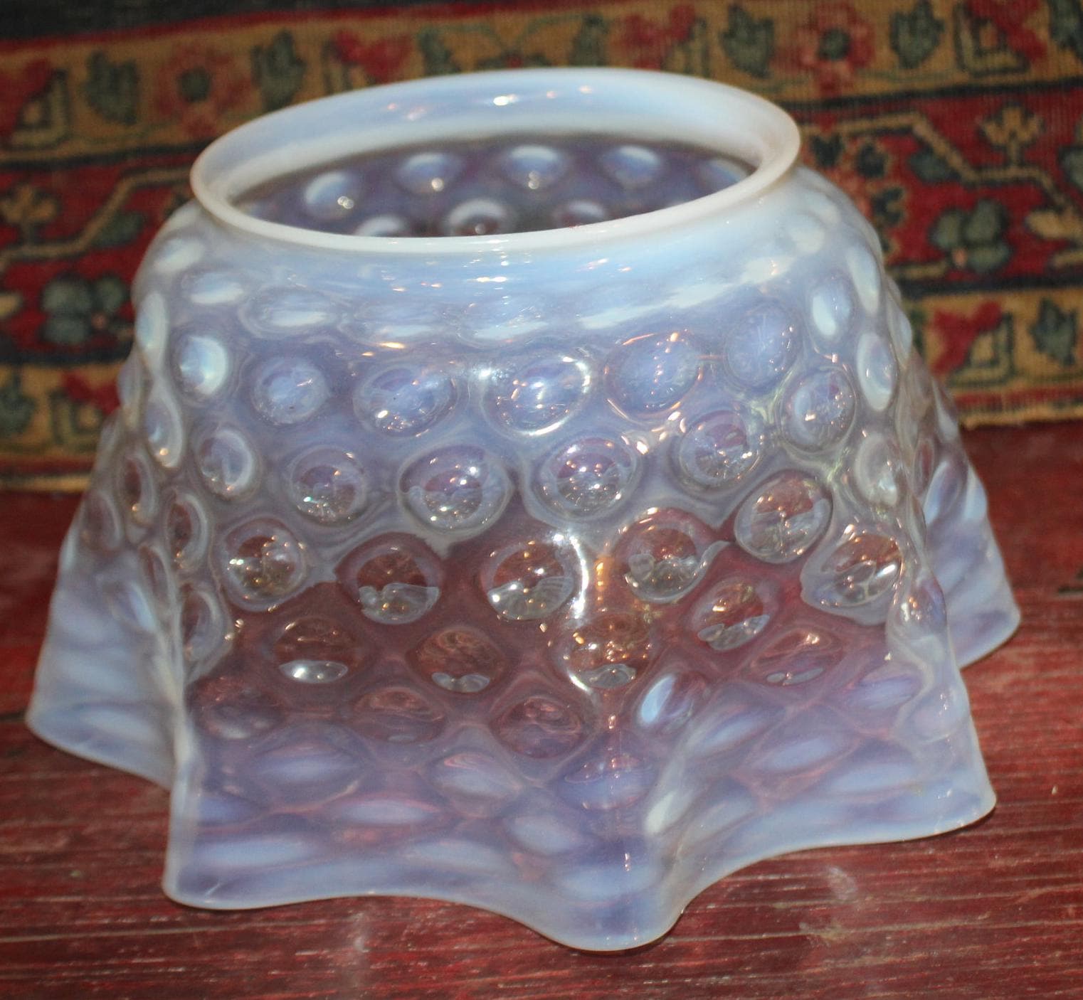 This Antique Victorian Opalescent Hobnail Glass Lamp Shade is GORGEOUS- and so delicate! The rim is 4 7/8" in diameter; 5 3/4" deep; the glass flares to 9"; it rings beautifully when dinged; there are no chips or cracks. Please message us if you have any questions- Thanks for looking!