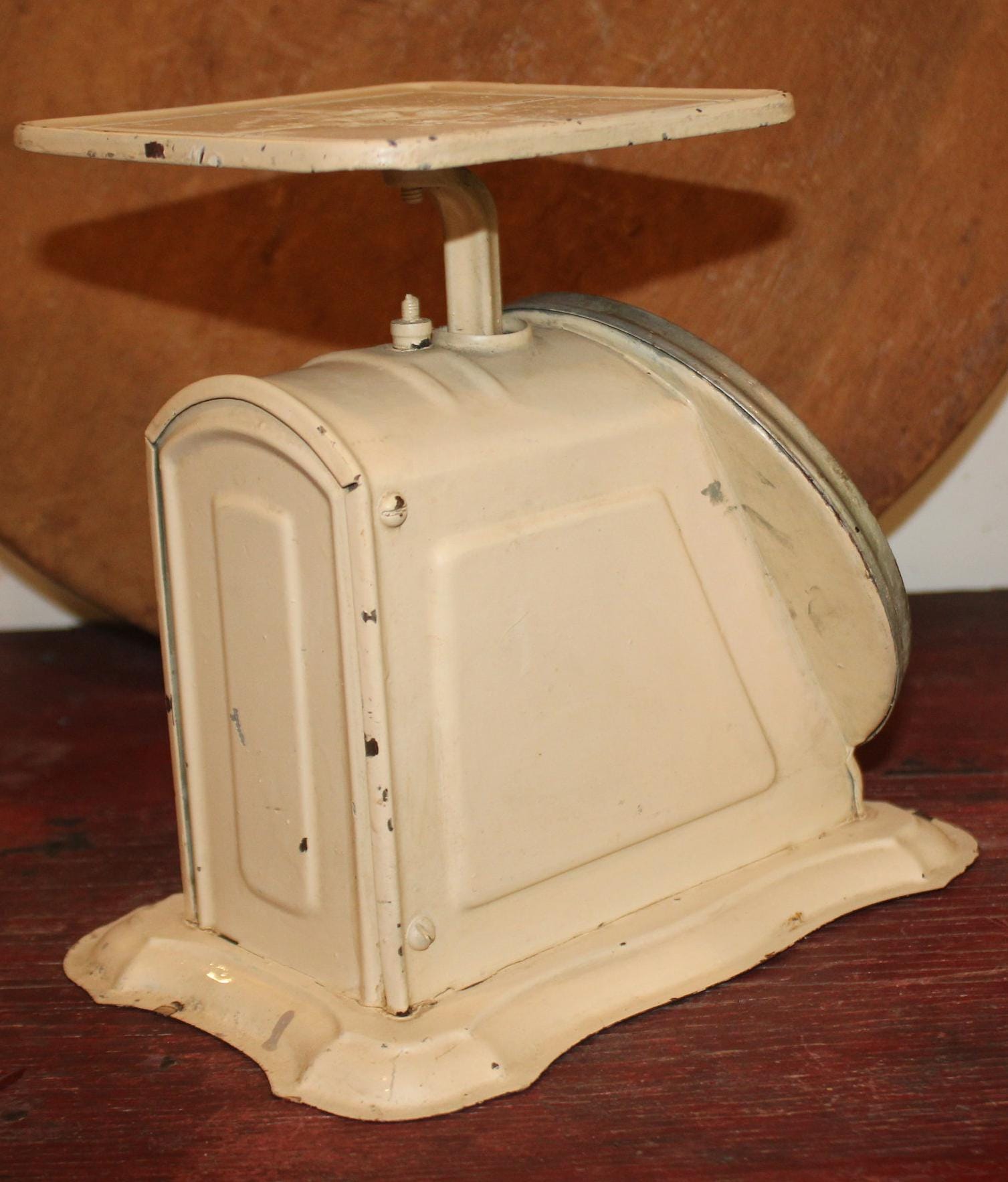 This Antique Landers, Frary, & Clark Columbia Family Scale would look fabulous in your farmhouse kitchen! It is approximately 9.75" x 8.25"x 6" and is in great working condition. It is painted in a lovely cream with the face framed in grey-it has splendid wear and chipping that is reflective of age and use- a very charming scale! Please message us if you have any questions- Thanks for looking!