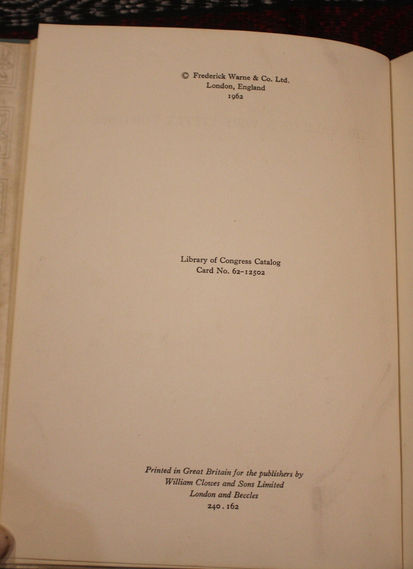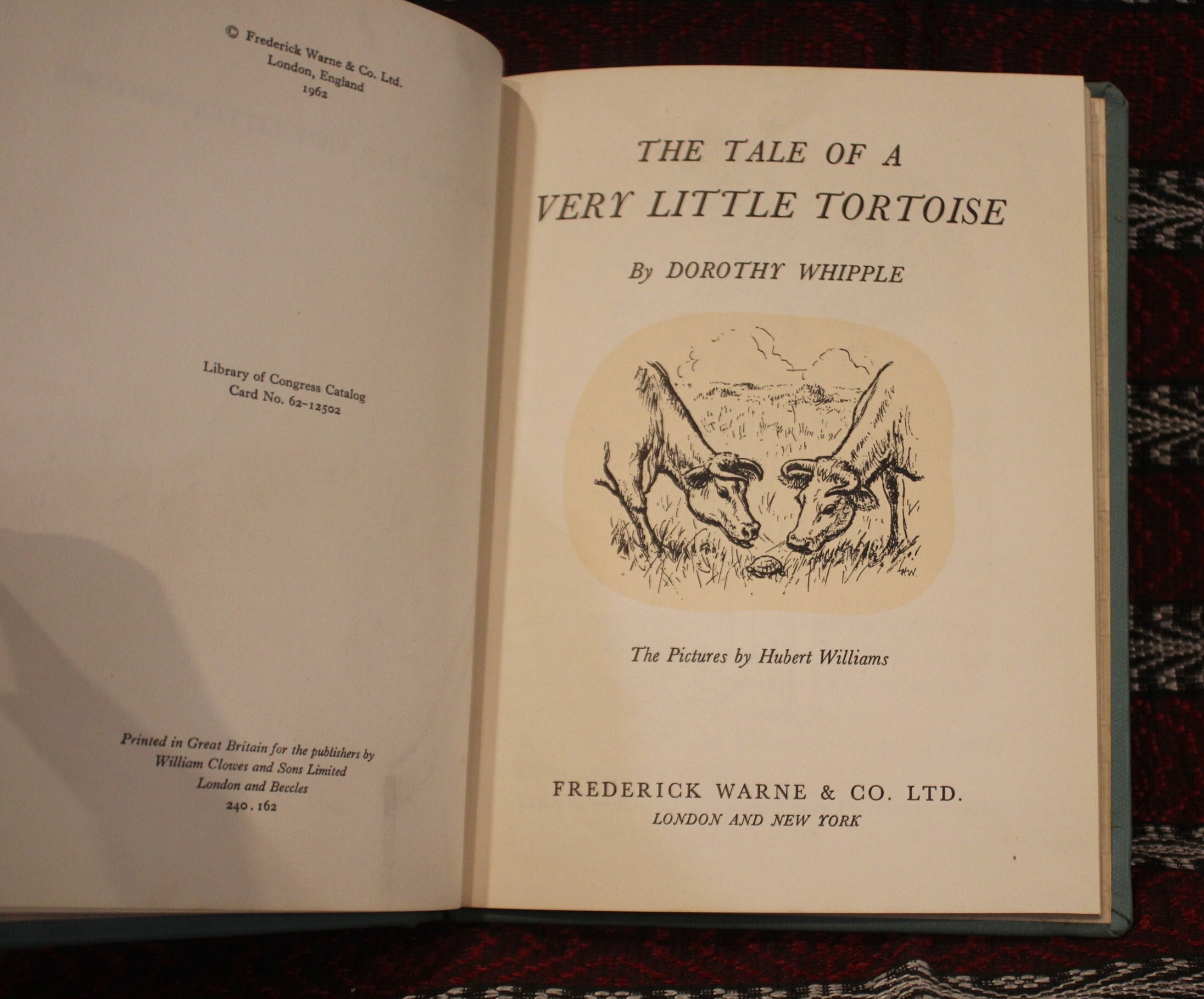 The Tale of a Very Little Tortoise by Dorothy Whipple 1962. Hardcover. Published by Frederick Warne London, England and New York. Clean pages; slight tanning. Tight binding. Pictorial boards are in very good condition. No dust jacket.
