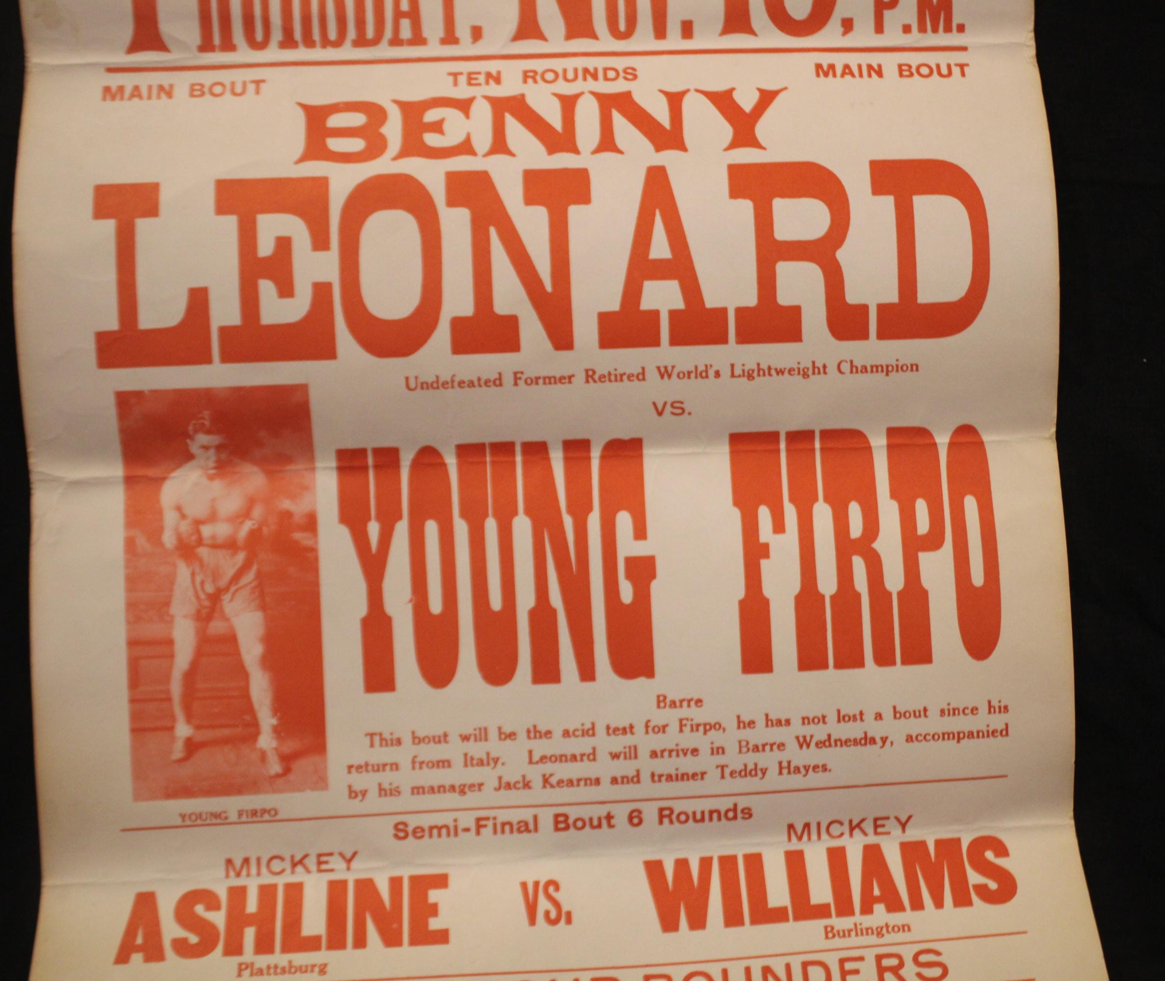 This Boxing Broadside from the 80's would be such a great addition to your sporting decor! Prior to the 40's, the Barre Opera House in Vermont was the location of many gatherings...including boxing- To restore and reopen the Opera House this broadside, featuring the match between Leonard and Firpo, was reproduced and offered for sale in the 80's. The red script is very bright; there is slight tanning to the background. It is 21.75" x 14". Please message us if you have any questions- Thanks for looking!
