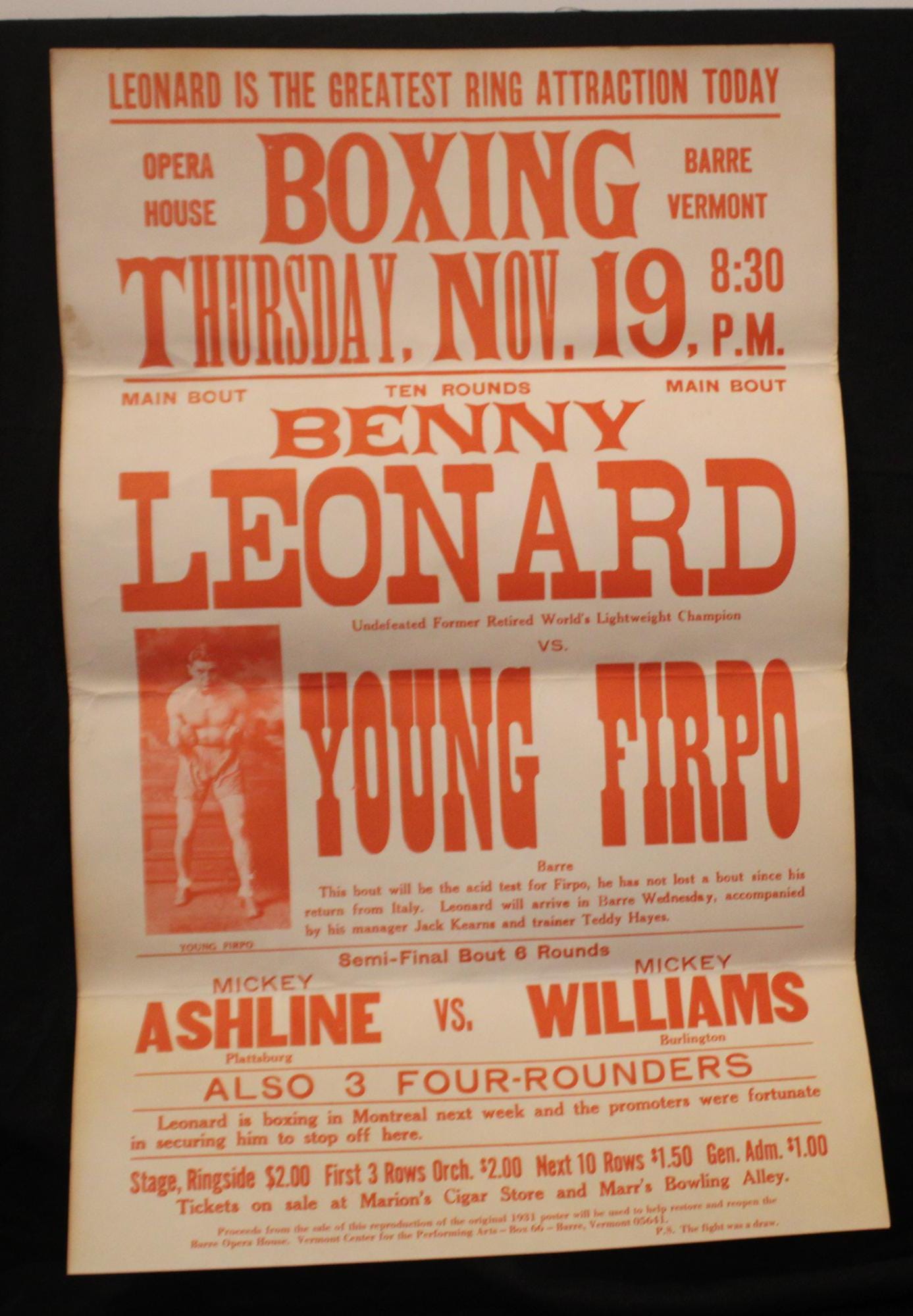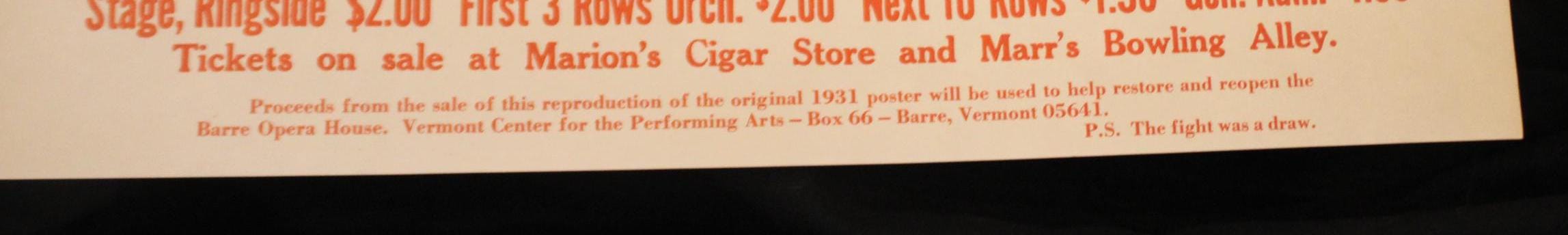 Benny Leonard vs. Young Firpo Boxing Broadside from the 80's to Benefit Barre Opera House- Poster/Wall Art